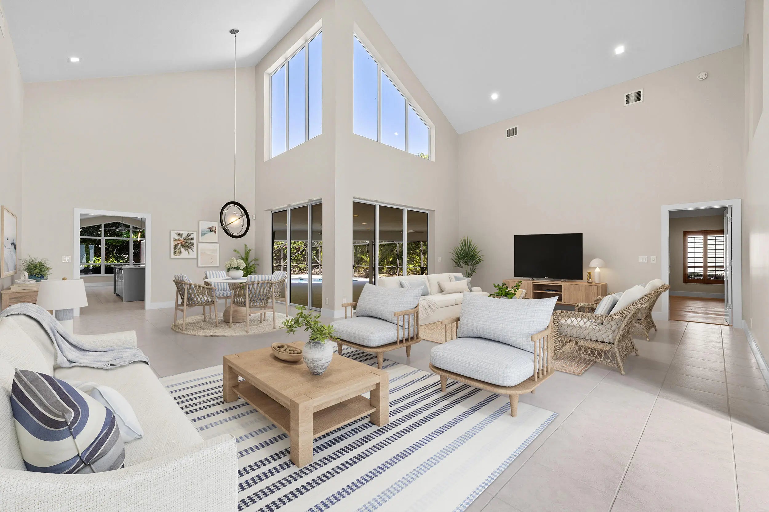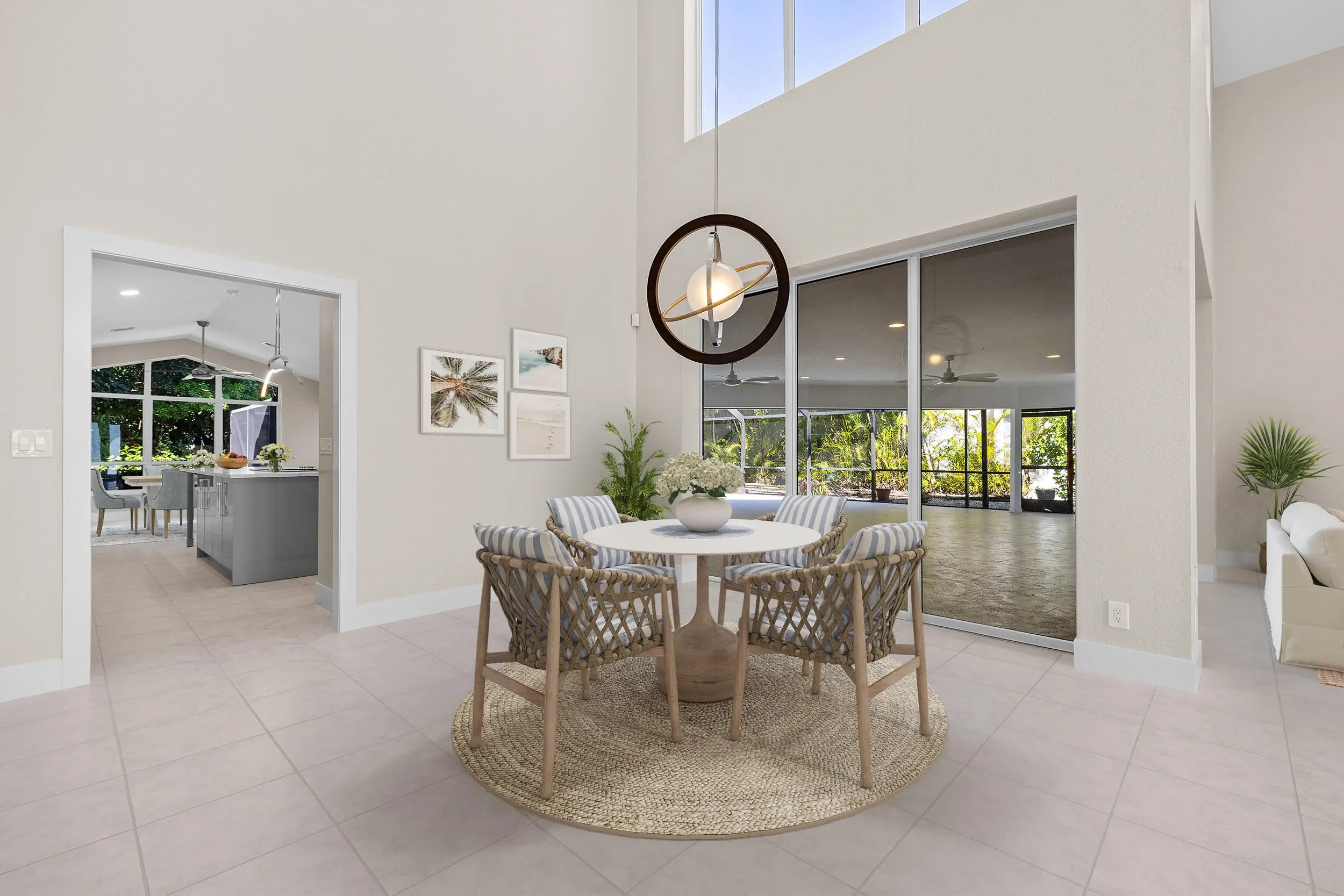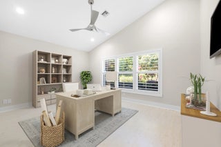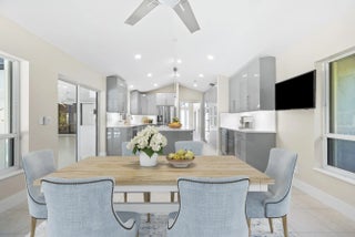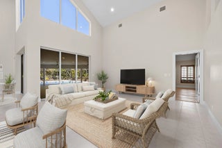 Situated within the gated community of Eastpointe Country Club, this impeccably updated executive residence offers 3,159 square feet of refined living. The home features four bedrooms, including a newly finished media room, along with two full baths and two half baths. A brand-new kitchen with premium appliances anchors the living spaces, complemented by elegant tile and wood flooring. The covered lanai with television and private cabana bath is ideal for entertaining. Complete with hurricane protection, whole-house generator, newer A/C systems, and a two-car plus golf cart garage, this turnkey home offers exceptional club living in Palm Beach Gardens.