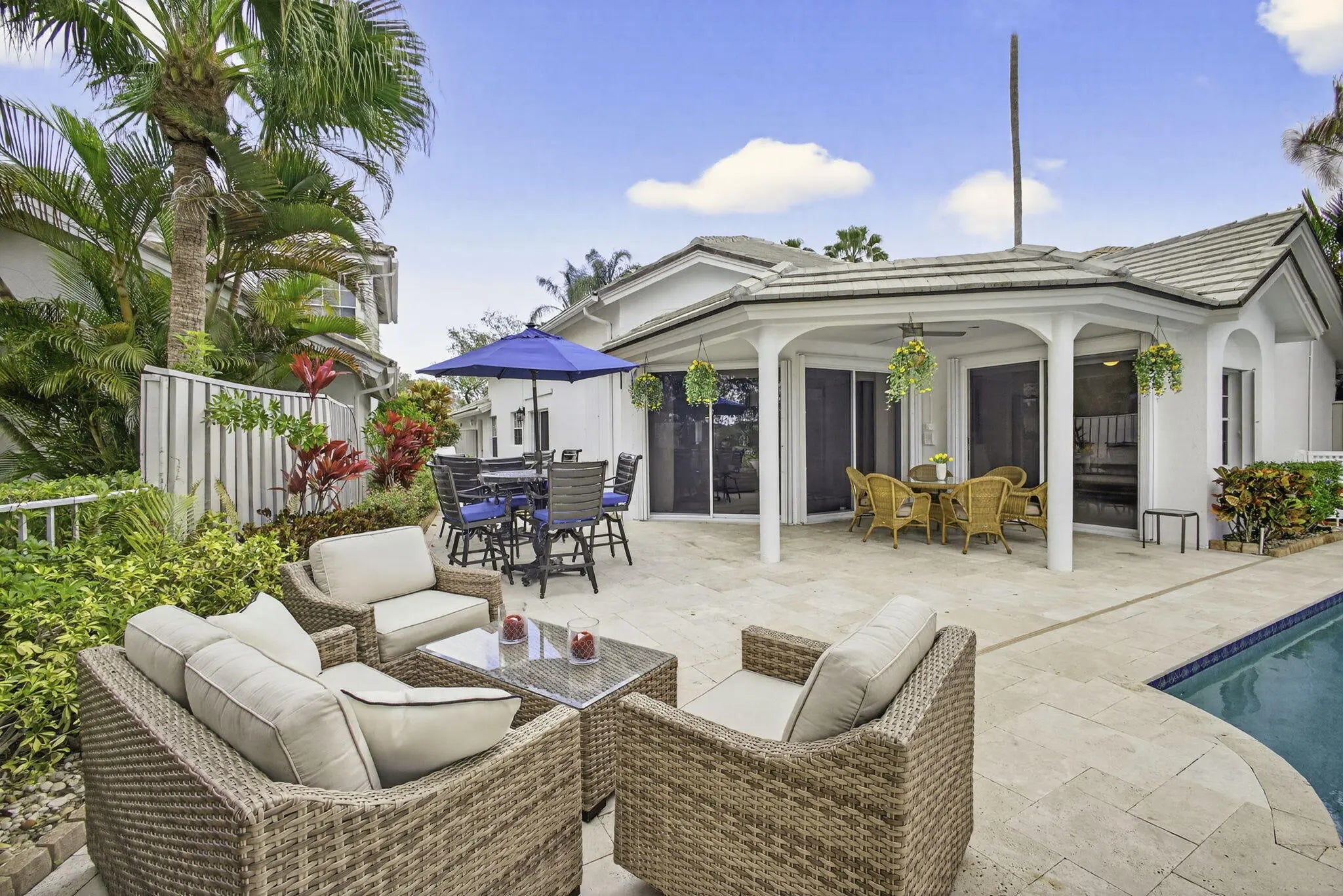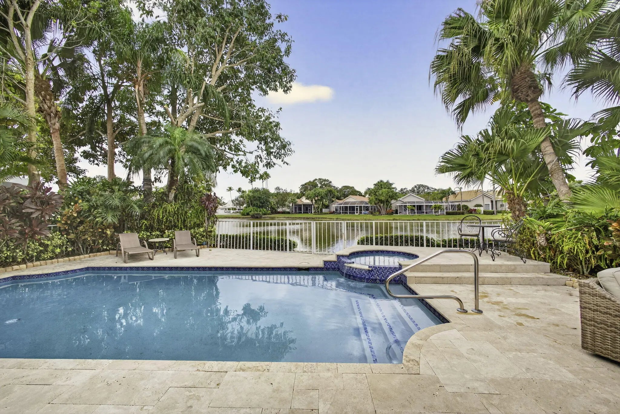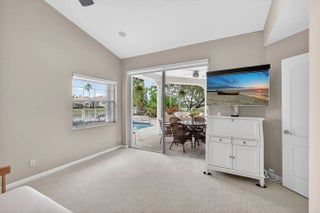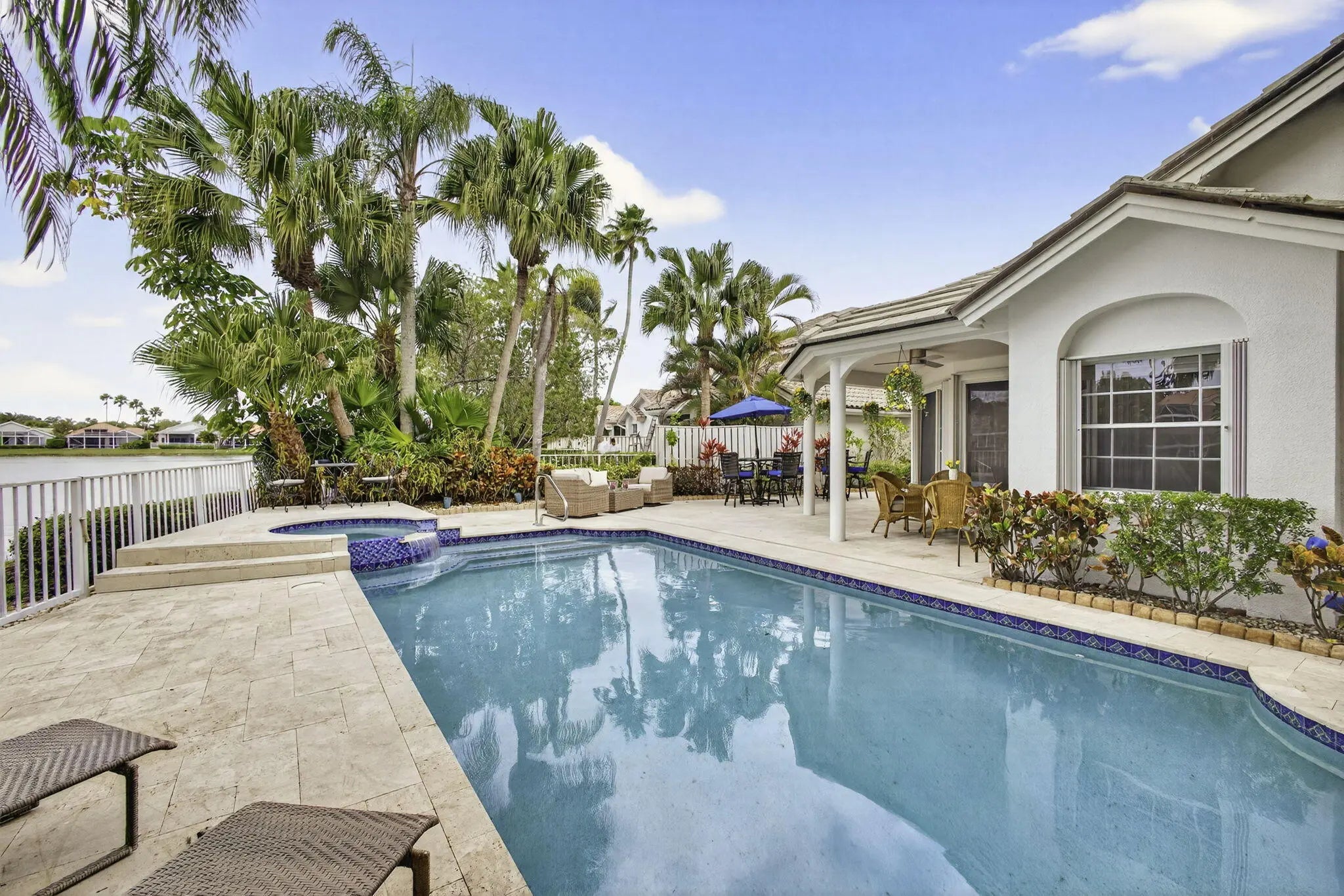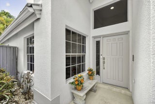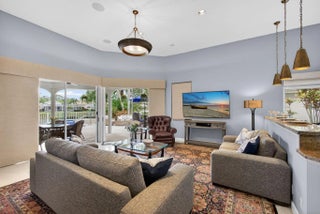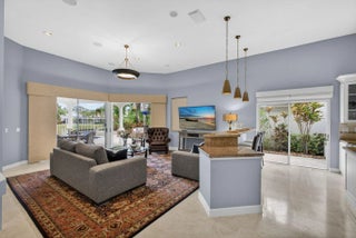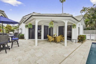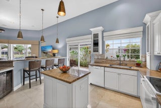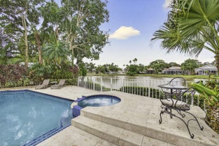 PGA National living at its finest. Upon entry, you're welcomed by an open floorplan, soaring ceilings, and beautiful custom built-ins that create an inviting yet refined atmosphere. This thoughtfully designed home features three bedrooms, two bathrooms, custom window treatments, a formal dining area, soft-closing kitchen cabinetry, travertine flooring in the main living areas. Step outside to your private backyard retreat--fully fenced and designed for entertaining. Enjoy a built-in Lynx BBQ grill, heated pool and spa, lush tropical landscaping, and elegant travertine pool decking. Take in tranquil water views and stunning sunset skies from your own outdoor oasis. Additional highlights include accordion shutters, central vacuum, and the comfort of living