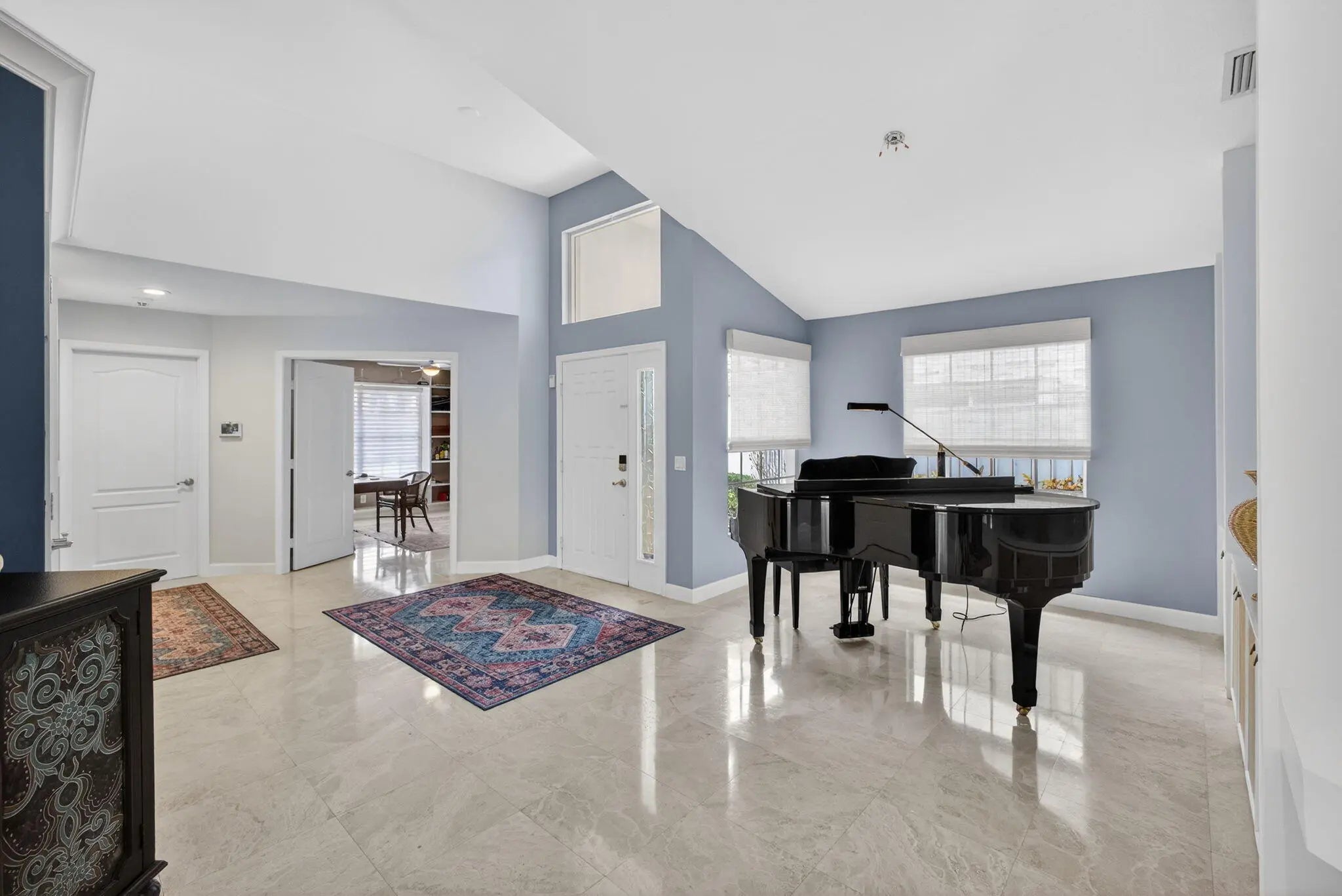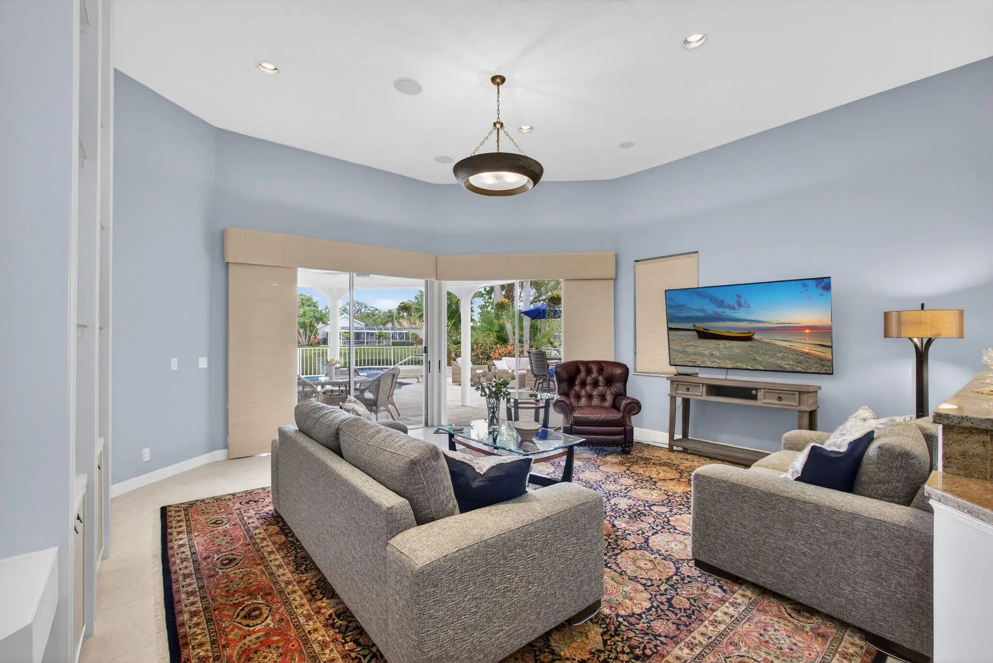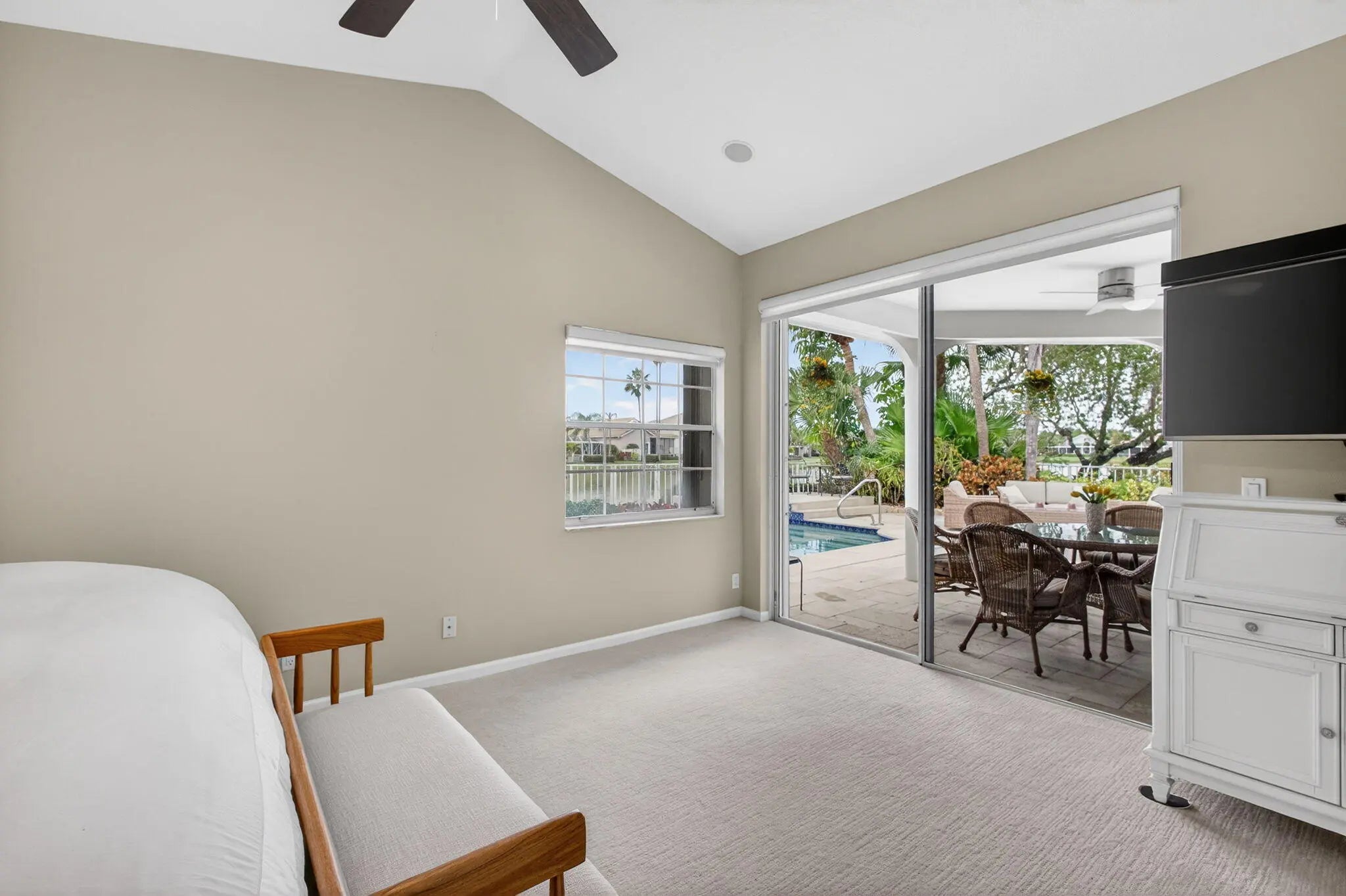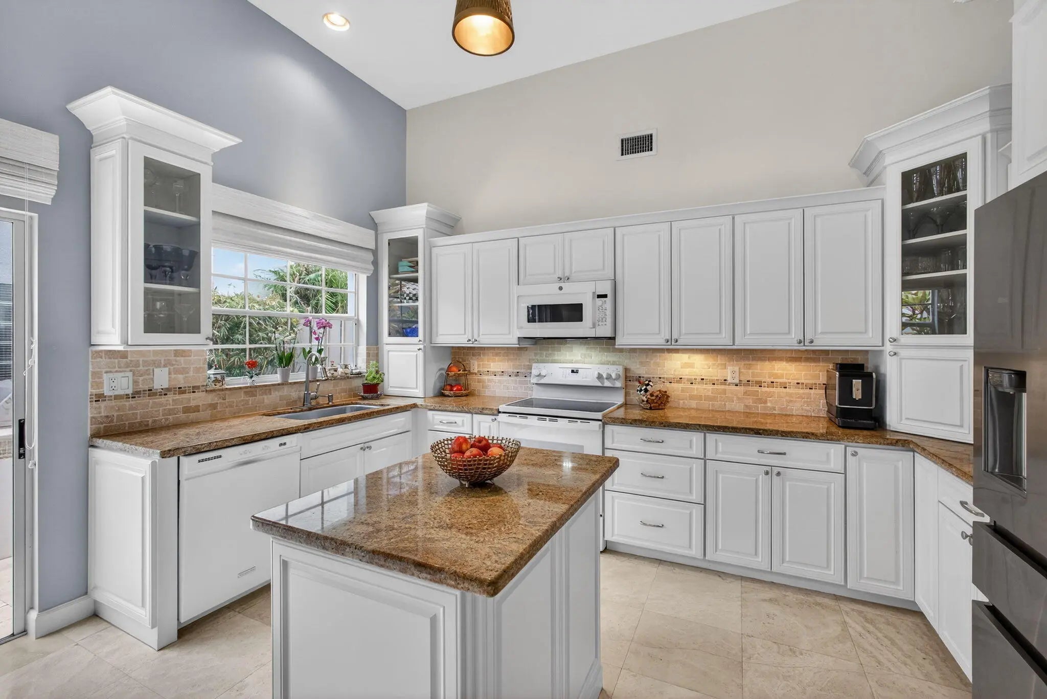 PGA National living at its finest. Upon entry, you're welcomed by an open floorplan, soaring ceilings, and beautiful custom built-ins that create an inviting yet refined atmosphere. This thoughtfully designed home features three bedrooms, two bathrooms, custom window treatments, a formal dining area, soft-closing kitchen cabinetry, travertine flooring in the main living areas. Step outside to your private backyard retreat--fully fenced and designed for entertaining. Enjoy a built-in Lynx BBQ grill, heated pool and spa, lush tropical landscaping, and elegant travertine pool decking. Take in tranquil water views and stunning sunset skies from your own outdoor oasis. Additional highlights include accordion shutters, central vacuum, and the comfort of living