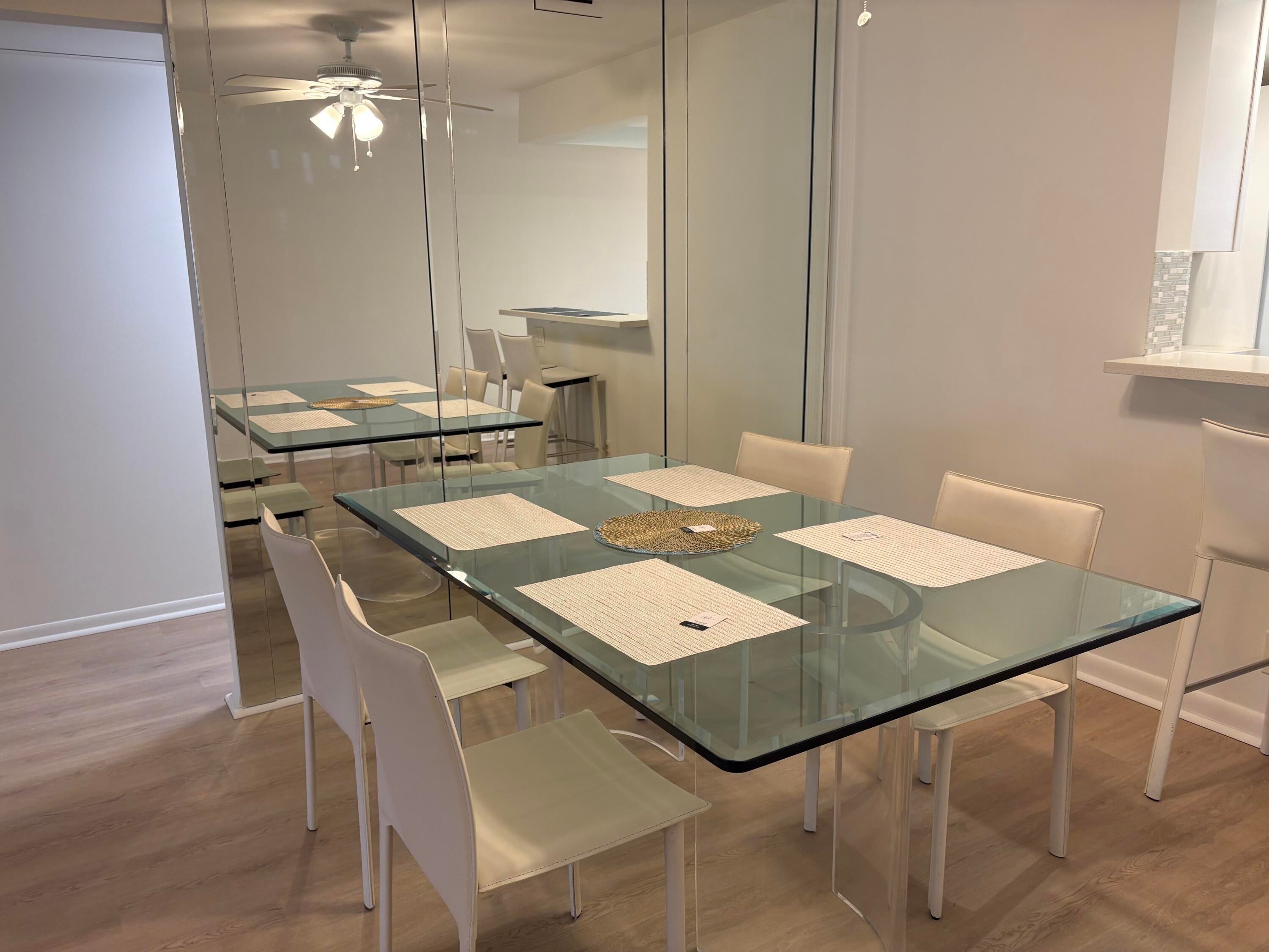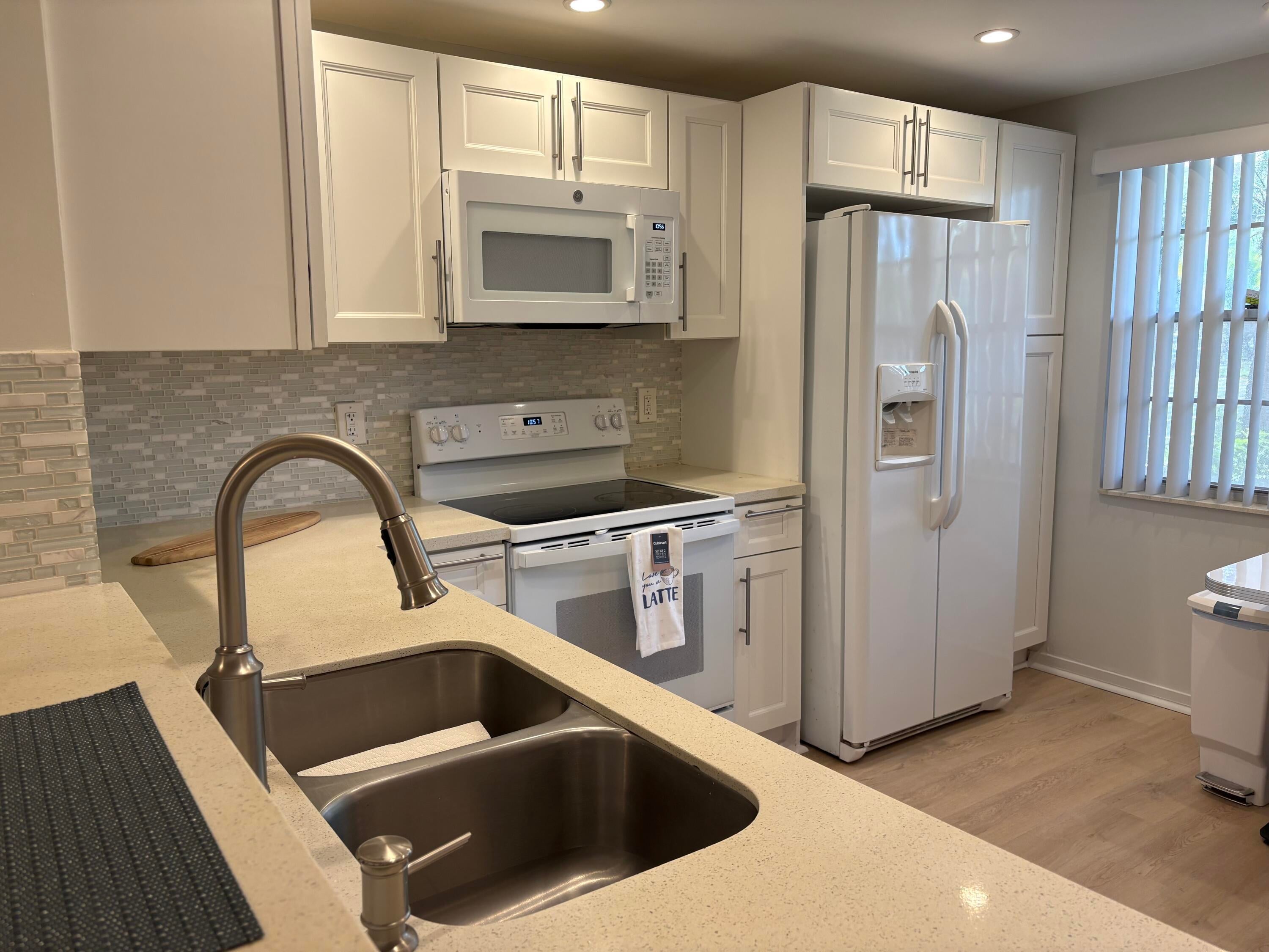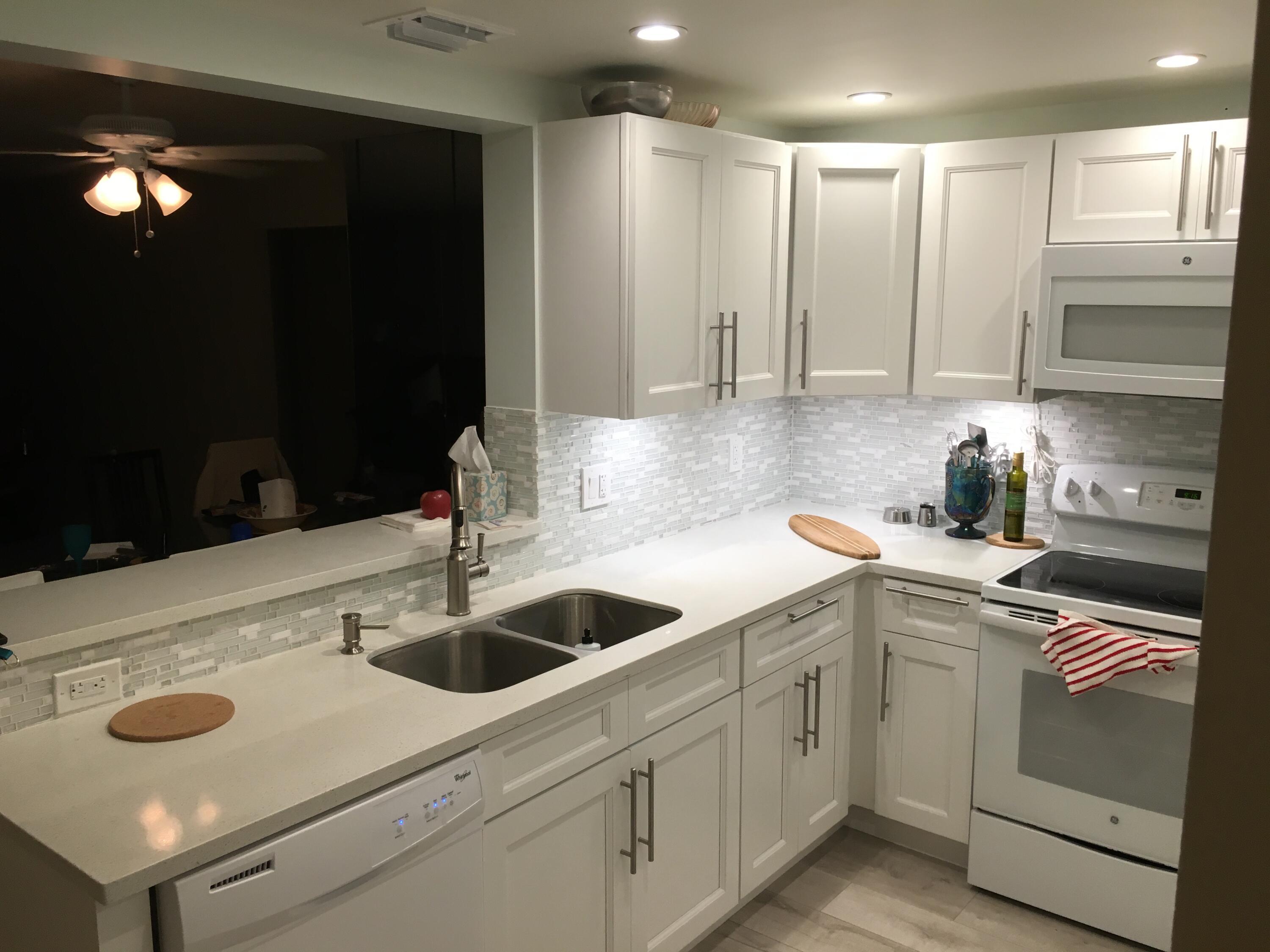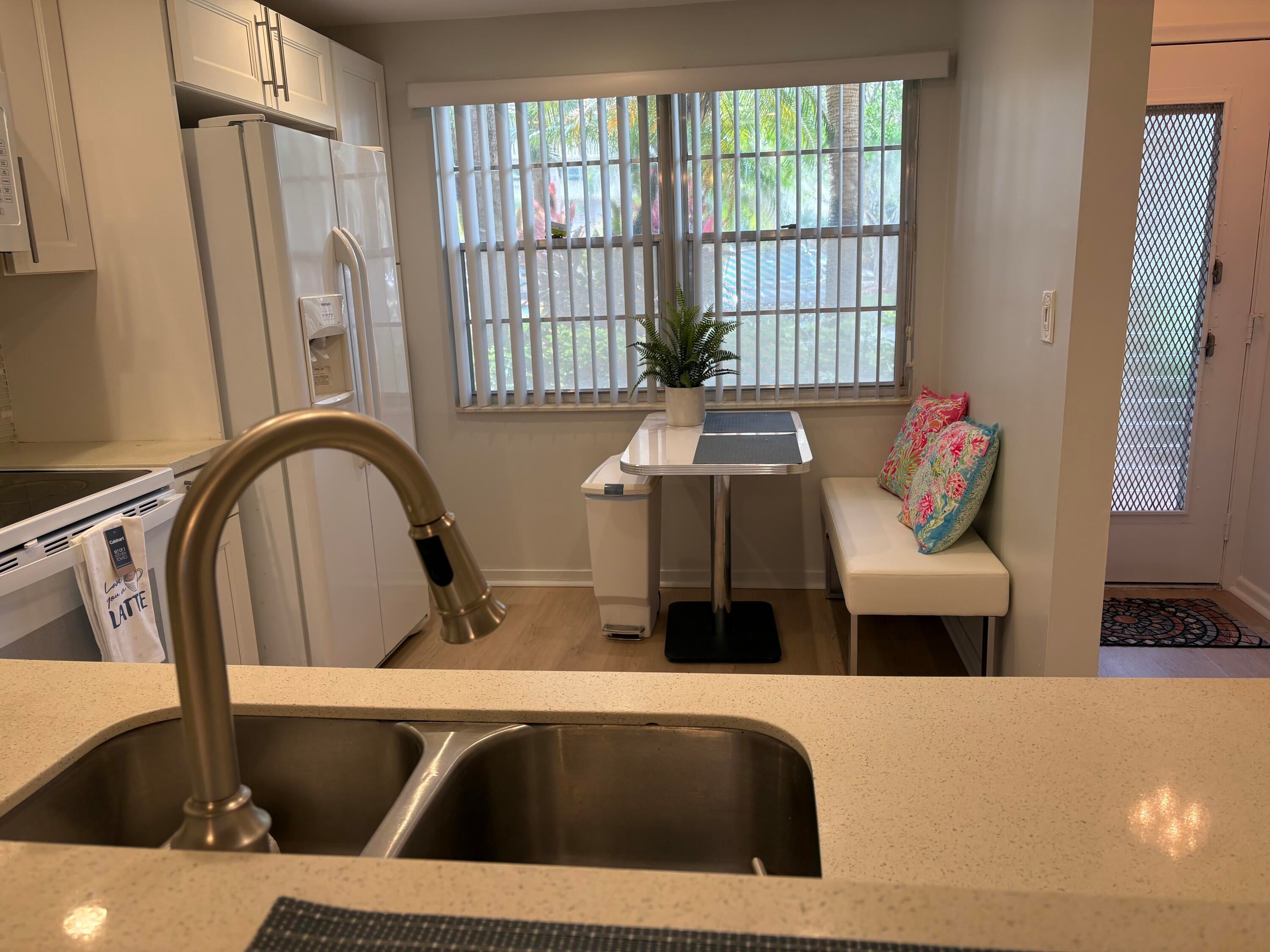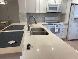 Sasional Rental Welcome home to this beautiful SUNNY 2 bed/2bath GROUND FLOOR condo, with parking spot nearby front door for easy access from shopping, etc. Steps bus and pool Just painted,new laminate like flooring throughout.Remodeled kitchen features a bar, custom built high-end white wood dovetailed cabinetry with soft-close doors and drawers, pull-outs, crystal clean engineered white quartz counter tops, Kohler high-line faucet, newer dishwasher and recessed lighting! Enjoy a custom made white and steel diner table, great for breakfast, coffee or dessert! The morning sun pours through front window with a palm tree view from the east facing kitchen, and long beautiful sunsets can be viewed on the back patio, which faces west, and you can walk direc