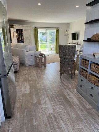 Desirable first floor unit overlooking the golf course from the large covered/screened patio. Enjoy the quiet surroundings in this completely updated, open concept 1/1. Custom wood shaker cabinets offer loads of storage space. high end appliance package and built in microwave add to the sleek look and feel.Walk-in glass free shower, large vanity and extra large space in the main bath. Walk in closet with loads of space and two outside storage closets. Enjoy the pool, golf, pickleball and clubhouse. Loads of nearby shopping, beaches and restaurants. Offered with an option to include quality furnishings including a Martha Stewart, shabby chic pullout sofa bed. This is a must see!