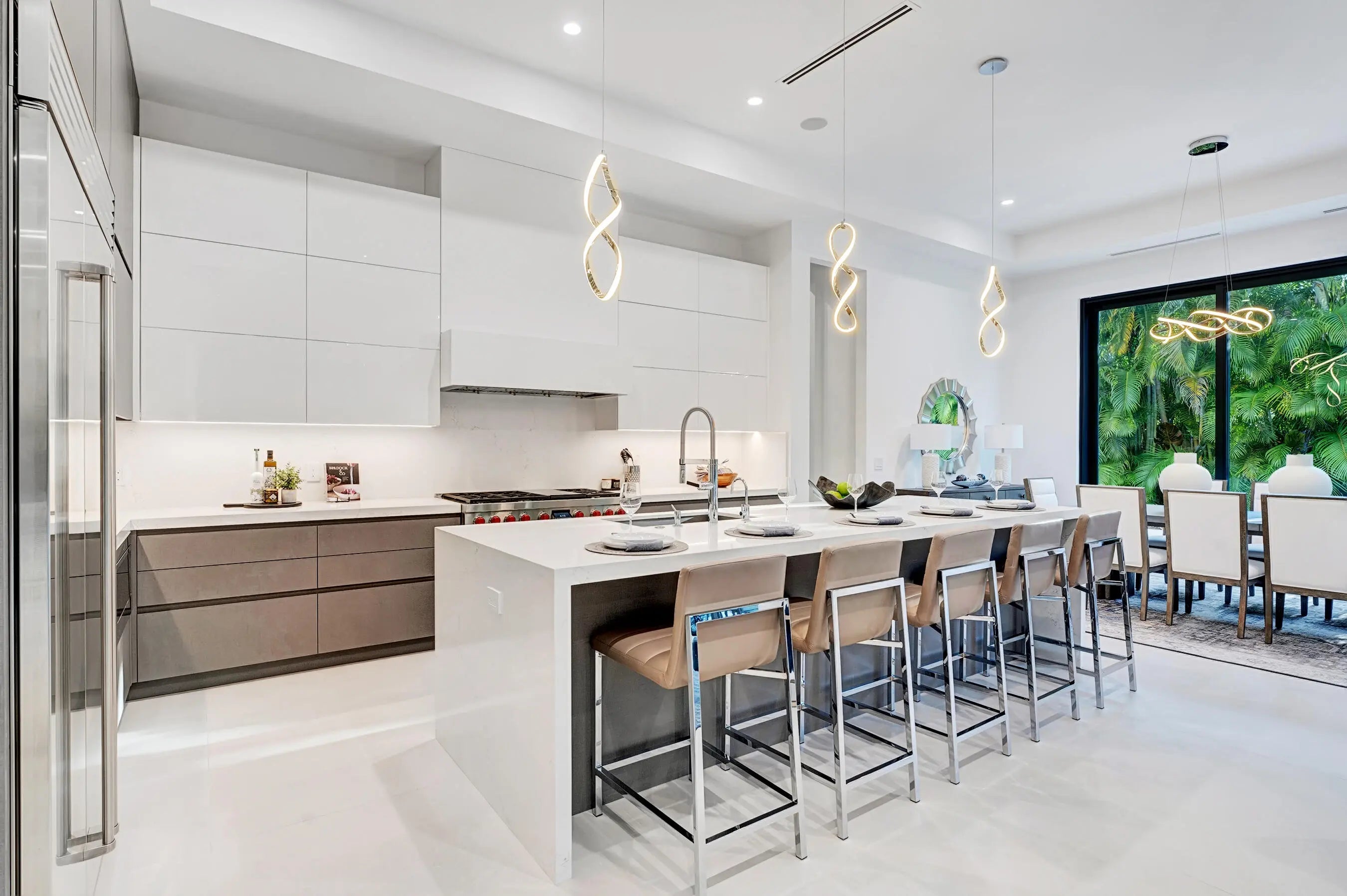 Indulge in the art of exquisite living, just a whisper away from the chic boutiques of Mizner Park and the vibrant pulse of Downtown Boca! This brand-new residence presents a sophisticated twist on Boca Villas living, where every detail exudes effortless elegance and playful charm. Imagine a sprawling floor plan gracefully unfolding around a breathtaking, oversized kitchen, a culinary masterpiece appointed with coveted Wolf and Sub-Zero appliances. From this epicurean haven, step into your own private tropical sanctuary, boasting a sleek marble-clad pool deck, a dazzling saltwater pool that beckons for leisurely dips, and abundant space to unwind or host dazzling soirees.A beautifully appointed first-floor suite offers delightful versatility - a serene haven for cherished guests or