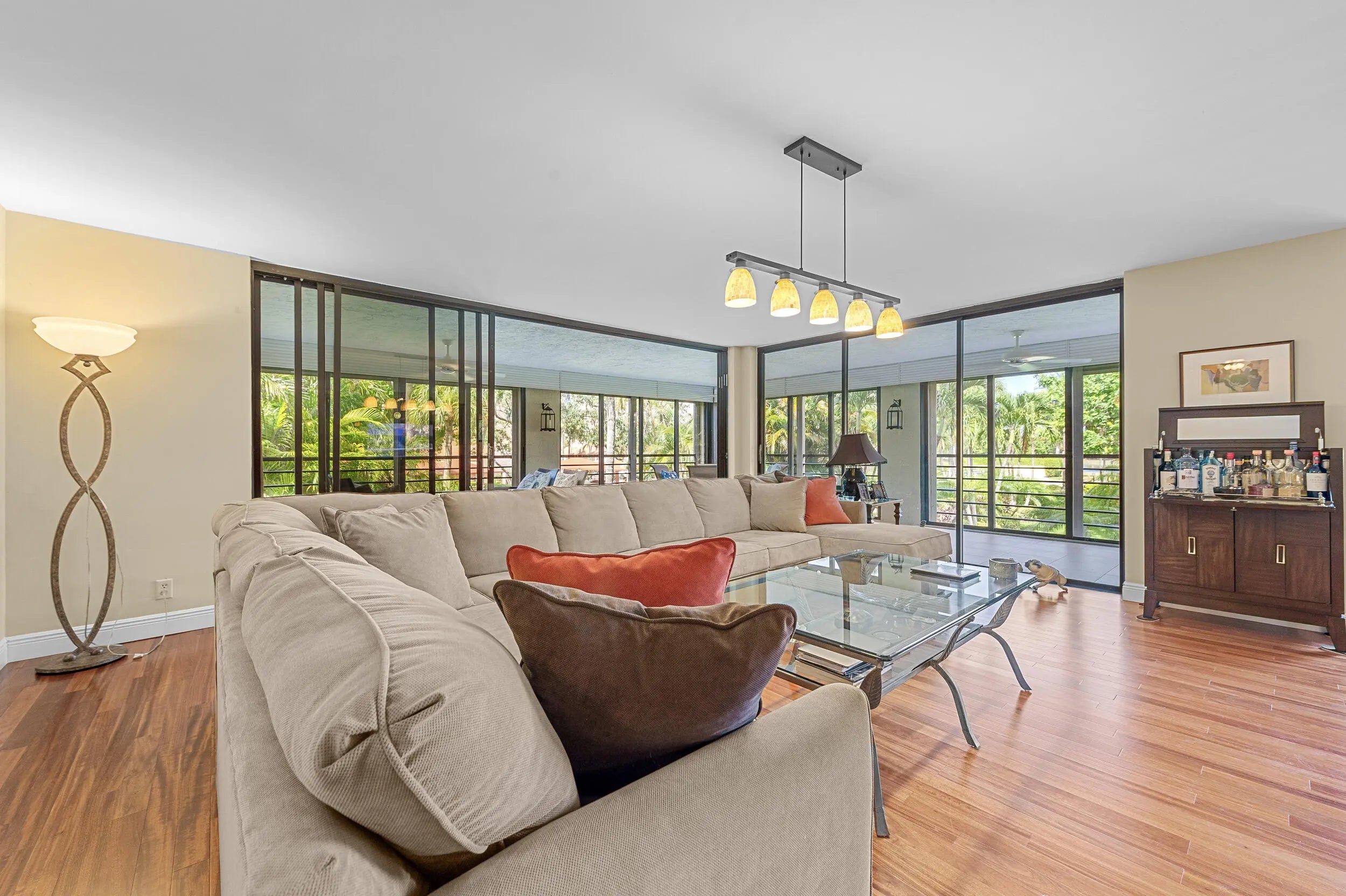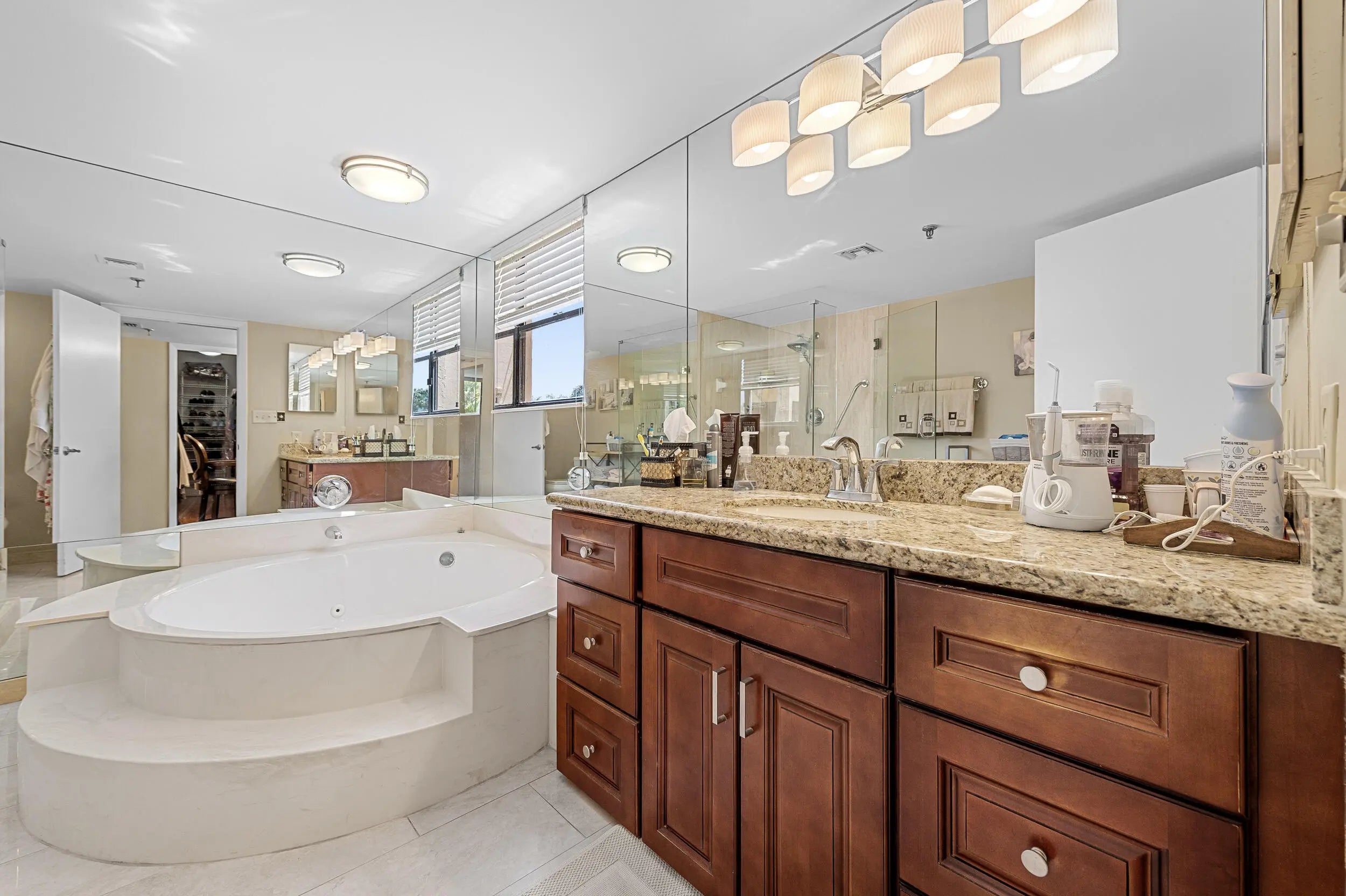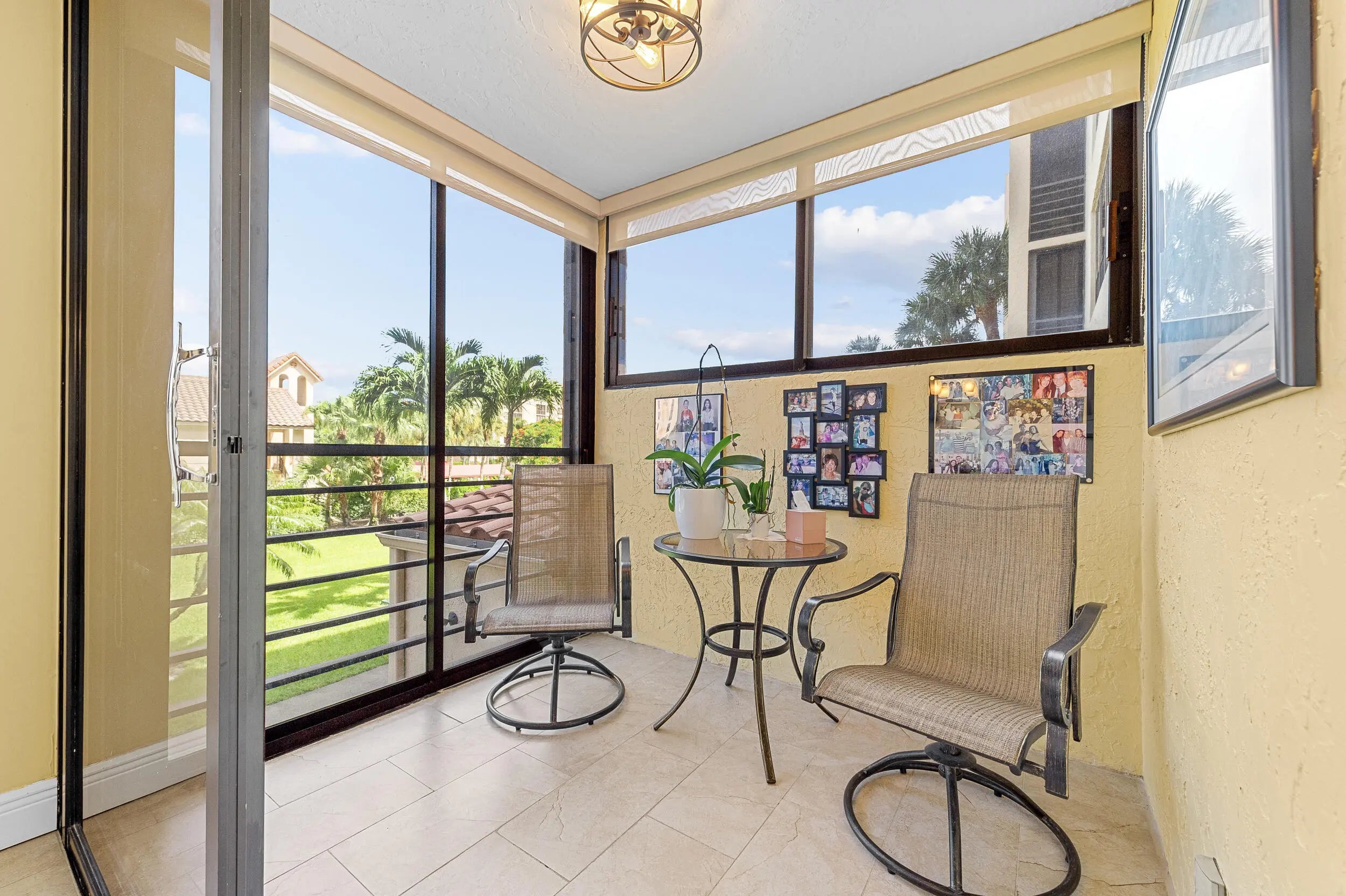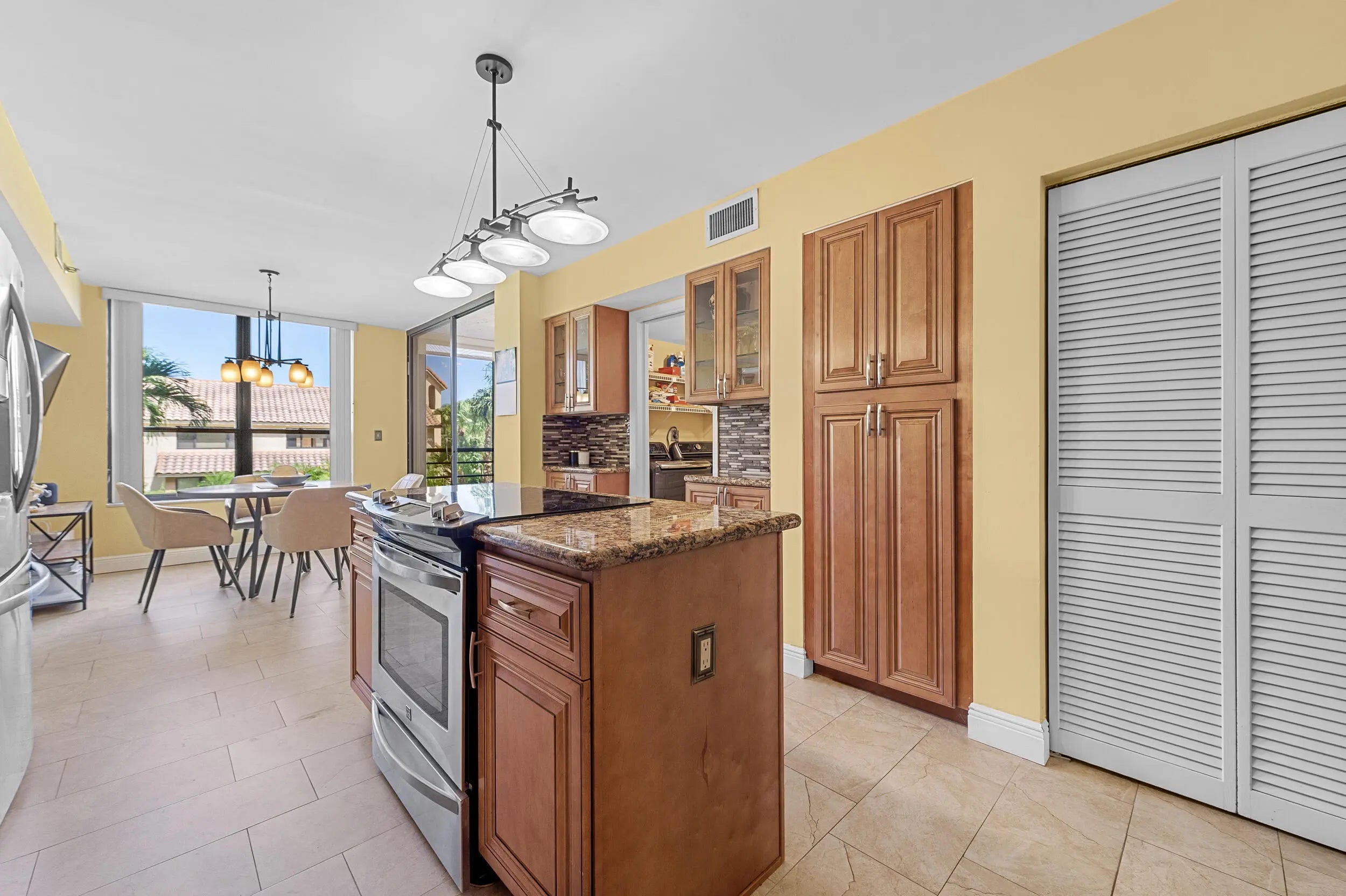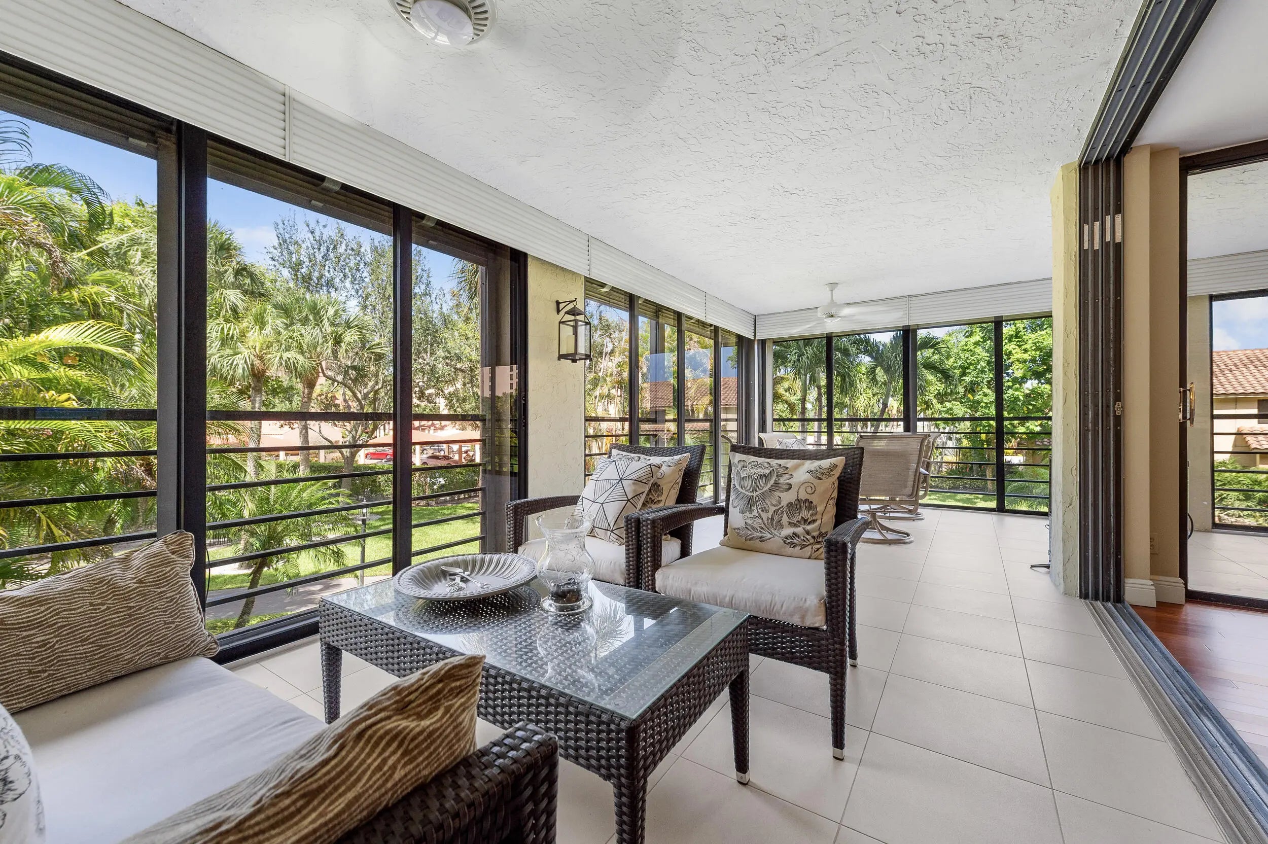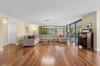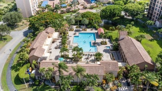 Spacious 3BR/2.5BA condo in the Promenade with the community's largest floor plan! Enjoy tropical garden views from the oversized enclosed terrace, just steps from the clubhouse and pool. Features include wood & laminate floors, smooth ceilings, and a versatile den/3rd bedroom with Murphy bed. The eat-in kitchen offers granite counters, wood cabinetry, stainless steel appliances, walk-in pantry, and pull-out drawers. Primary suite has 2 walk-in closets and an updated bath with dual sinks, vanity, soaking tub & separate shower. Upgrades include newer appliances, 2 ACs, brand-new water heater, updated baths, and laundry with utility sink. Two assigned parking spaces, extra storage, and recent building updates complete this must-see home!