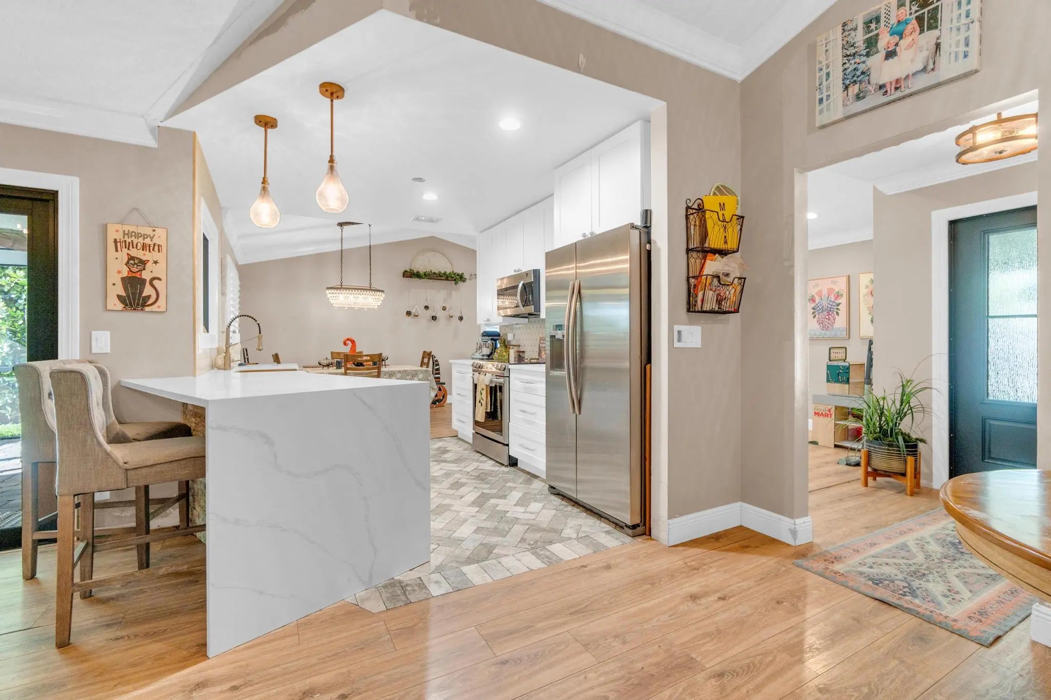 A beautiful lakefront 3 bedroom, 2-bathroom home in the desirable community of Boca Winds! With its impact windows and doors for peace of mind. Features include tile and wood laminate flooring, cathedral ceilings, and a welcoming foyer. The primary suite offers a walk-in closet and private bath, while the stack bedroom layout provides space and privacy. Enjoy a paver patio overlooking the lake, a fenced yard, and wiring for a jacuzzi/hot tub. Additional highlights include a washer and dryer, electric water heater, smoke detectors, and A/C from Sept. 2020. Roof is 2002. This home blends comfort, security, and beautiful water views in a sought-after location.