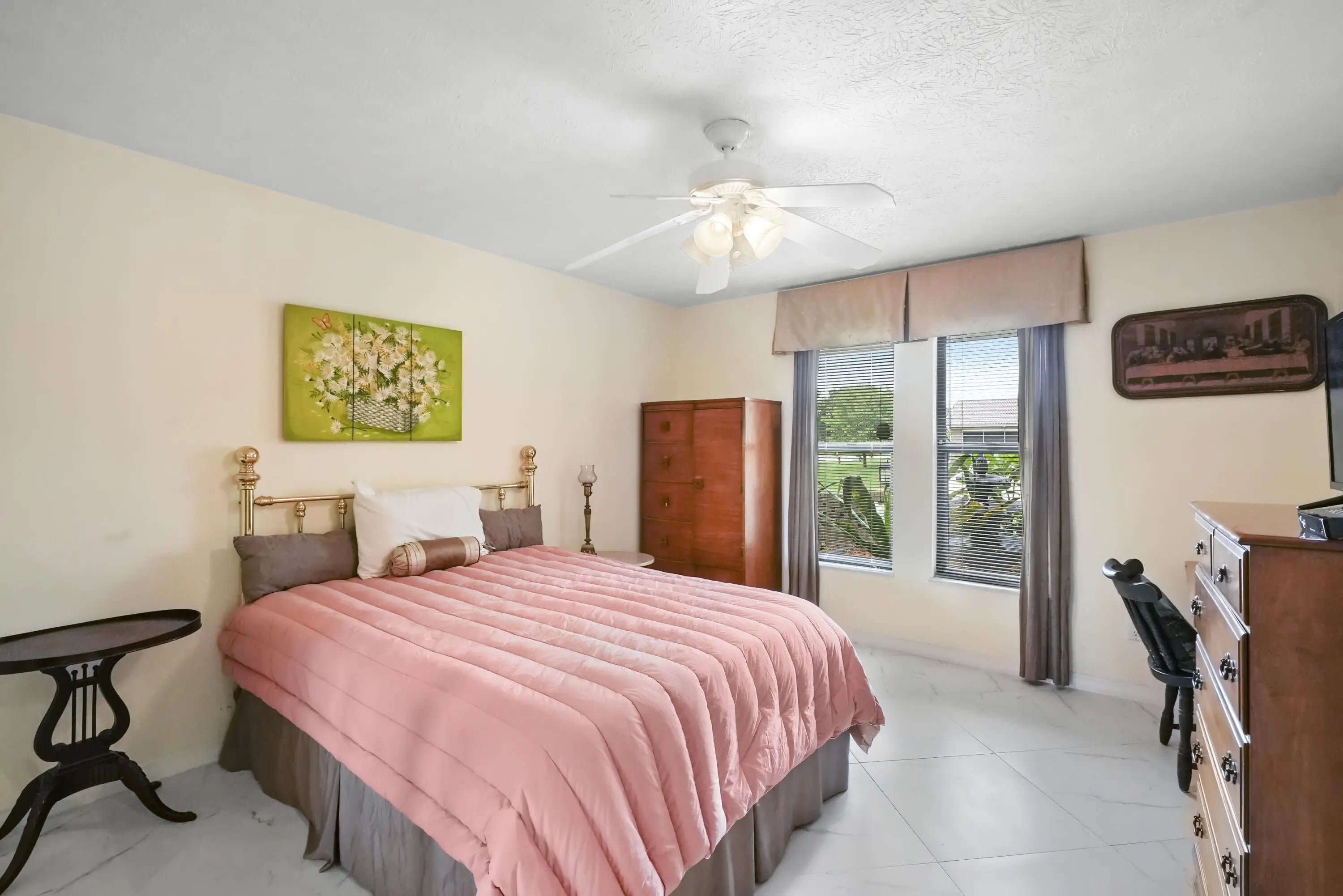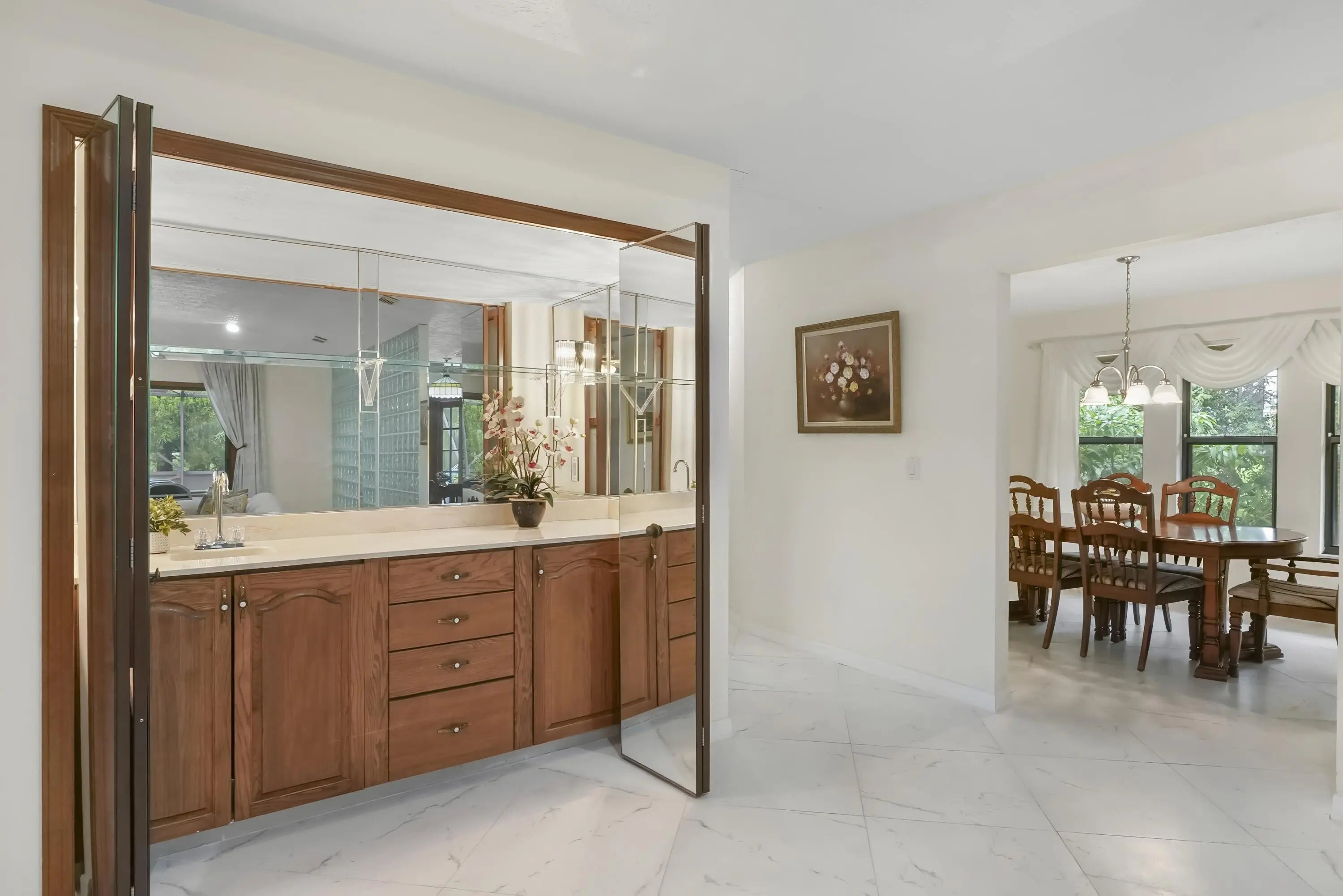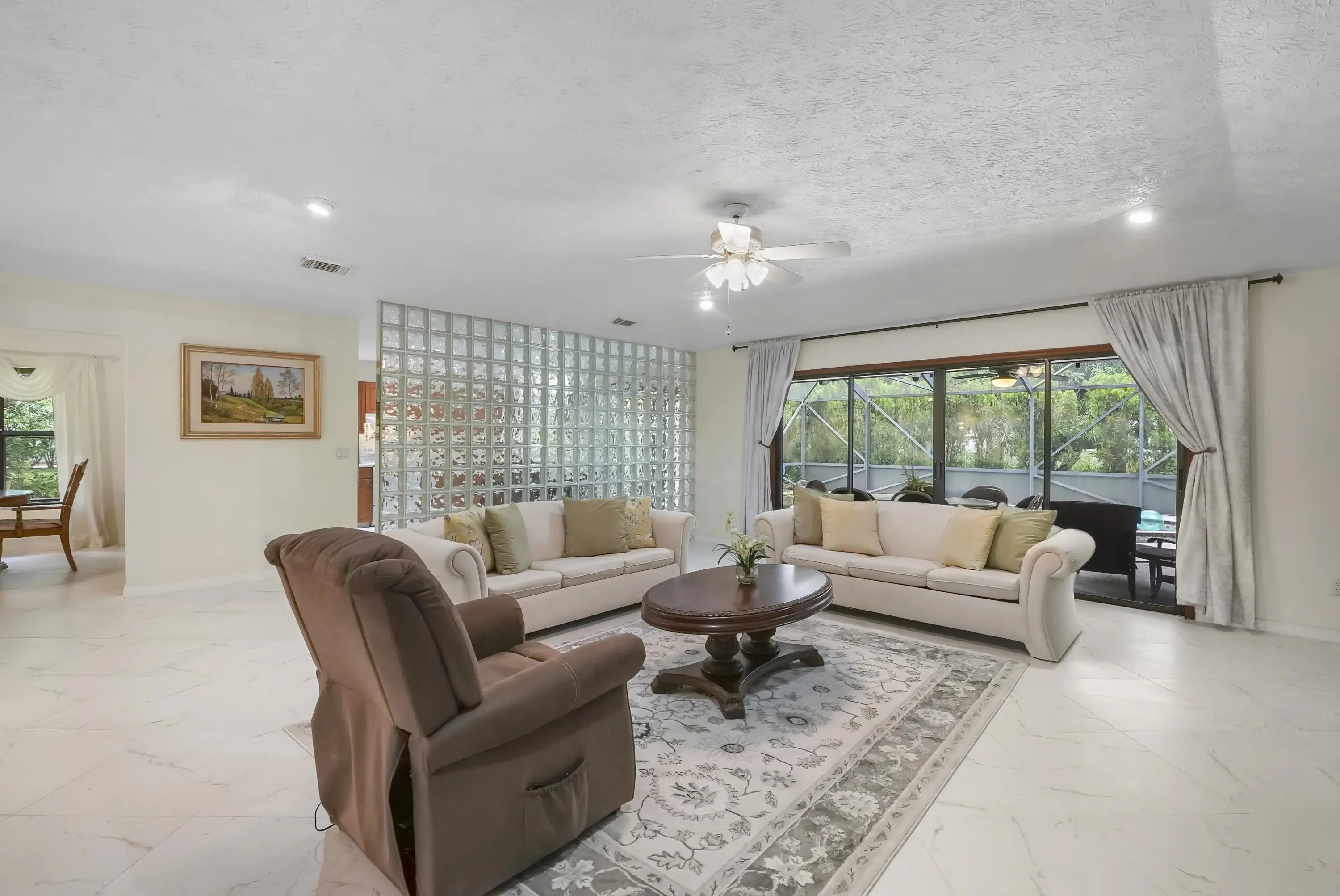 Discover this 3-bedroom, 3-bath pool home on a coveted corner lot in desirable non-HOA Floresta Gardens. Boasting 2,252 sq ft of living space, this home features a charming brick exterior and a spacious split-floorplan with a rare cabana bath, large bedrooms, and upgraded oversized tile flooring - no carpet! Perfect for entertaining, you'll love the wet bar, kitchen pass-through to the patio, and expansive outdoor living area with a covered patio and screen enclosure. Additional highlights include gutters, a newer water heater & refrigerator, and a layout designed for privacy and comfort. All this in a prime location, just 15 minutes from the shops and restaurants of Tradition and St Lucie West. This well-cared-for, one-owner home blends indoor elegance with outdoor enjoyment.