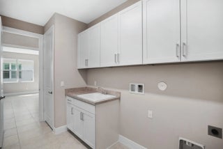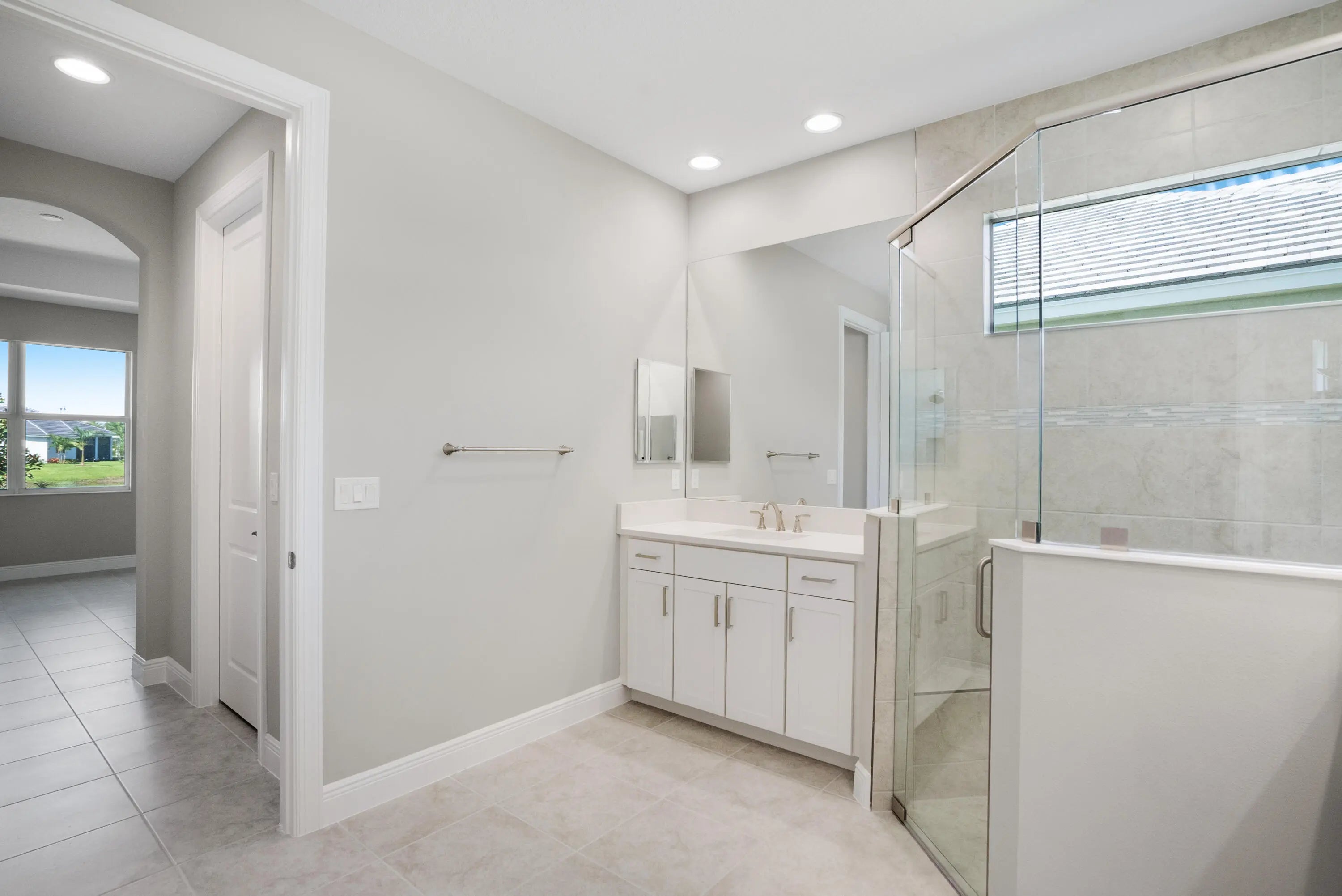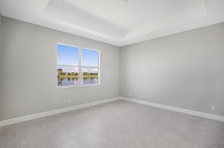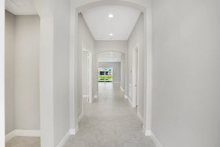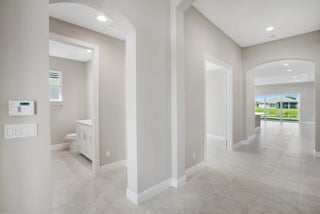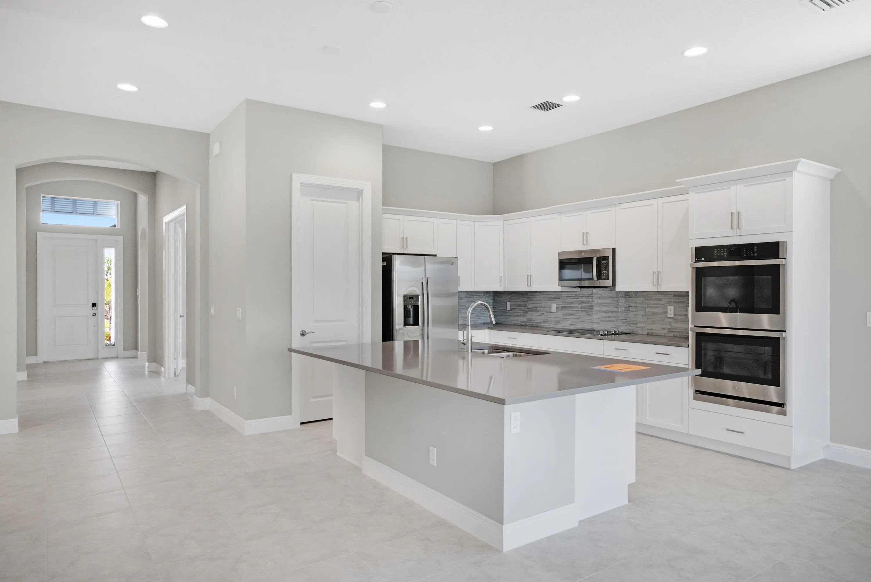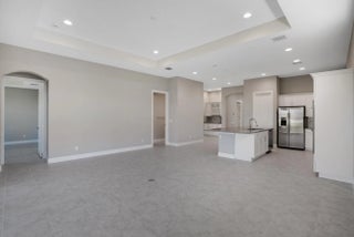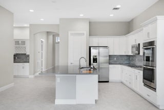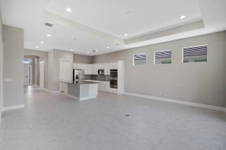 2-bedroom plus den home features an open-concept layout, with the kitchen centrally located alongside a spacious great room. The gourmet kitchen is elegantly designed with white cabinetry, soft-close doors and drawers, quartz countertops, and stainless-steel appliances, including a refrigerator, microwave, and double oven. A formal dining area, complete with a dry bar, enhances the layout. Tile flooring extends throughout the home.The secondary bedroom and den are situated at the front of the house, with the den featuring double glass doors. The master suite, located at the rear, is accessed via a foyer for added privacy. The suite offers two large walk-in closets and a bathroom with split vanity sinks and a large shower.