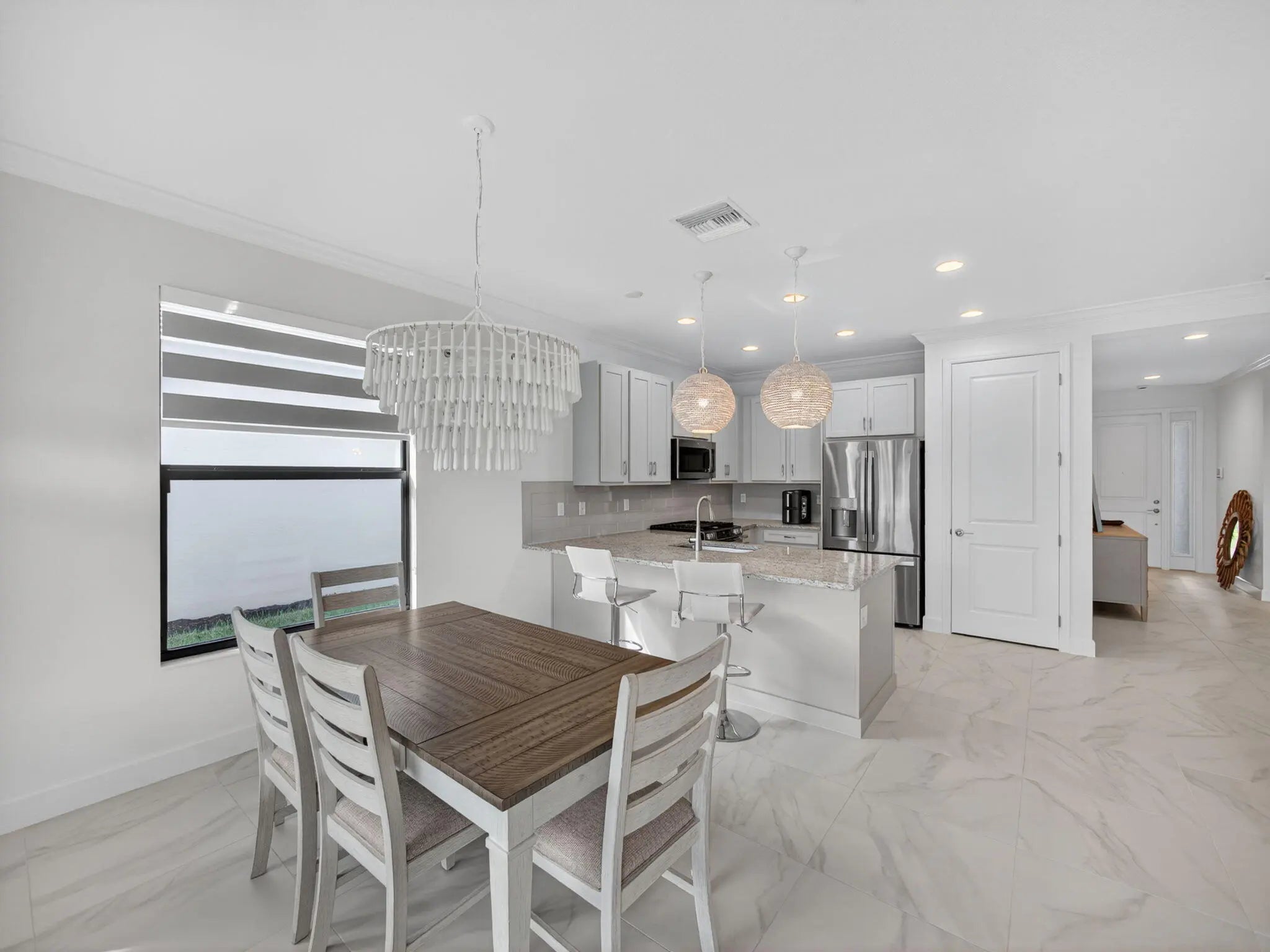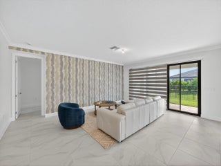 Experience luxury living at its finest in this meticulously upgraded 3-bedroom, 2-bathroom home located in the prestigious Valencia Walk at Riverland community. Every inch of this residence showcases elegance, craftsmanship, and thoughtful design. Step inside to an open floor plan enhanced by luxury wallpaper, designer paint, and custom lighting fixtures that create a warm, inviting atmosphere. The crown molding adds timeless sophistication throughout, while Closets by Inspired Closets Treasure Coast and built-in custom shelving maximize organization and style.