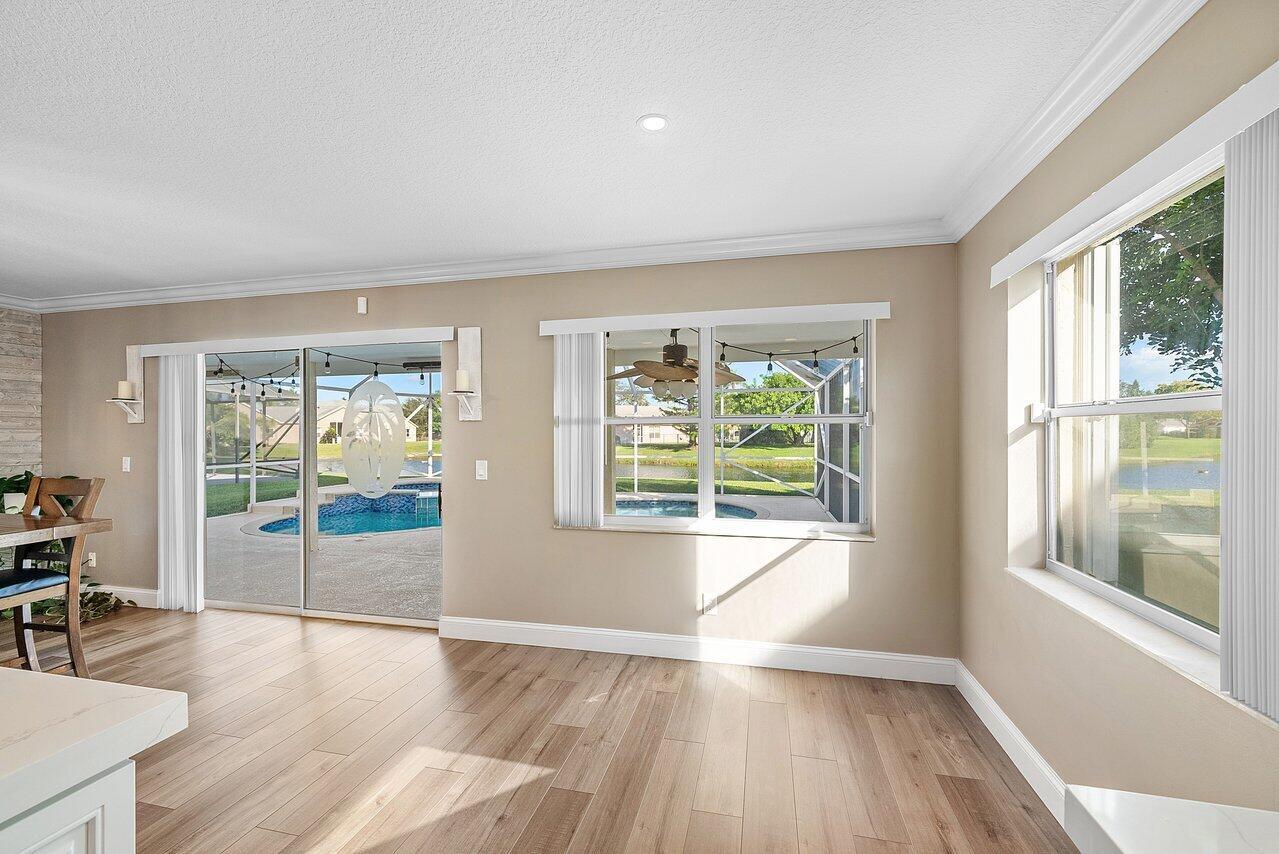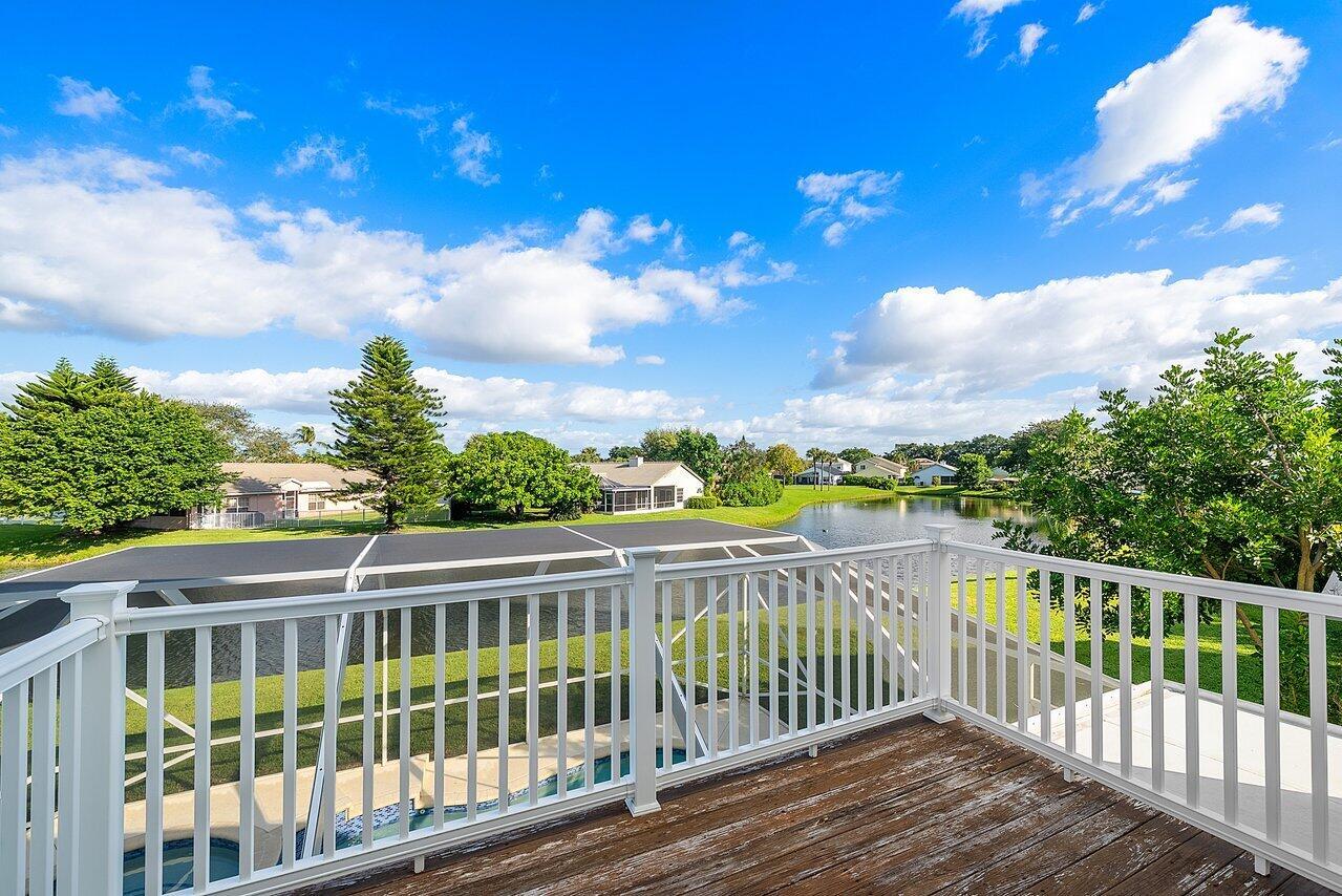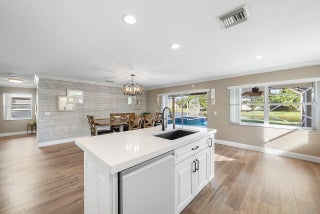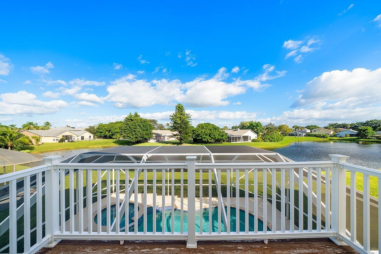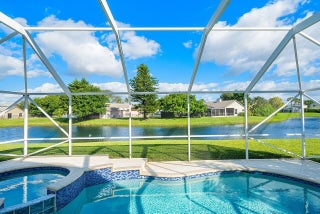 Welcome to your dream home in Bay Estates at Rainbow Lakes! This desirable 4-bedroom, 3-bath waterfront pool home Delaware model blends comfort, elegance, and functionality for today's modern lifestyle. Step through the welcoming foyer and be greeted by volume ceilings filling the home with light and space. The premium vinyl wood floors flow seamlessly throughout the main living areas, adding both style and durability. The chef's kitchen is the heart of the home -- featuring a welcoming island, Bellevue quartz countertops, white cabinetry with crown molding throughout. Other features to take in are pull-out pantry drawers, recessed lighting, and ample counter and storage space. It's truly a culinary dream come true!Perfect for entertaining, the family room features a designer bar alcove, ideal for hosting gatherings or cozy evenings in. Upstairs, you'll find a spacious open loft with custom built-in shelving perfect for a home office, play area, or reading nook. The primary suite offers a serene retreat with a private balcony overlooking the lake, a walk-in closet, a jacuzzi tub, and a spacious shower. Also on the second floor are two sizeable guest bedrooms, each offering generous closets and plenty of natural light. A ground-floor bedroom with double door grab closet conveniently near a full guest bath. Step outside to your private paradise: a screened-in pool and hot tub, a covered lanai, and breathtaking long-lake views the perfect backdrop for sunsets, stargazing, or weekend gatherings. This home truly has it all space, style, and the warm welcoming energy ready to make it your home.