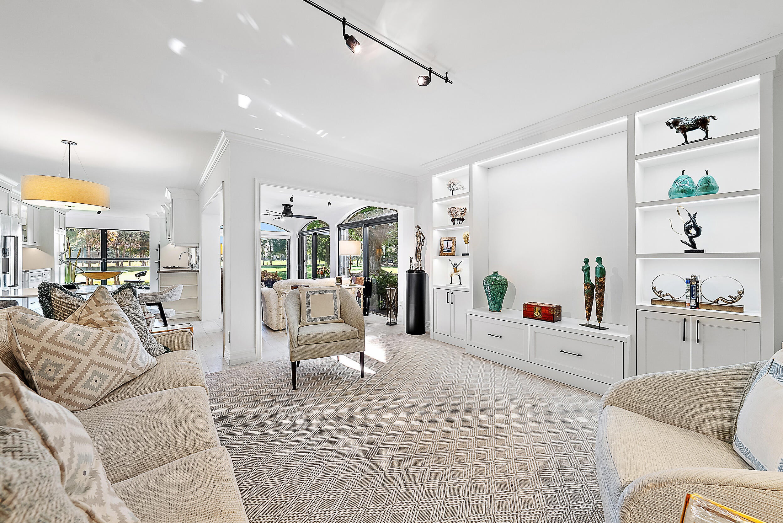 Experience effortless luxury and serene golf course views on the 9th hole of the Village course in this beautifully updated, single-story 2-bedroom, 2-bath condo in the coveted Traders Crossing community of Jonathan's Landing. This light-filled first-floor home offers elegant living space with porcelain tile floors, crown molding, and a brand-new custom built-in cabinet in the living area. The recently updated kitchen features new hurricane-impact windows, white shaker cabinetry, quartz countertops, a chevron backsplash, and stainless steel appliances including double wall ovens. Enjoy sweeping golf course views from the kitchen, living room, enclosed sunroom, and primary suite.The spacious primary retreat includes dual vanities, a walk-in glass shower, and generous custom designed closet space, while the split floor plan ensures guest privacy. Additional highlights include a private garage, golf garage, full laundry room, partial impact glass and accordion shutters for peace of mind. Ideally located in the heart of Jupiter near beaches, marinas, fine dining, and shopping, Jonathan's Landing offers three championship golf courses, tennis, pickleball, a marina, fitness center, and an active social lifestyle. Membership optional.