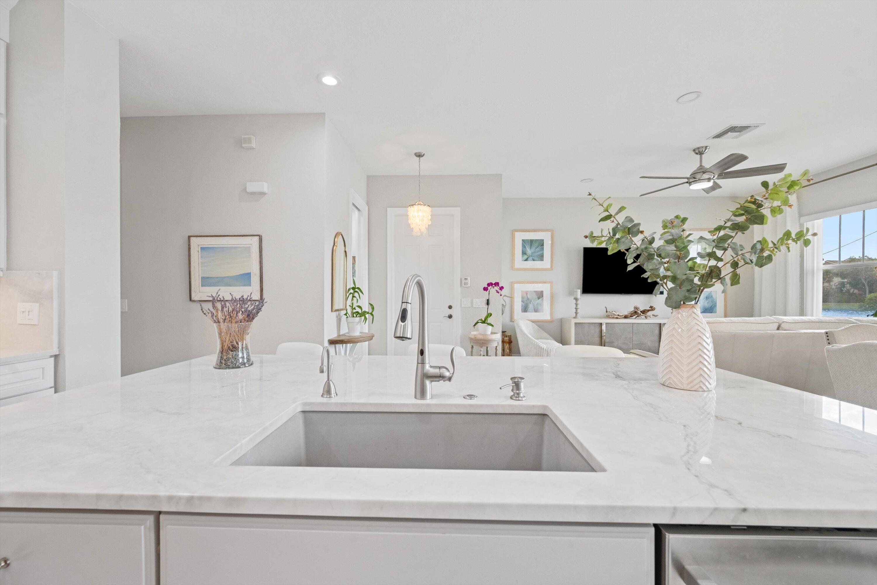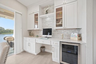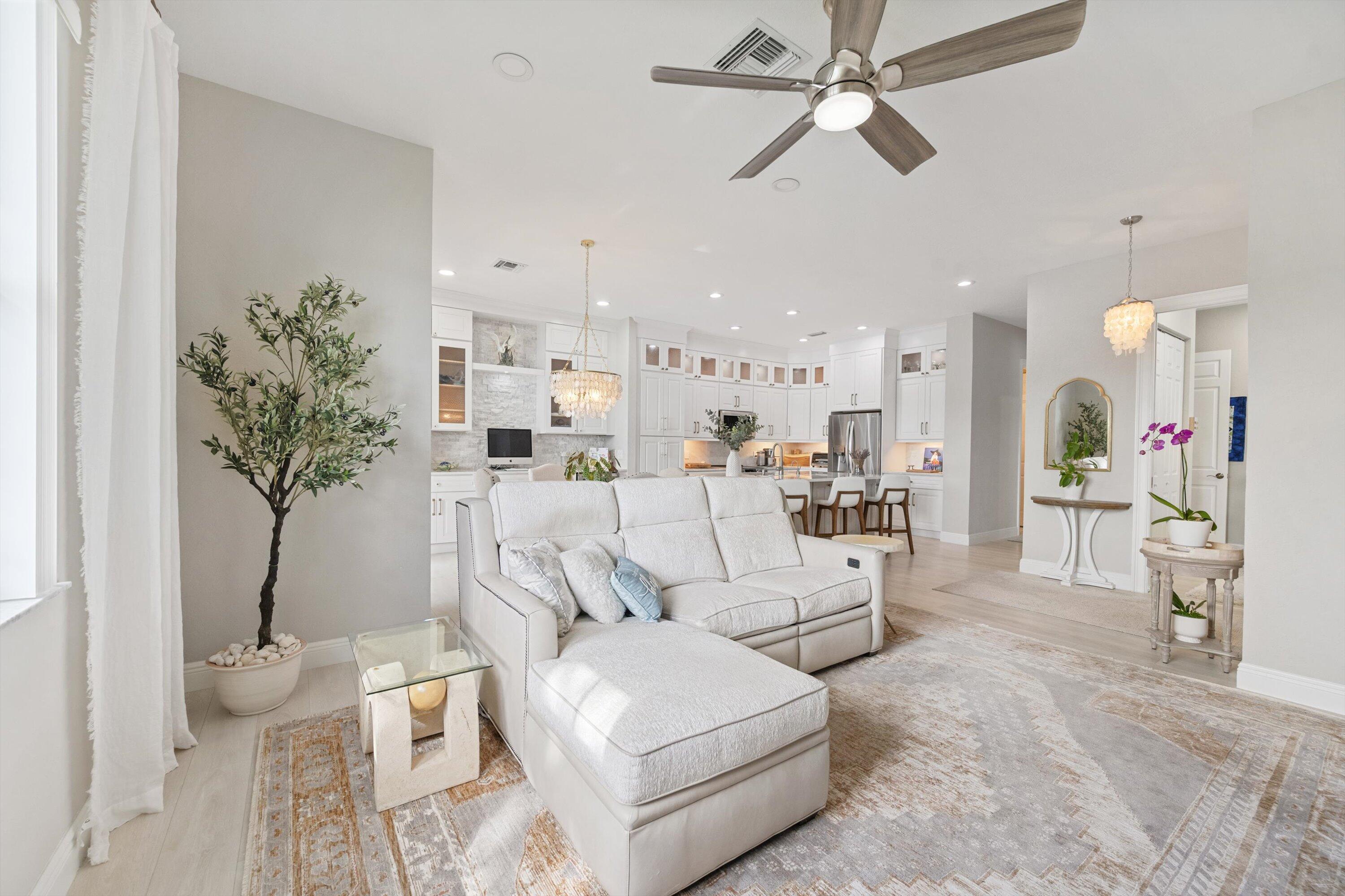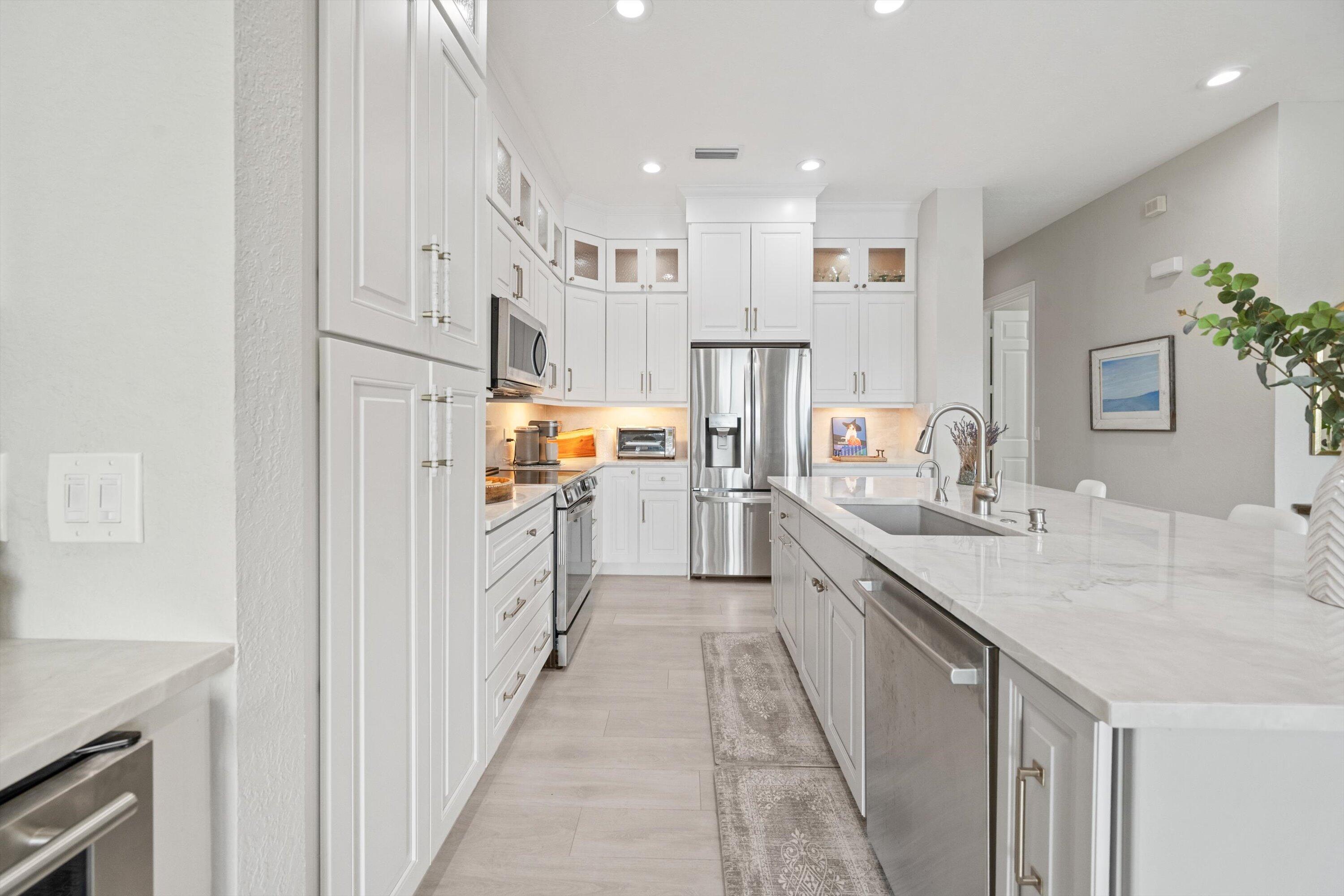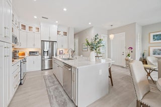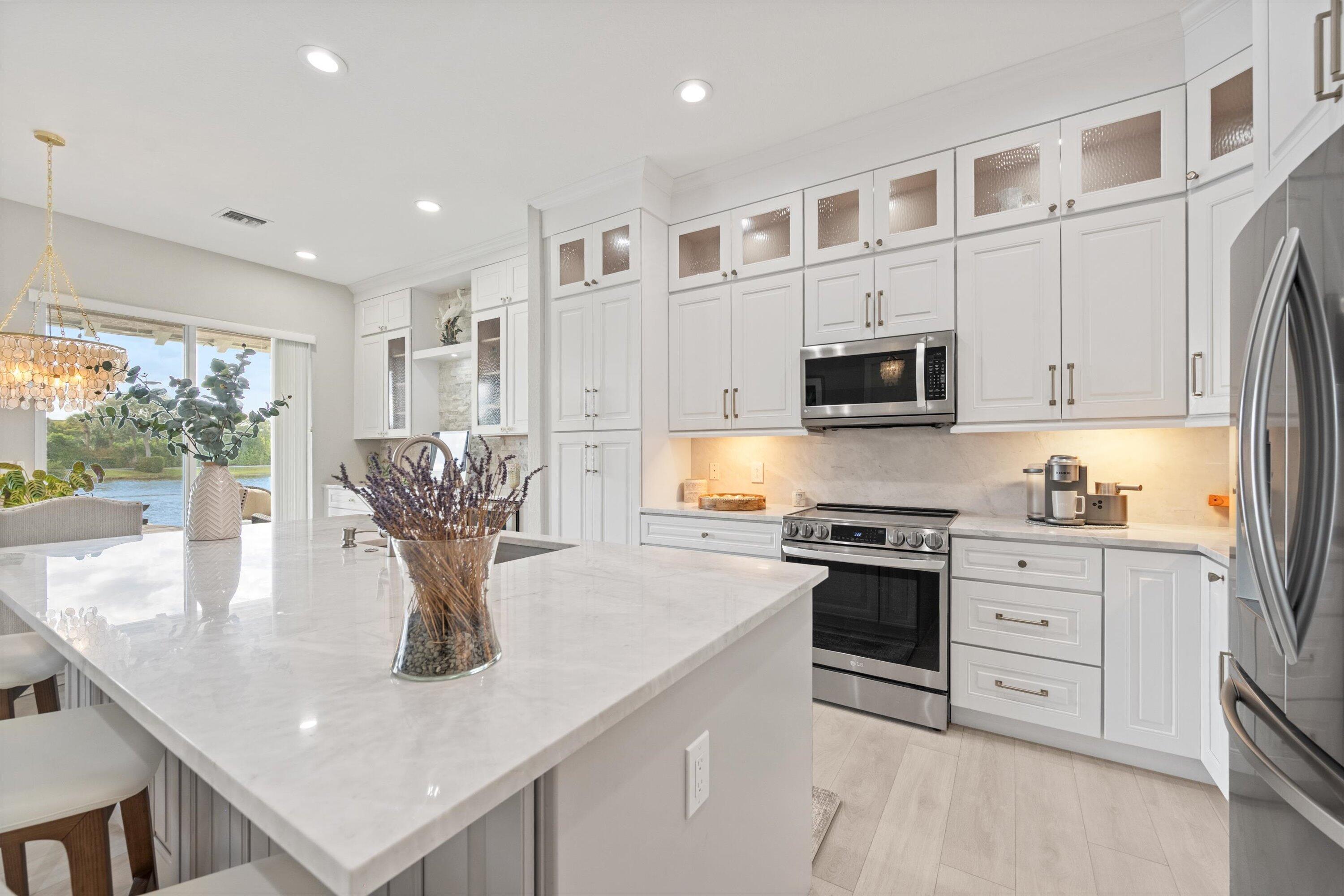 Welcome In To This Rare Find!! Most Desirable Lakefront 1 story (no stairs) Unit That Has Been Beautifully Updated, Opened Up & Completely Redesigned & Renovated. This Corner Unit Offers A Private Walkway & Entrance Into The Home. The Incredible Open Concept Kitchen Has High-End Cabinets Extending All The Way To The Ceiling & Expanding Over To A Thoughtfully Designed Desk/Office Space Along With Luxurious Stone Backsplash & Wine Fridge. The Stunning Kitchen Island & Countertops Have Upgraded Granite That Also Extend As A Backsplash Along With Stainless Steel Appliances. Coastal Chandeliers Adorn The Entryway Of The Front Door & Dining Room. Recessed Lighting Throughout. Gorgeous Laminate Flooring Throughout The Main Living Areas & Bedrooms.The 3rd Bedroom Was Opened Up With An Addition Of A Second Door Off Of The Main Entryway. Enjoy A Nice Cup Of Coffee Or A Glass Of Wine On Your Covered Patio With Serene Private Lake Views And Spectacular Sunsets. You Are Just Steps Away From The Numerous Amenities That This Community Offers Which Include Resort-Style Pool, Clubhouse, State-Of-The-Art Fitness Center, Walk Track Around The Lake, & 24hr Manned Gate. HOA Includes: Cable, Internet, Water/Sewer/Trash, Roof Maintenance, Bldg Maintenance, & Common Area. Roof 2005, A/C 2020. Hot Water Heater Feb 2025. Conveniently Located Near I95, Outlet Mall, PBIA, Downtown WPB, Palm Beach & Many Shops & Restaurants. Don't Miss Out On This One-Of-A-Kind Home!!