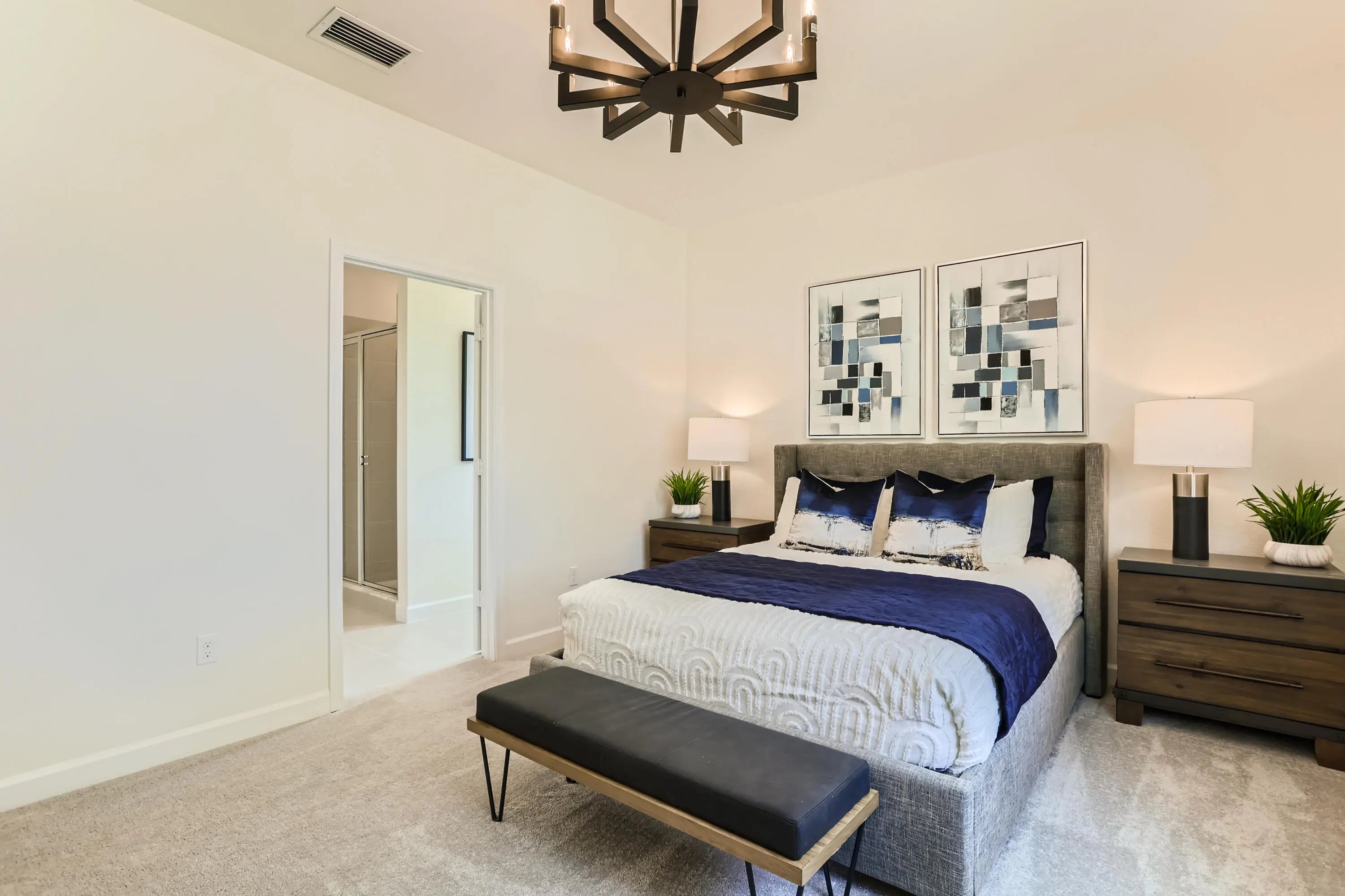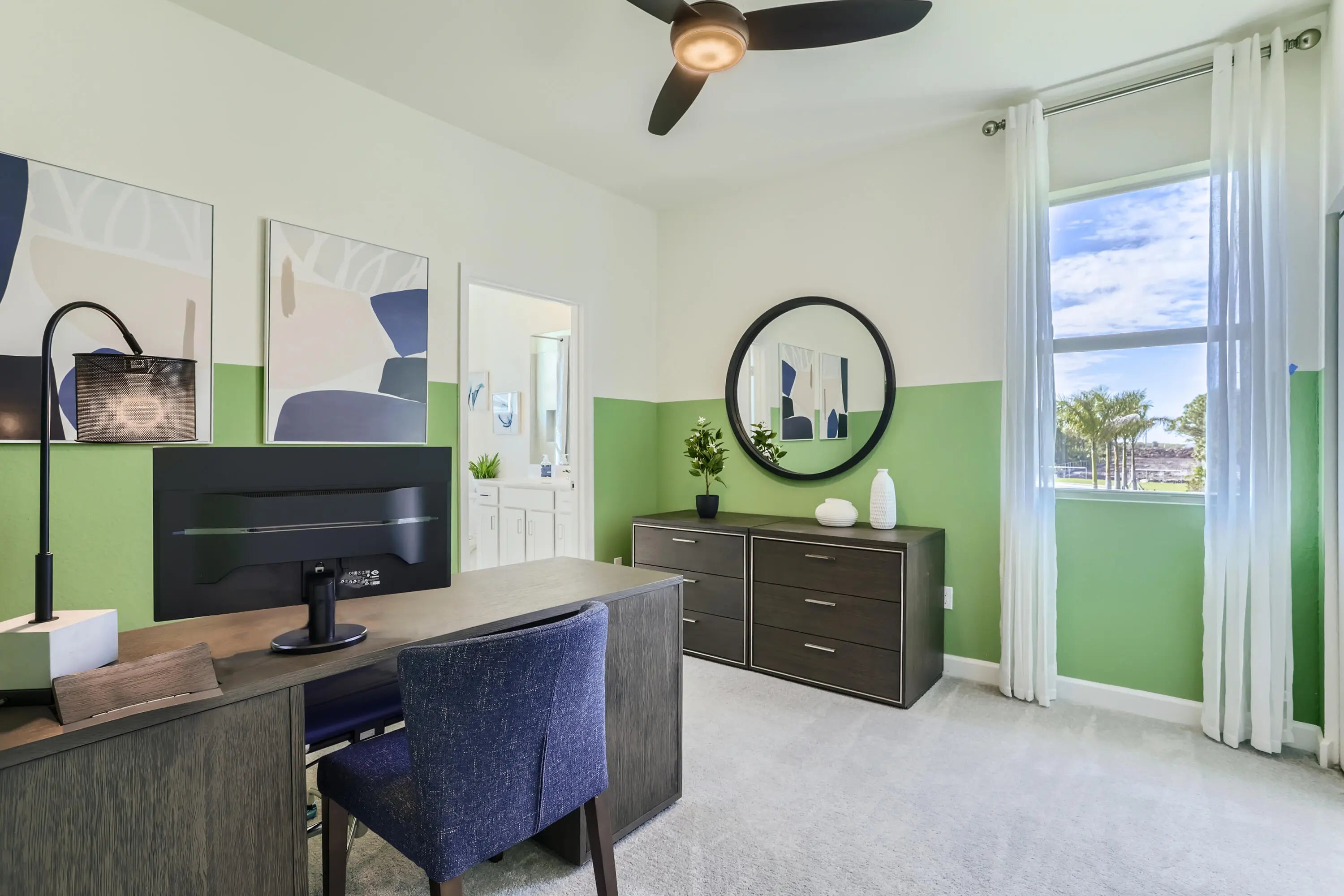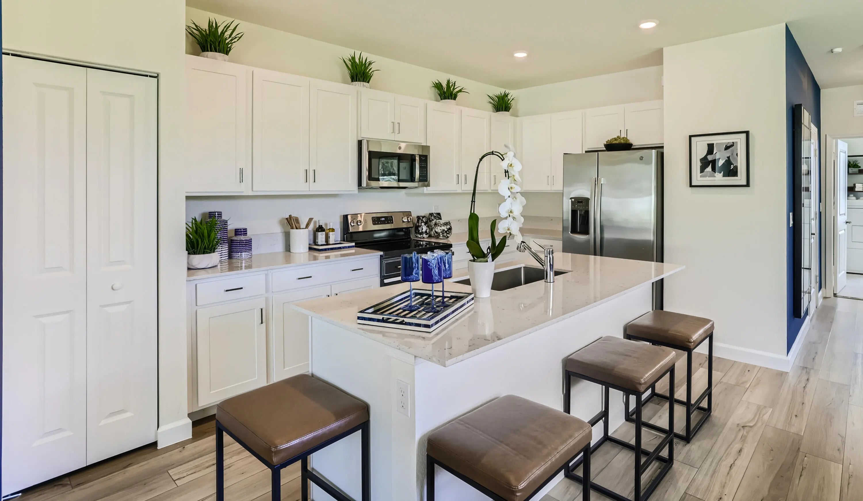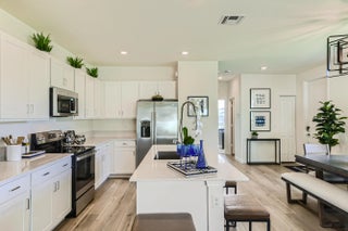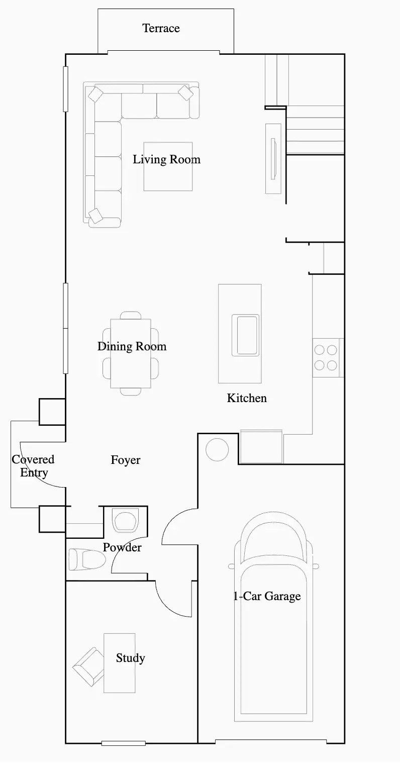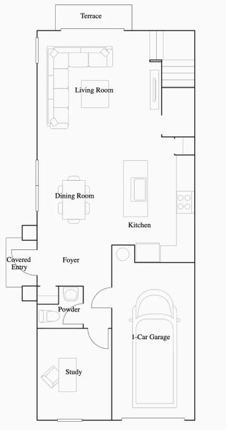 This two-story townhome has a smart layout that offers ample space and convenience. The first floor is occupied by the open-concept dining room, kitchen and living room, along with an attached terrace. A quiet study on the same level can be used as a home office. Upstairs are three peaceful bedrooms, each with direct access to an adjoining full-sized bathroom. Photos are for illustrative purposes only.