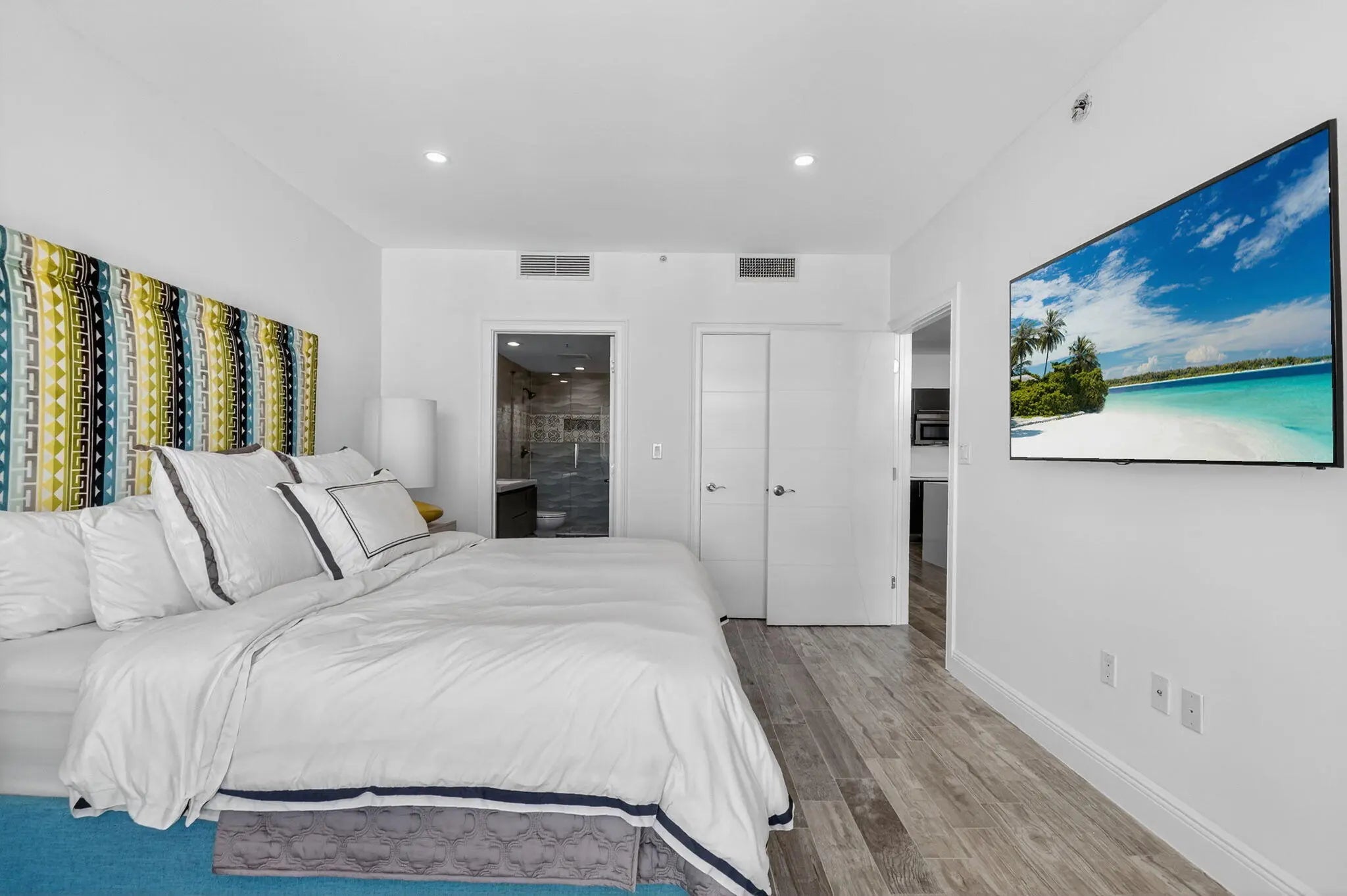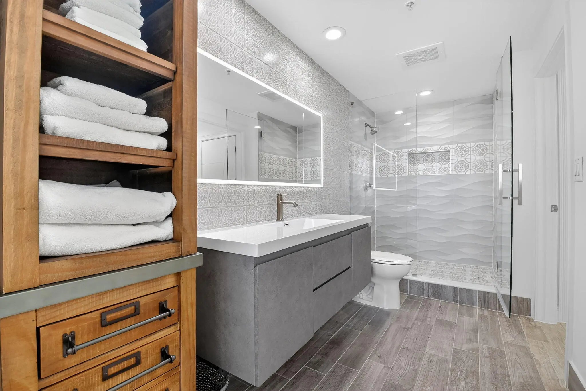 CityPlace South Tower is the healthiest highrise condo in Downtown West Palm Beach! No Projected Special Assessments & Virtually No Maintenance Fee Increases in 2026! Association is Compliant with statutory SIRS Requirements and has Very Healthy Reserves! This completely reimagined one-bedroom residence offers high-end finishes, exceptional light, and one of the largest balconies you'll find in a 1-bedroom downtown. Updated from top to bottom, the home features wide-plank, wood-look tile flooring throughout and recessed lighting that makes the entire space feel light, bright, and airy. The kitchen is a showstopper, with quartz waterfall countertops, sleek custom cabinetry, upgraded appliances, and a modern backsplash, perfect for both everyday living and entertaining.