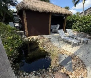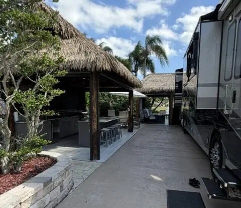 The right stuff! Large well appointed lake/pond front lot with waterfall views! 2 tikis with synthetic, low maintenance palm frond roofs with automatic shades with internet operation. Tile floors enhance the beauty of the tikis! Gorgeous high end well appointed kitchen, stainless appliances, weather resistant cabinets and granite counters. Custom canvas covers for all for off season protection! Additional paver seating entertainment spaces. This is a smart priced, must see lot. Furniture and TV are excluded. Motorcoach Resort St Lucie West is a gated Class A Motorcoach resort with amenities galore including an 18 hole executive golf course, 4 pools, hot tub, pickleball, tennis, and so much more! Dog friendly, second to none activities and on site management. More photos to come.