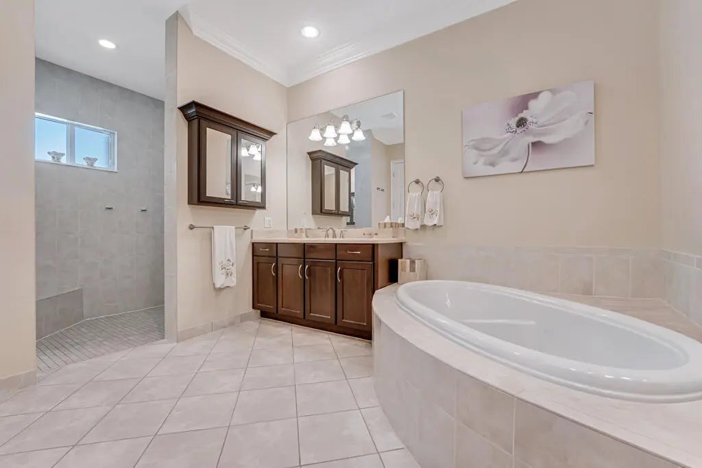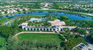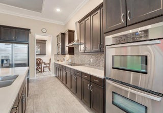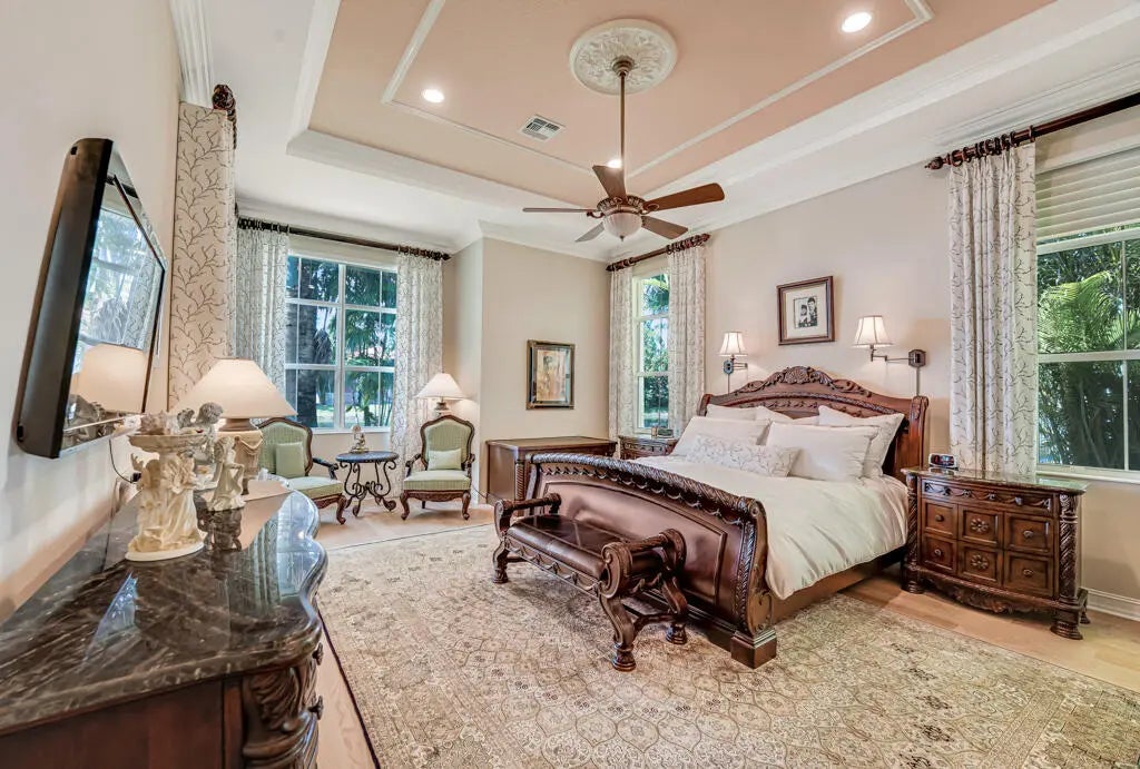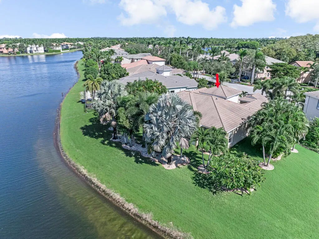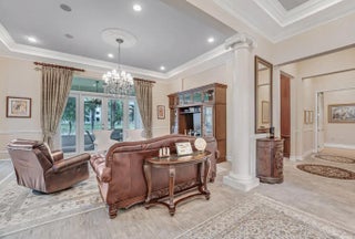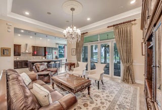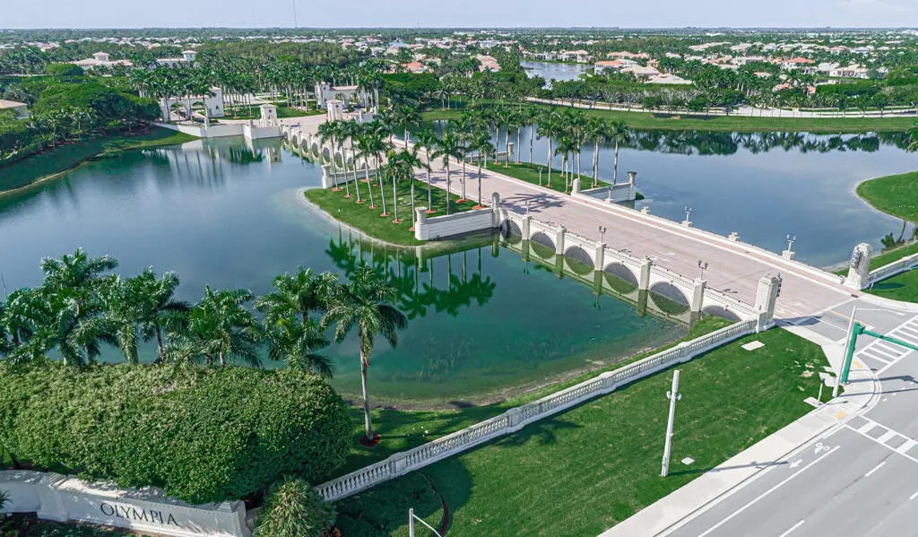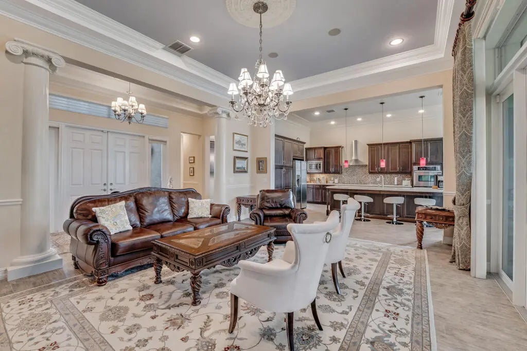 This elegant one-story home offers over 4,000 square feet of living space and is situated on a large pie-shaped lot at the end of a quiet cul-de-sac. Once part of the community's model row, the property is surrounded by expansive lakefront views, providing nearly 180 degrees of stunning water scenery.Notable features include a three-car garage, three private bedrooms, and a spacious club room currently used as an office. The home showcases high-end finishes such as crown molding throughout, 11-foot coffer ceilings, neutral tones, and light tile flooring across the main living areas.The primary bedroom wing offers exceptional comfort with red oak flooring, dual custom walk-in closets and separate his-and-hers bathroom areas, creating a private retreat within the home. Olympia