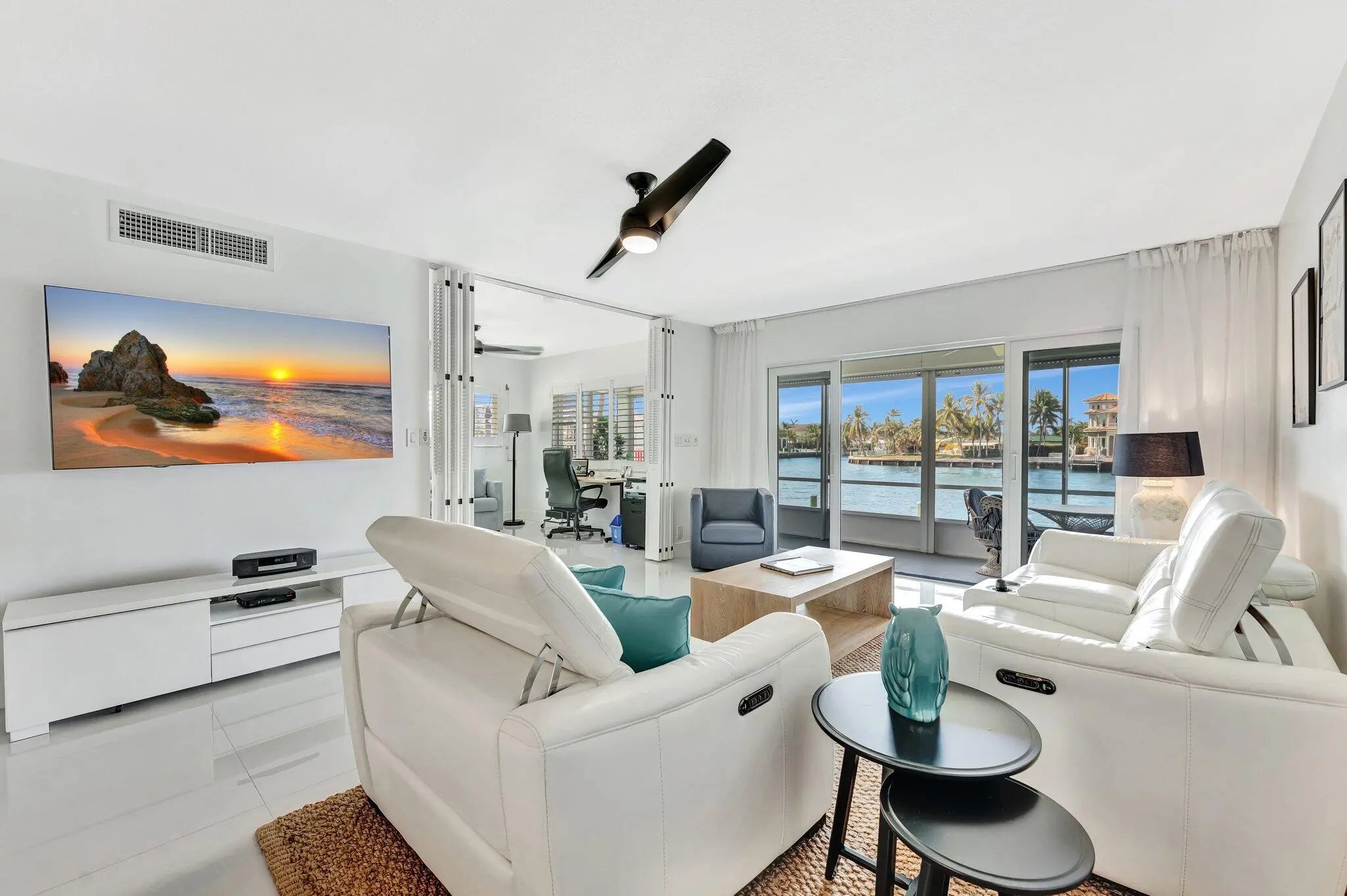 Welcome to your dream coastal retreat! The stunning 2-bedroom, 2- bathroom intercoastal front condo offers breathtaking views and unparallel access to your own private beach with lounge chairs. Perfectly situated within walking distance to shopping and a variety of oceanfront dining options, this home combines convenience with a serene lifestyle on millionaire mile. Stop inside to discover a beautifully new designed kitchen featuring modern finishes and porcelain floors that exude elegance. The open concept living area flows seamlessly onto a screened patio where you can unwind and enjoy full views of intercoastal as mega yachts pass by from millionaire mile. Imagine winding down in the evening with picturesque sunsets right on your private patio.