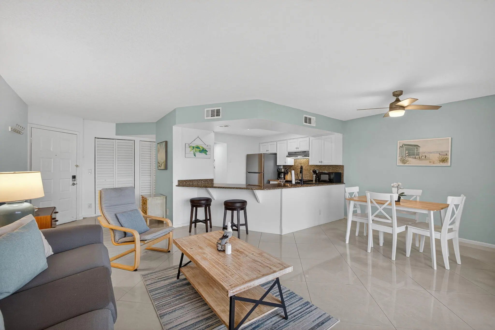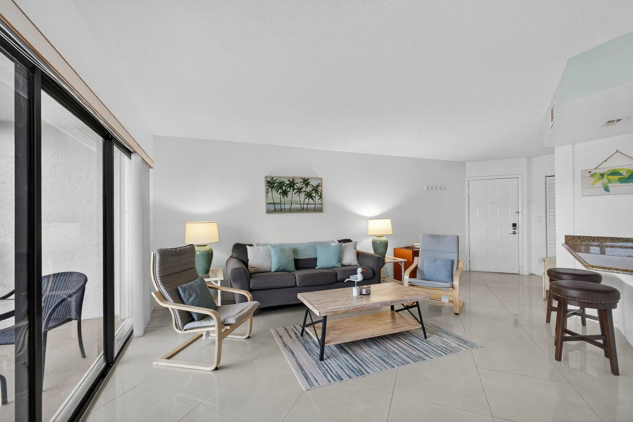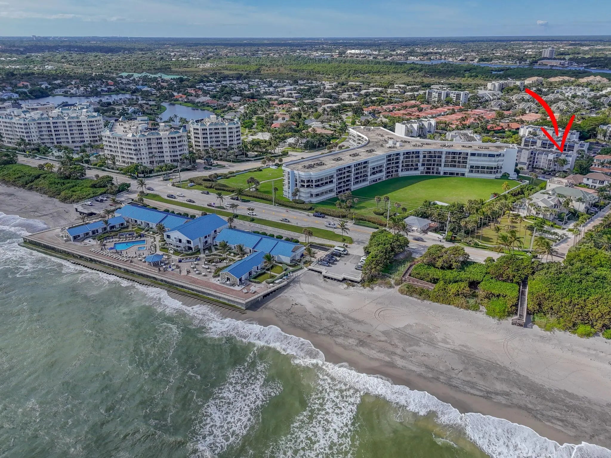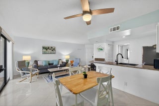 Live the coveted Jupiter beach lifestyle! Just 150 yards from the sand, this top-floor 1-bedroom, 1.5-bath condo offers an elegant coastal retreat with a peek of the aqua-blue ocean. The open kitchen showcases newer appliances, including an induction range, and flows effortlessly into a bright, newly painted living area. Step onto your private balcony to enjoy the ocean breeze with morning coffee or take in the glow of a Florida sunset. The spacious primary suite features an updated en-suite bath and a generous walk-in closet for added comfort. Located in the desirable Jupiter Ocean & Racquet Club, residents enjoy resort-style amenities including heated pools, a clubhouse, and convenient beach access.