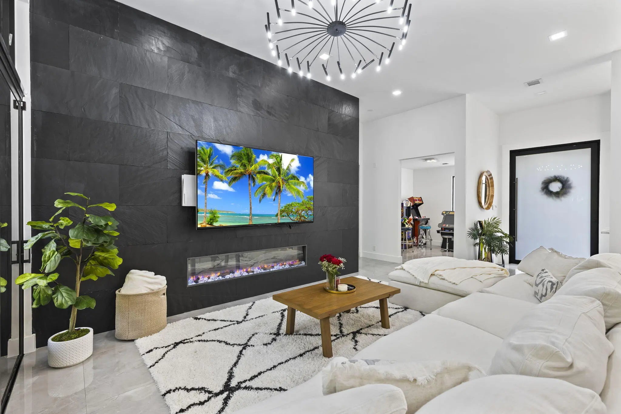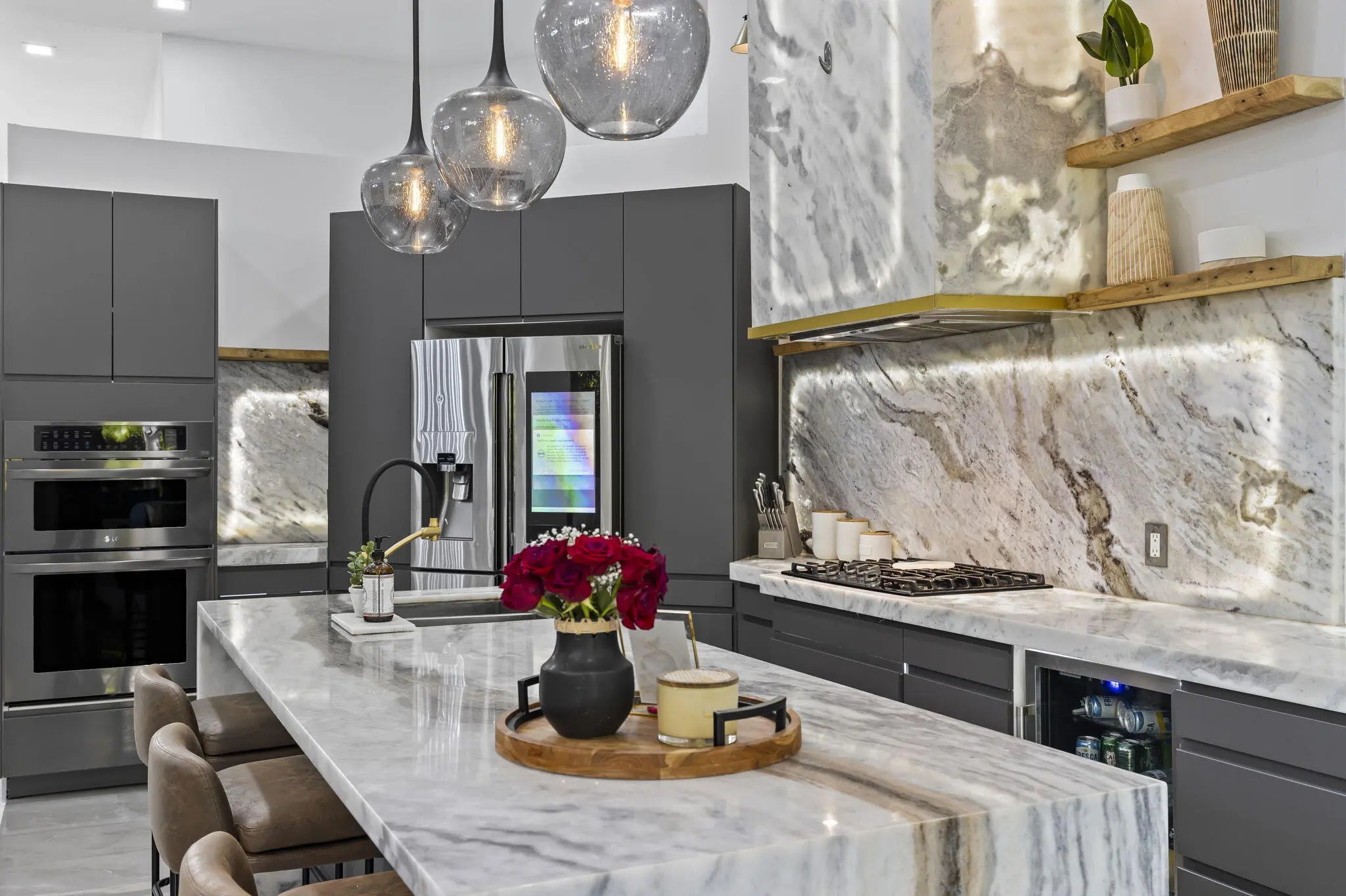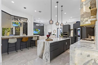 A Masterpiece of Modern Luxury! This exquisite home is a true standout, boasting premium upgrades and thoughtful details throughout. Step through the frosted entrance glass door and into a world of elegance. With impact windows and doors, glowing turf stone pavers in the front and rear, and LED accent lights, this home exudes curb appeal day and night. Outdoor Oasis: Entertain and relax in your personal paradise, featuring an outdoor shower, two gas-powered fire pits, a hot tub spa, and a projector screen for outdoor movie nights. The side-load garage and durable metal roof complete the exterior's sophisticated design.Gourmet Kitchen:The chef's dream kitchen boasts:Custom exotic marble counters and backsplash with LED lighting.Double islands featuring continuous waterfall