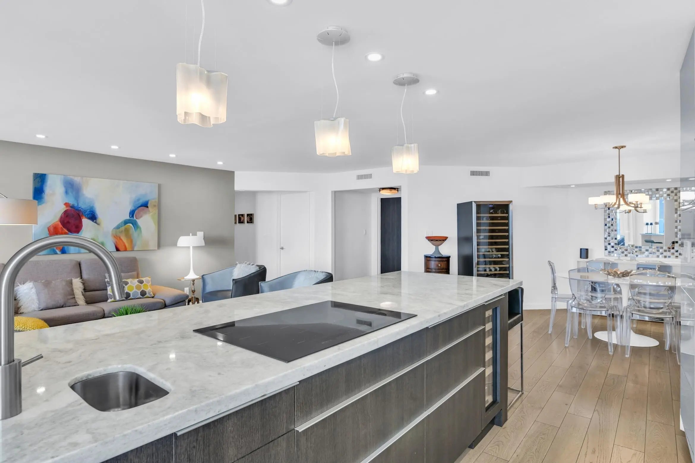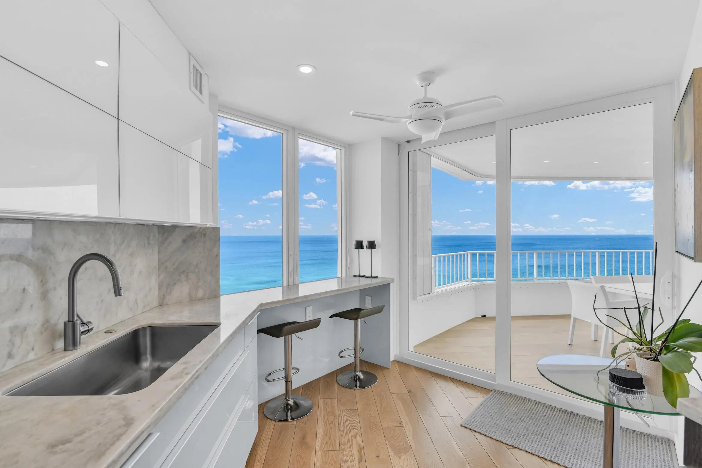 Spacious contemporary 21st-floor residence with breathtaking, unobstructed ocean views by day and city lights by night. Designed to perfection with custom cabinets, Miele steam oven, induction cooktop, wine cooler, quartzite counters and porcelain wood-look floors. ADA-compliant layout features an open kitchen and split bedrooms. Luxury building offers 24/7 doorman, state-of-the-art fitness center, pool, spa, tennis courts, and a stunning lobby with beautifully updated common areas.