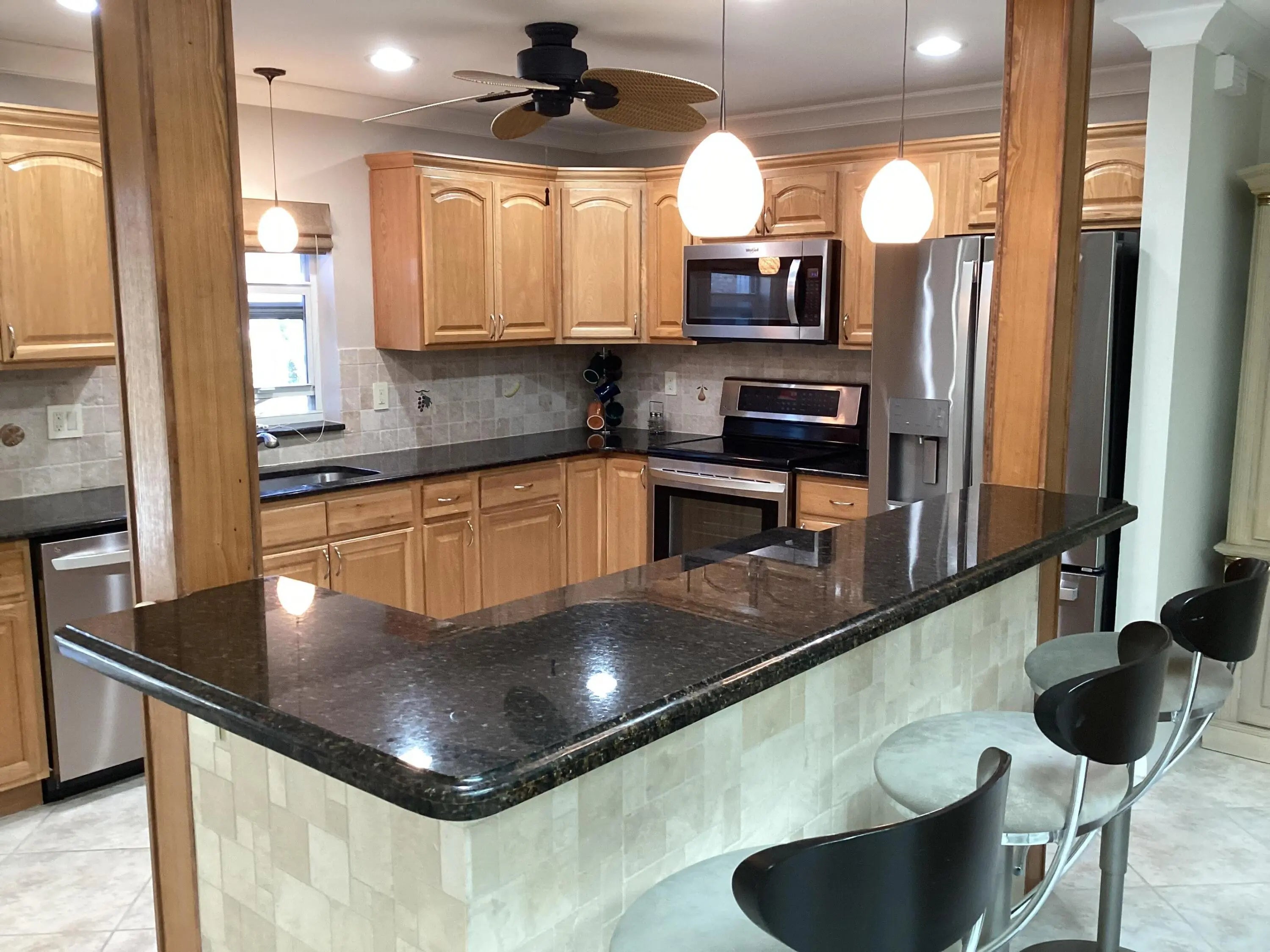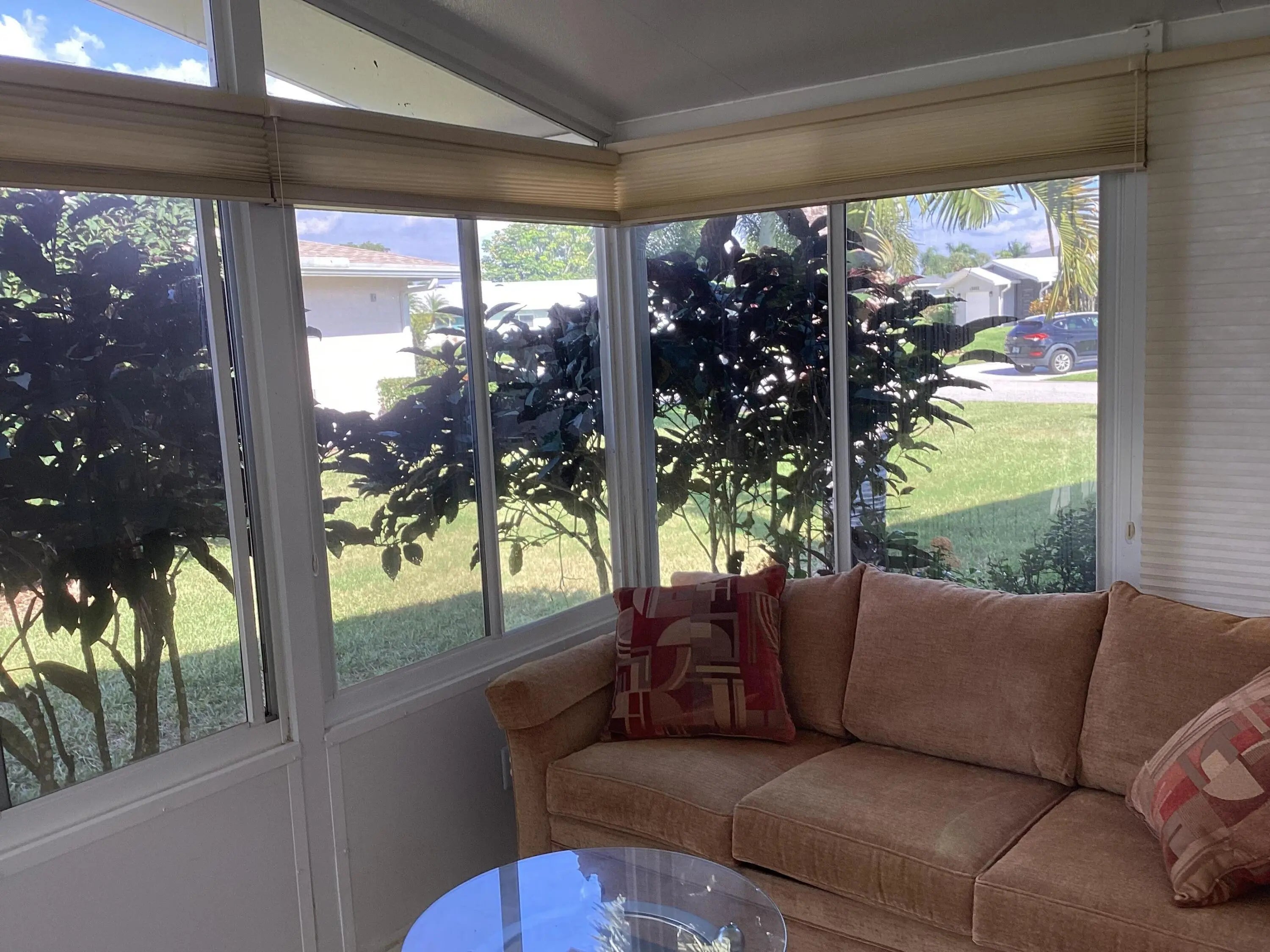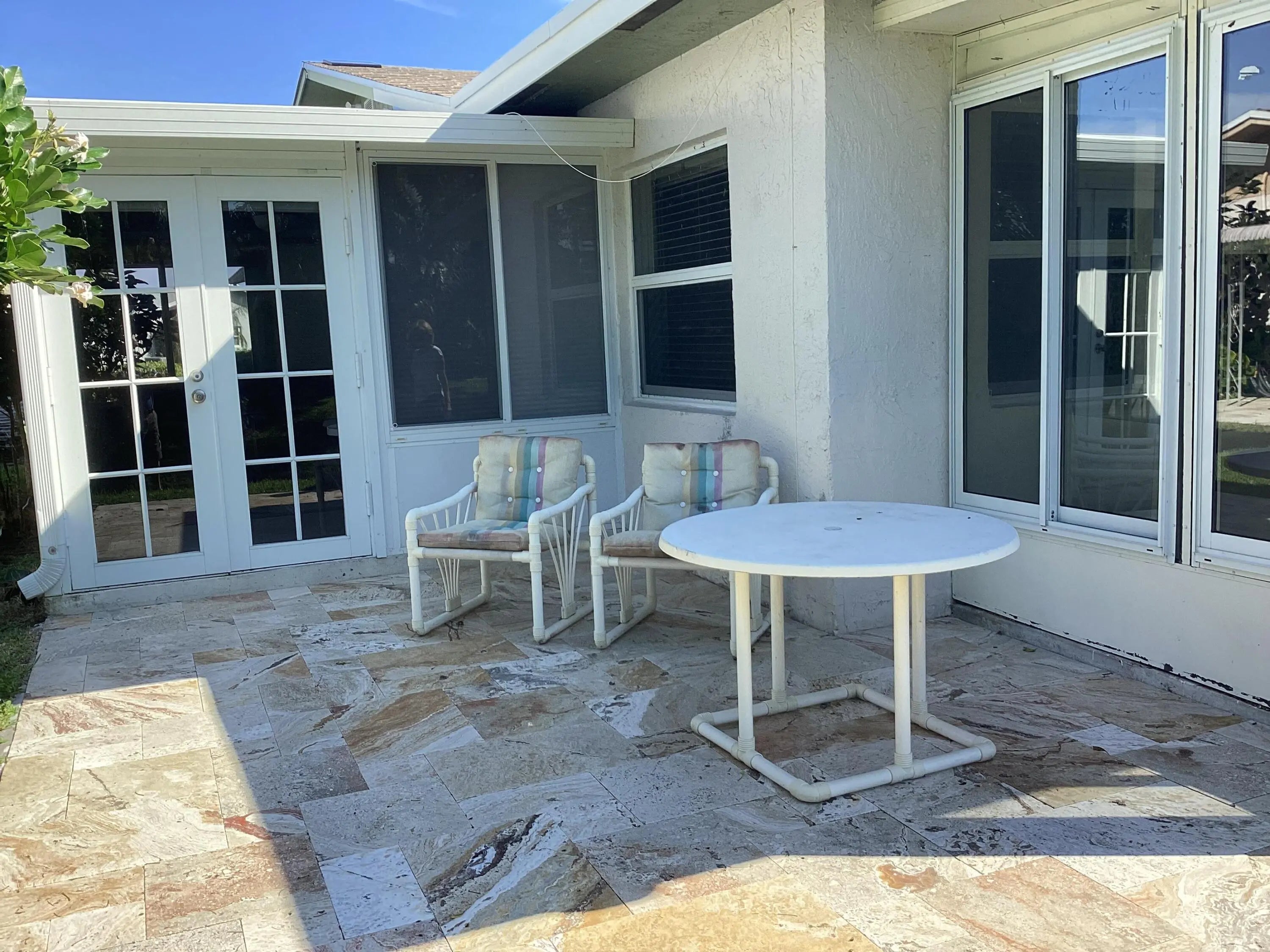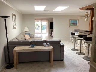 This home has a NEW roof and full impact windows. Modern open kitchen with granite countertops-stainless appliances, island into a living room with 2 new skylights. Large den with lots of natural light. Sliding door to 2 enclosed lanais with mini split air conditioners overlooks a gorgeous water view and lush greenery. Bathrooms with new walk in showers. Master bedroom closets with custom wood shelves. Important features: laundry room, popcorn free ceilings with crown molding and remote control ceiling fans, 1car garage, outdoor patios with beautiful travertine tile, double wide driveway. This extremely well maintained home is perfectly located on a quiet cul de sac and a short walk to pool and active clubhouse. Enjoy the convenience of nearby shopping, dining, and recreational options.