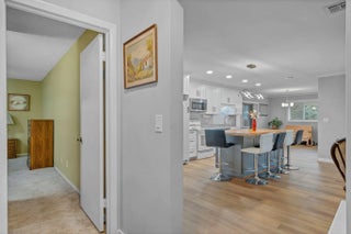 Mid-Century Modern-influenced CBS home in Sandpiper Bay, built in 1970 and thoughtfully updated by the current owner with significant aesthetic improvements. This 3 bed, 2 bath home with 1545 sqft of living space has an open & comfortable layout with ample natural light from oversized windows, including a front hurricane-rated window. The kitchen has been updated with quartz countertops, farmhouse sink, upgraded lighting, and a handmade kitchen island featuring fine wood craftsmanship on the island top. New water-resistant wood-looking flooring has been installed throughout the main living areas. Original mid-century elements remain, including retro tile work in the bathrooms, preserving the home's character. The screened lanai has been enhanced with plexiglass sliding windows, allowing
