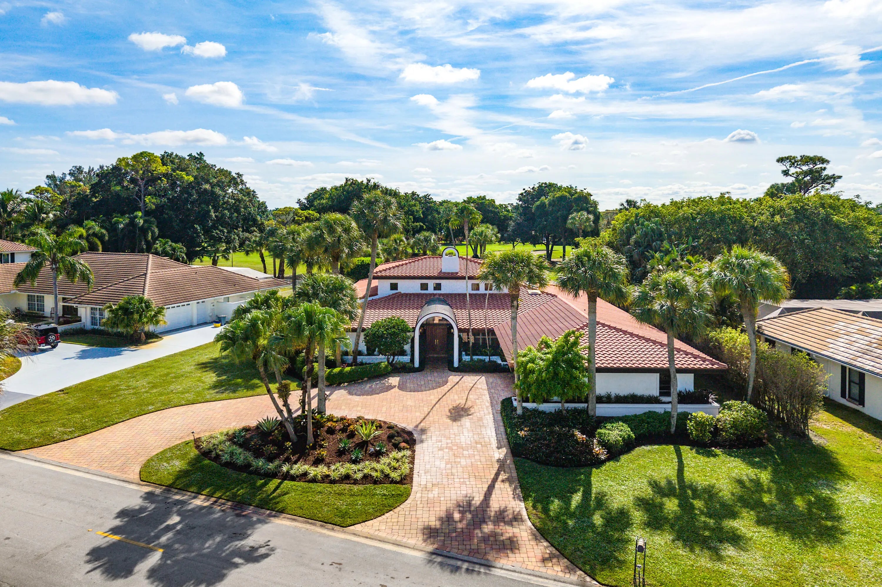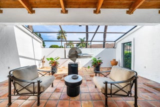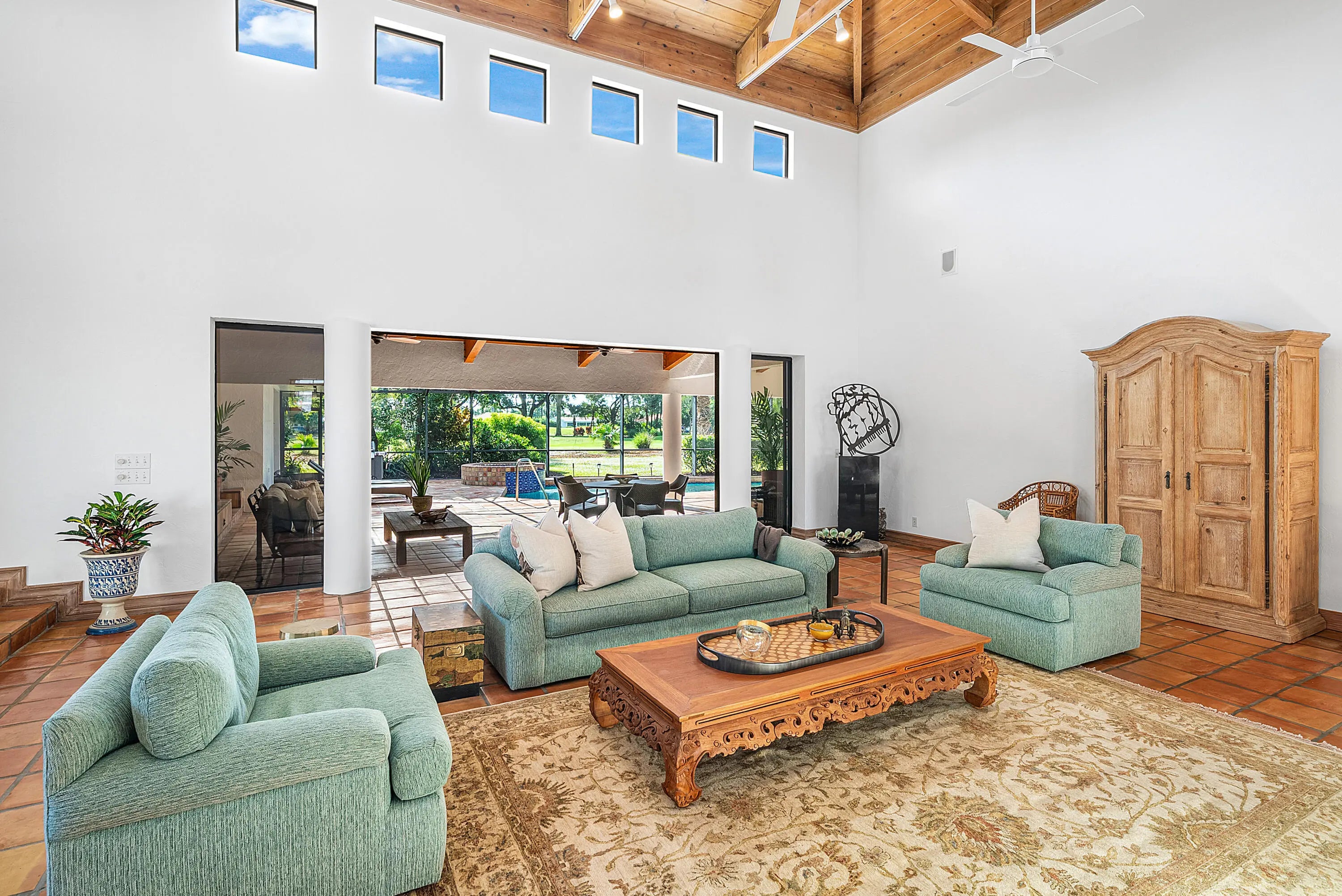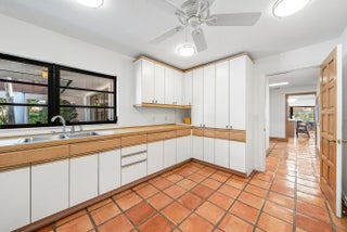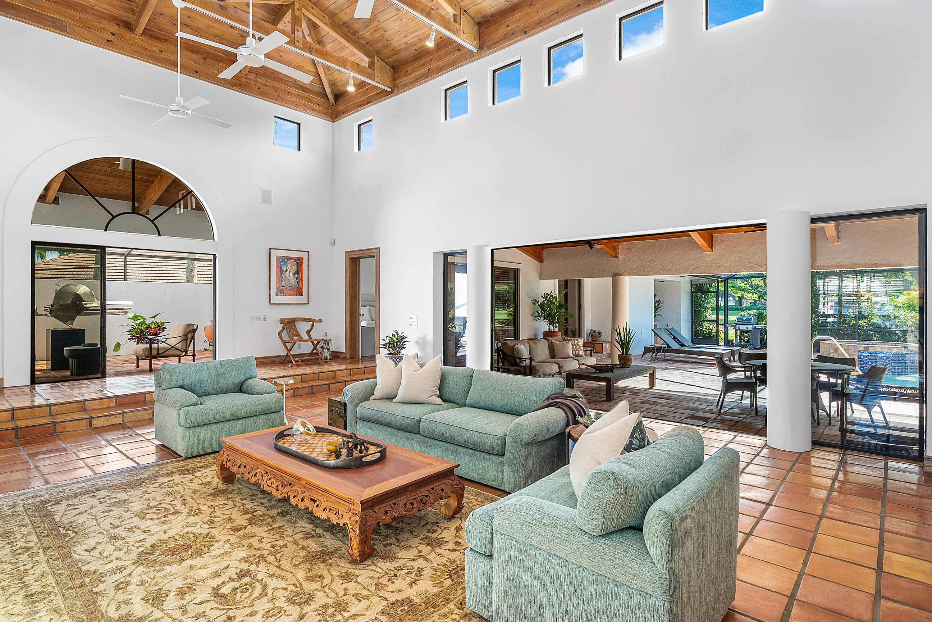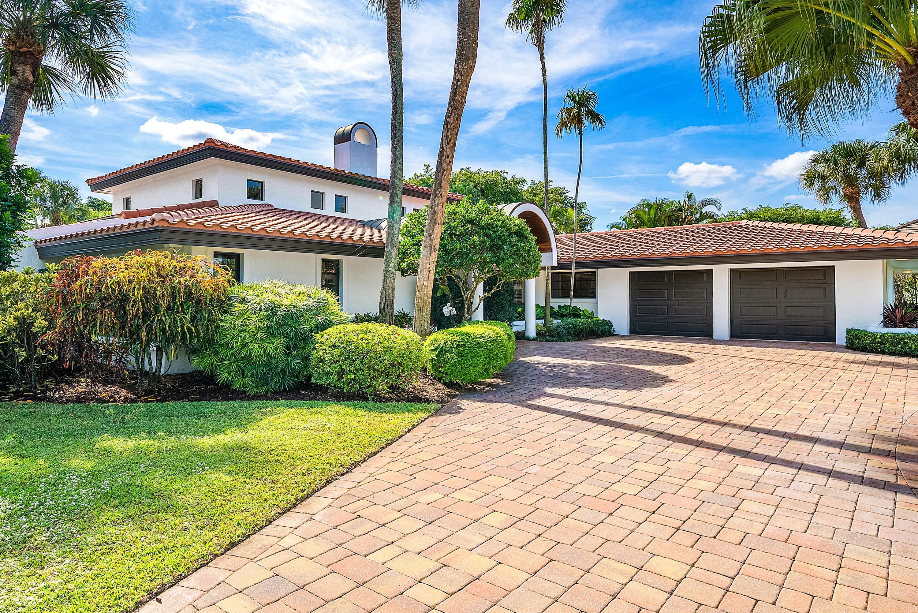 WOW! A truly one-of-a-kind California-style estate perfectly positioned on one of Atlantis' premier .44-acre lots, is now ready for its new proud owner. Open into your extraordinary great room with voluminous, brilliant exposed wood ceilings and incredible indoor-outdoor living with two entertainment spaces! An expansive circular driveway leads to an oversized two-car garage, setting the tone for the scale and presence of this home.Great master retreat with total access to all outdoor living. Sitting area / office nook, built-in designer wardrobe and two walk-in closets while soaking up pool views and lush landscaping inside your built-in tub.Stunning kitchen remodel with all custom cabinetry and quartzite countertops, thoughtful built-ins, double ovens & recessed lighting