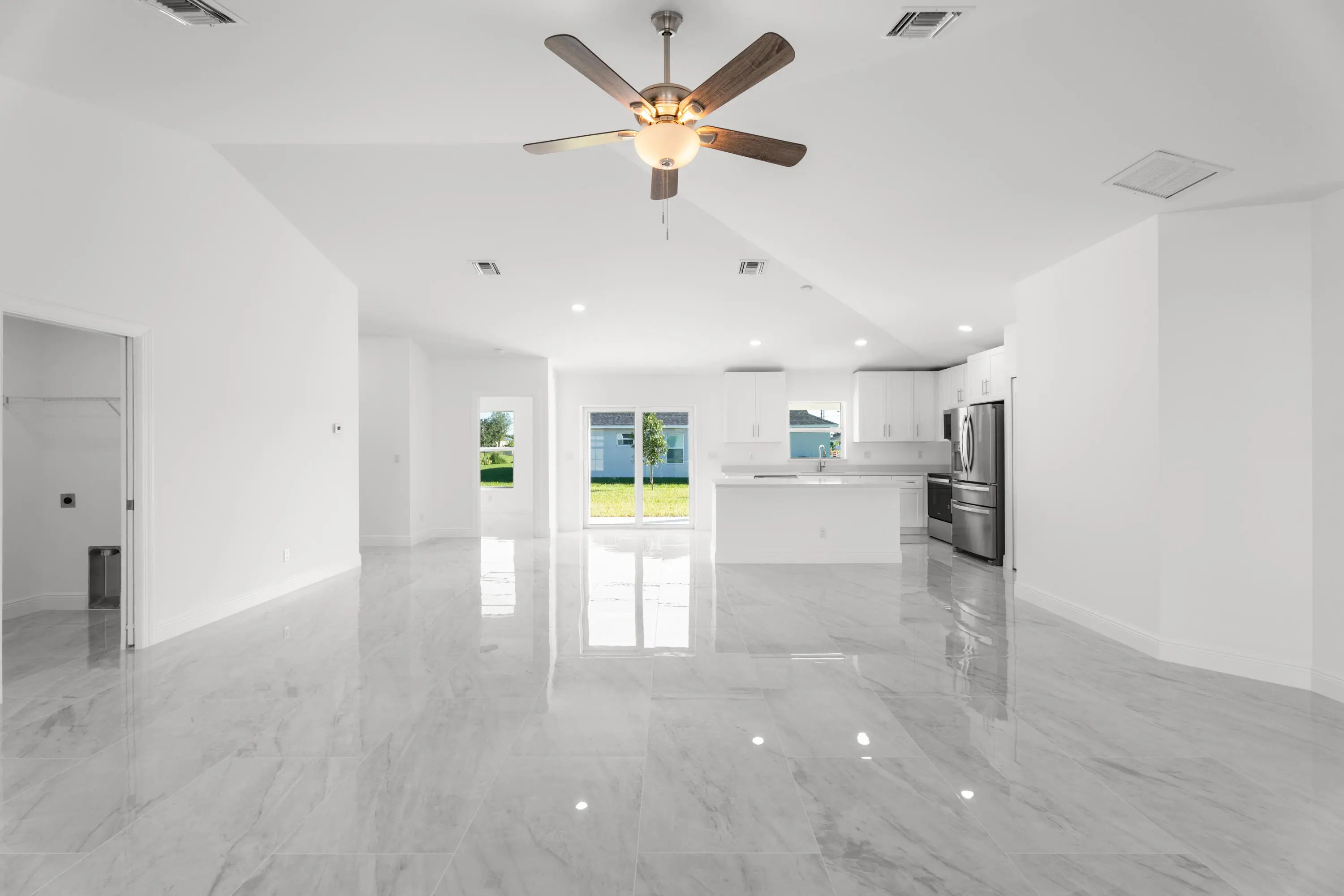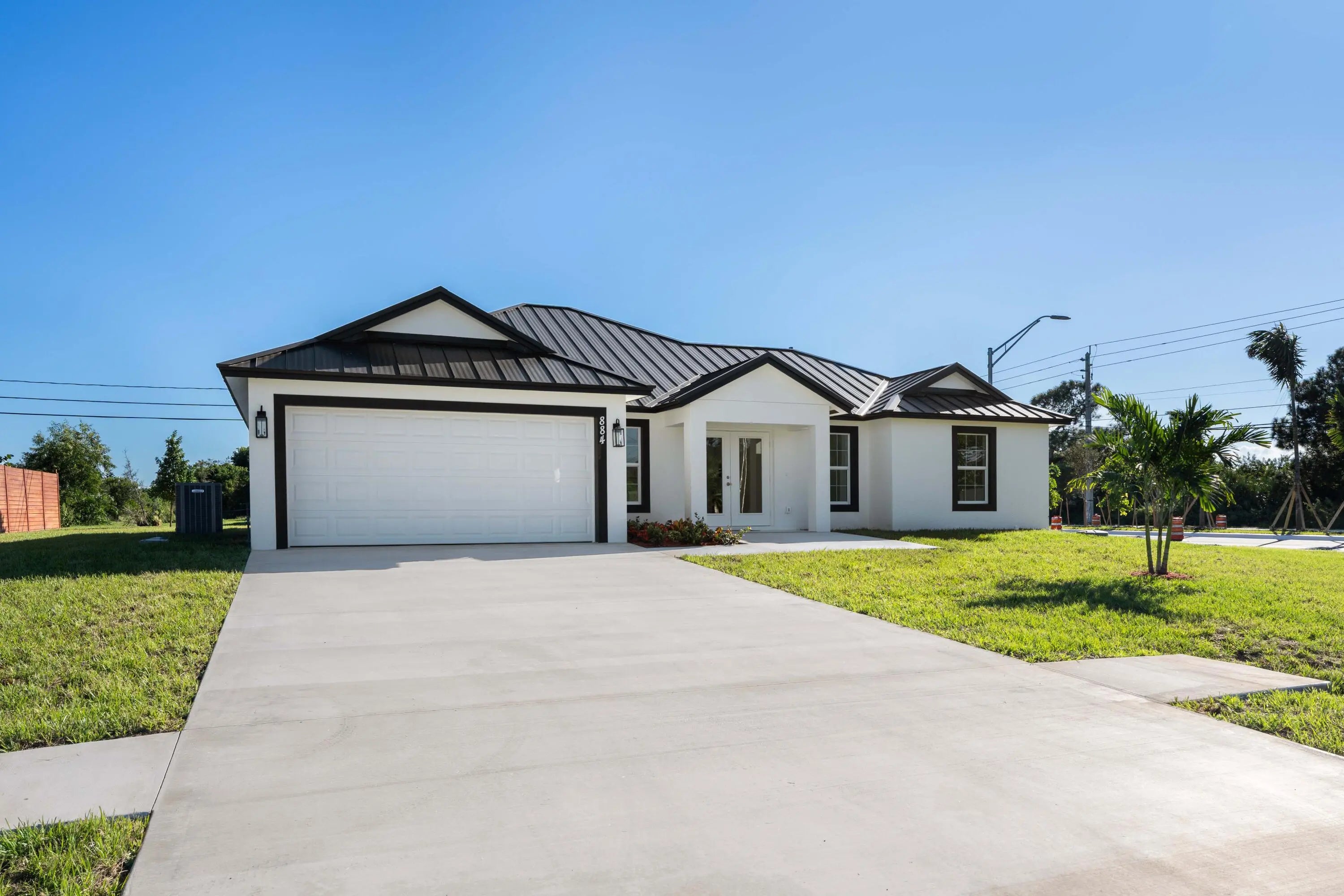 Step into luxury and style in this beautifully designed new construction home. Featuring a Standing Seam metal roof, PGT Impact windows and doors, Top Rated Icicle foam insulation (even over the garage). Covered entry, oversized driveway, huge corner lot. Open kitchen with Quartz, Stainless appliances. High ceilings, gorgeous large porcelain tile flooring throughout for a bright and seamless finish. Primary suite with dual walk-in closets, double sinks, separate tub and shower. This home is move-in ready and perfect for anyone looking to enjoy a low-maintenance, high-style lifestyle. Located in a growing neighborhood close to shopping, schools, and easy access to the Turnpike and I-95.