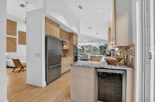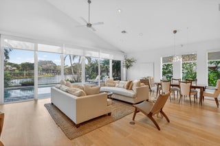 Discover refined single-story living in the prestigious Whisper Trace community of Broken Sound Country Club. This beautifully appointed 3-bedroom, 2-bath residence features soaring vaulted ceilings and rich wood flooring throughout, creating a warm and sophisticated ambiance. Enjoy breathtaking panoramic lake and golf course views from your private outdoor oasis complete with new pavers and a sparkling private pool the perfect setting for relaxing or entertaining. The gourmet kitchen is equipped with premium Thermador cooktop and oven, ideal for the culinary enthusiast. The spacious primary suite offers two generous walk-in closets and elegant custom built-in in the primary bathroom designed for luxury and functionality. Additional highlights include automatic blinds for convenience andstyle. This is South Florida living at its finest a serene retreat with impeccable finishes and unforgettable views.