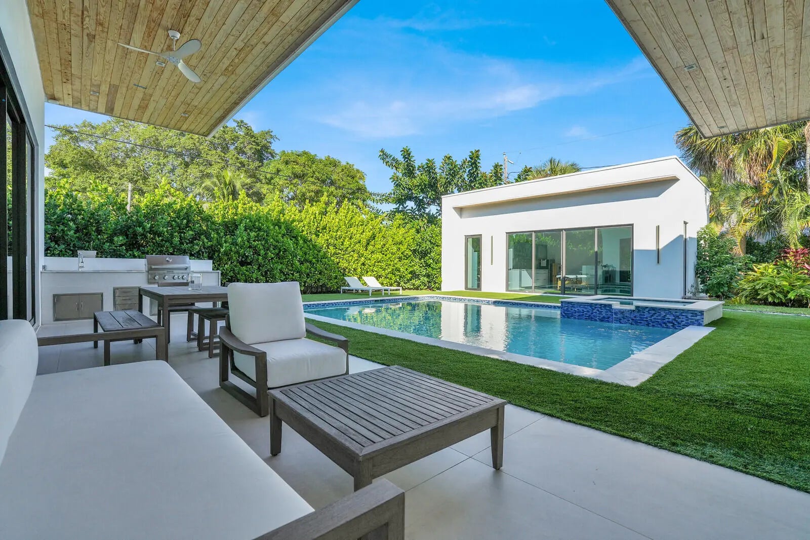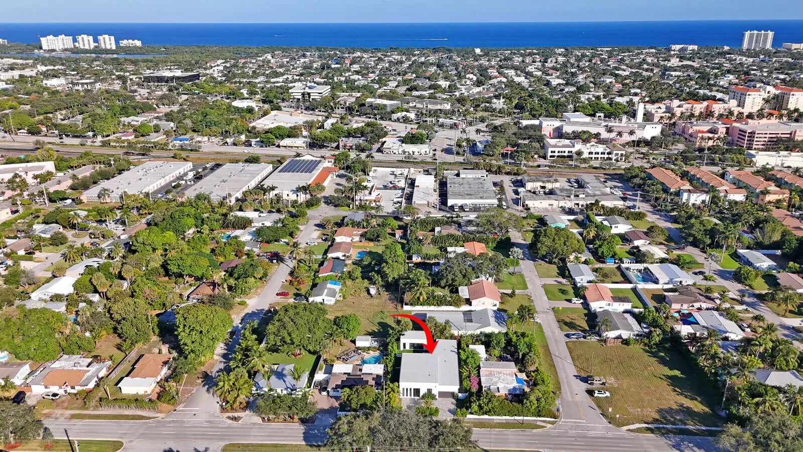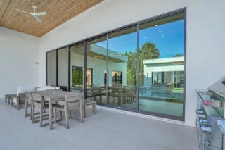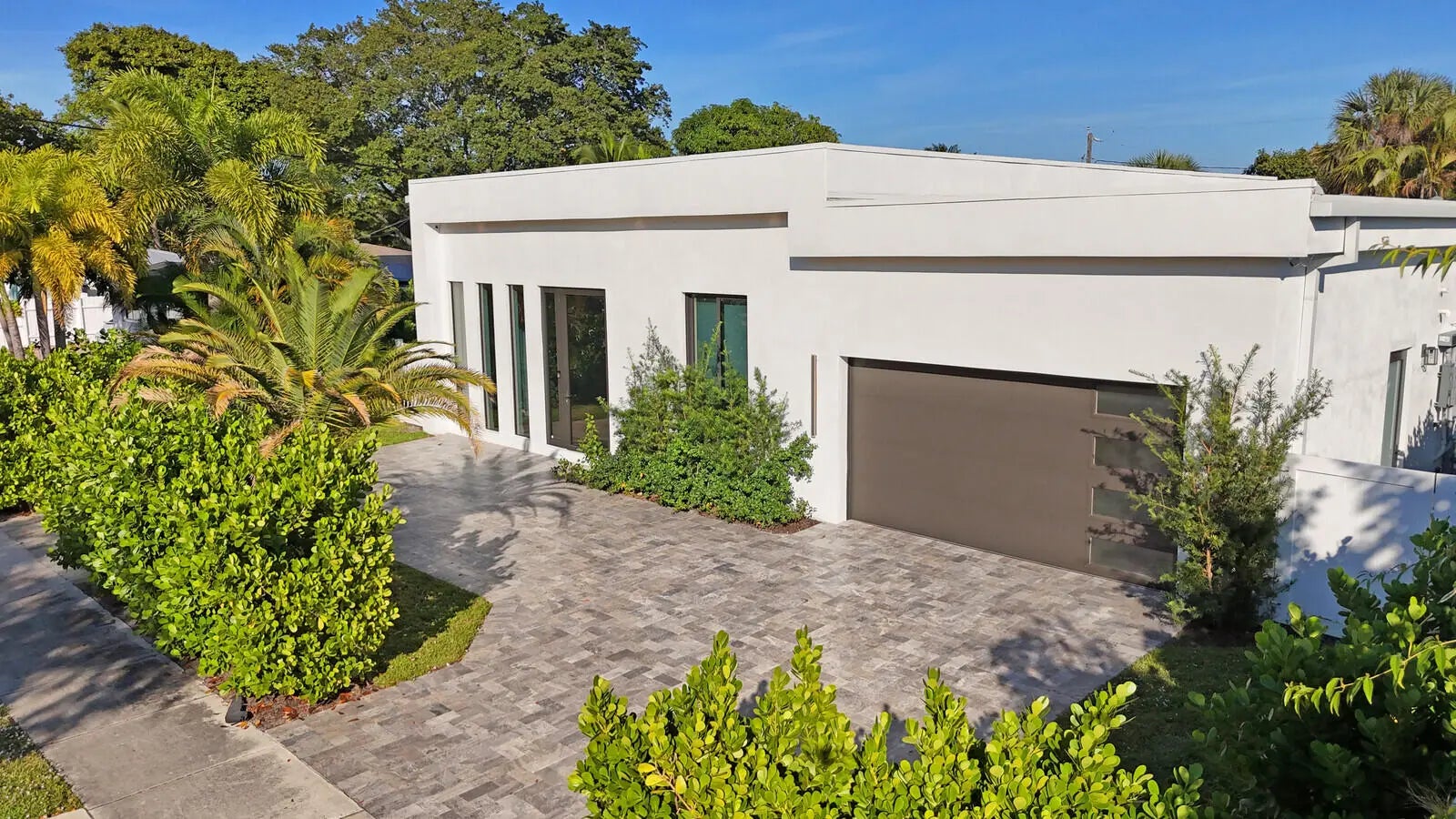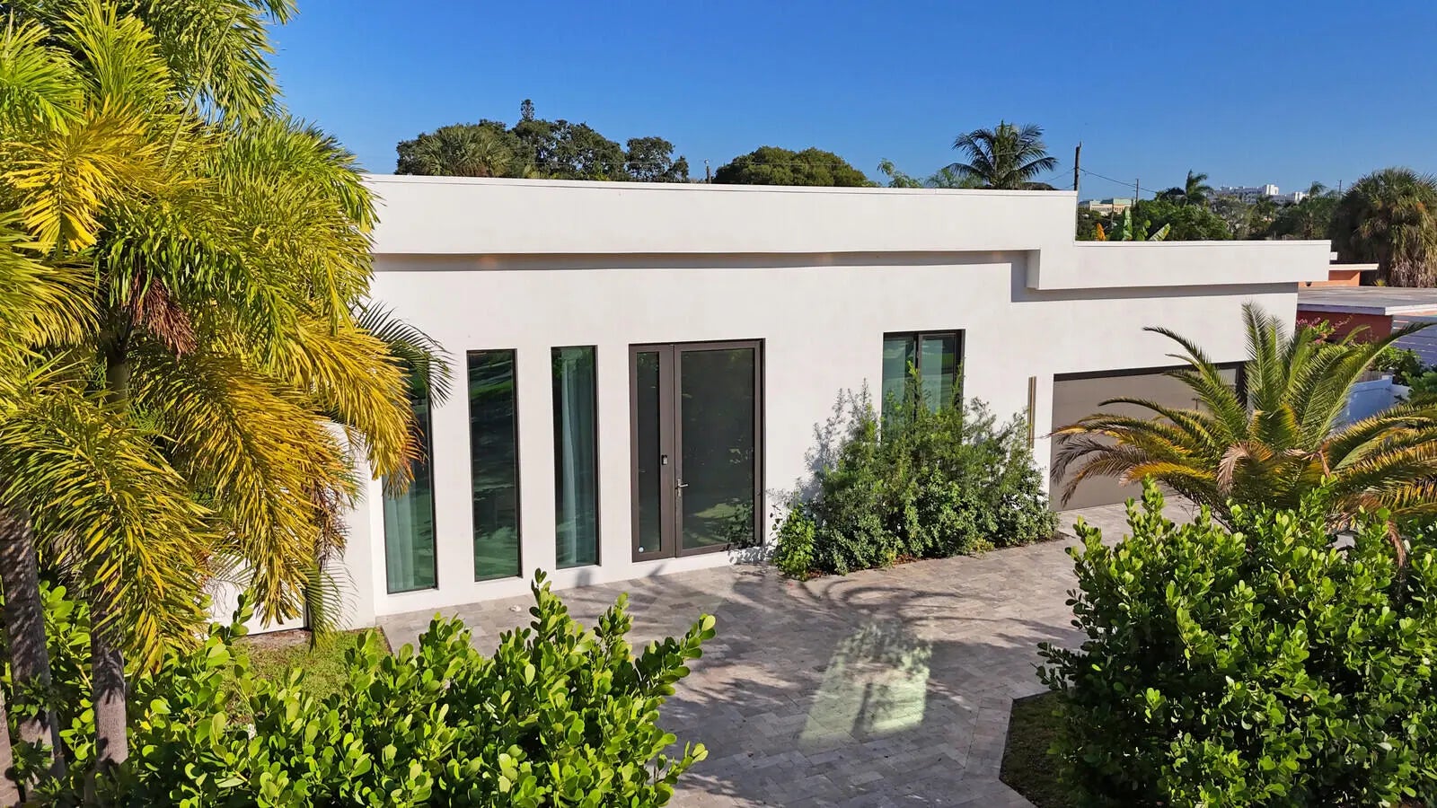 Welcome to East Boca, where refined architecture and resort-style living converge in this exceptional, newly built contemporary estate. Completed in 2023, this custom-designed residence offers approximately 3,200 square feet under air and over 4,200 square feet in total, thoughtfully curated to deliver both elevated design and everyday comfort.From the moment you arrive, the home makes a striking impression with its landscaped frontage, circular travertine driveway, and dramatic 10-foot Eurotech impact glass entry door. Solid construction, energy-efficient low-E impact windows and sliders, spray-foam insulation, and a pitched flat roof with gutters reflect a commitment to quality, durability, and modern performance.Inside, soaring ceilings--14 feet in the main living