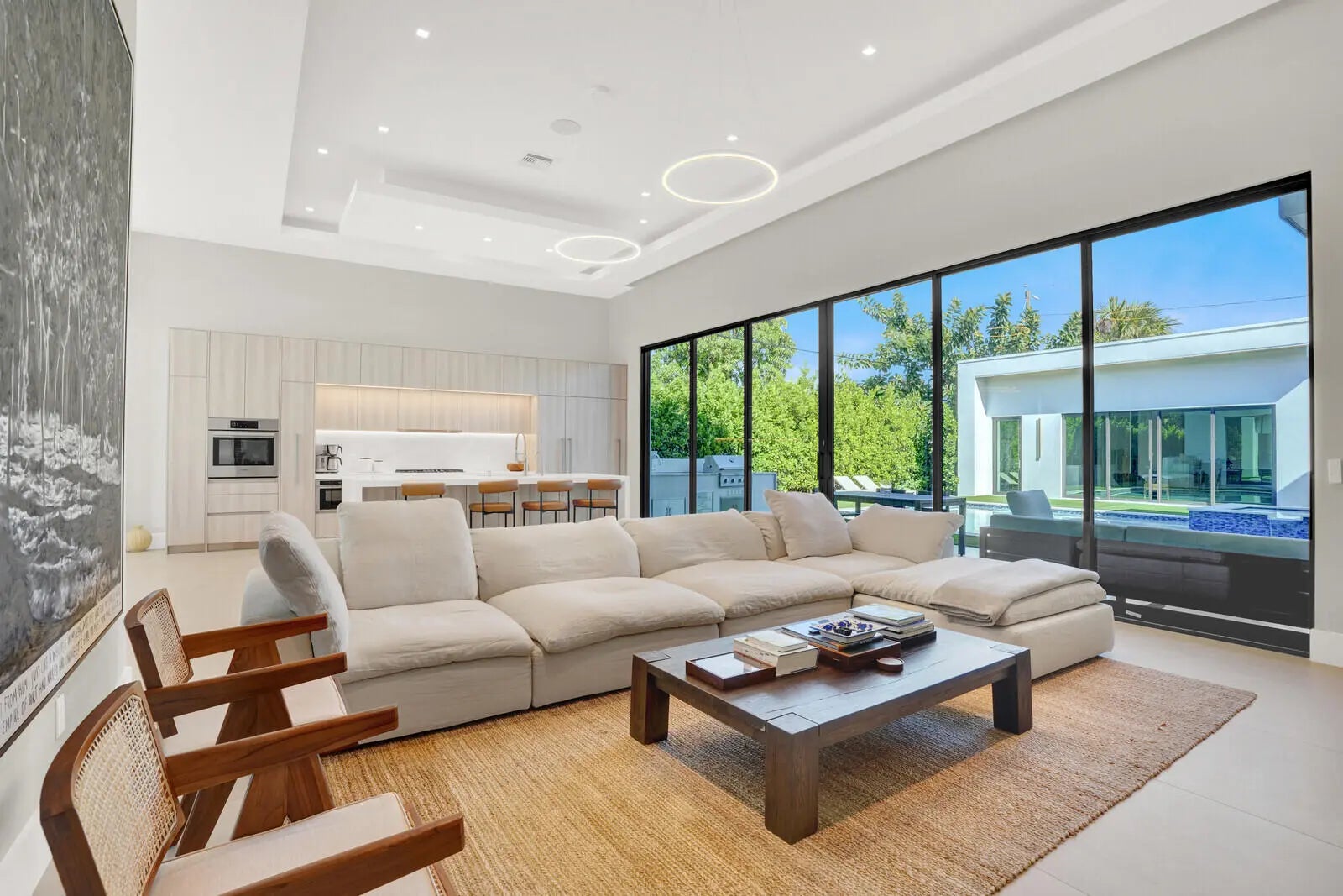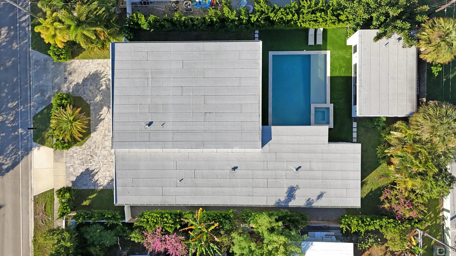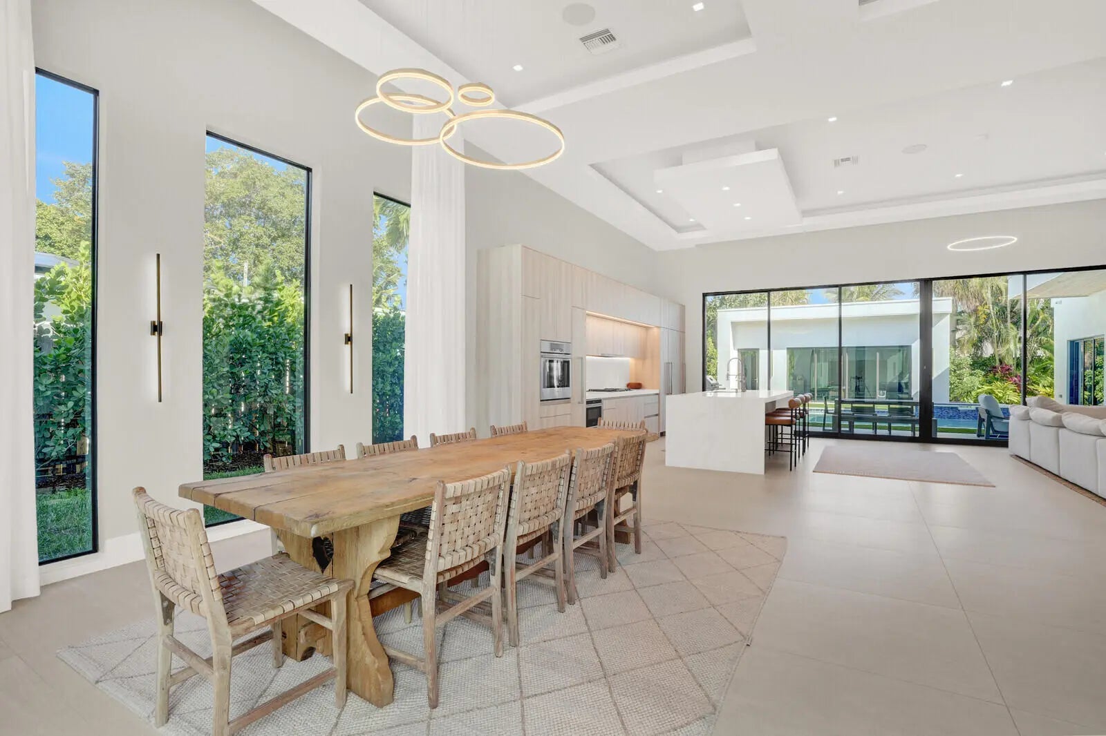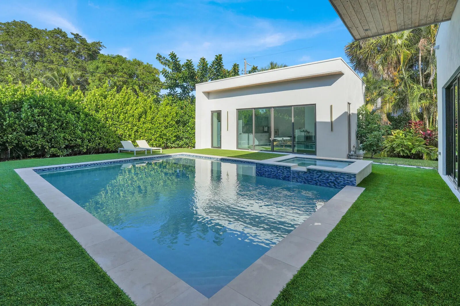 Welcome to East Boca, where refined architecture and resort-style living converge in this exceptional, newly built contemporary estate. Completed in 2023, this custom-designed residence offers approximately 3,200 square feet under air and over 4,200 square feet in total, thoughtfully curated to deliver both elevated design and everyday comfort.From the moment you arrive, the home makes a striking impression with its landscaped frontage, circular travertine driveway, and dramatic 10-foot Eurotech impact glass entry door. Solid construction, energy-efficient low-E impact windows and sliders, spray-foam insulation, and a pitched flat roof with gutters reflect a commitment to quality, durability, and modern performance.Inside, soaring ceilings--14 feet in the main living