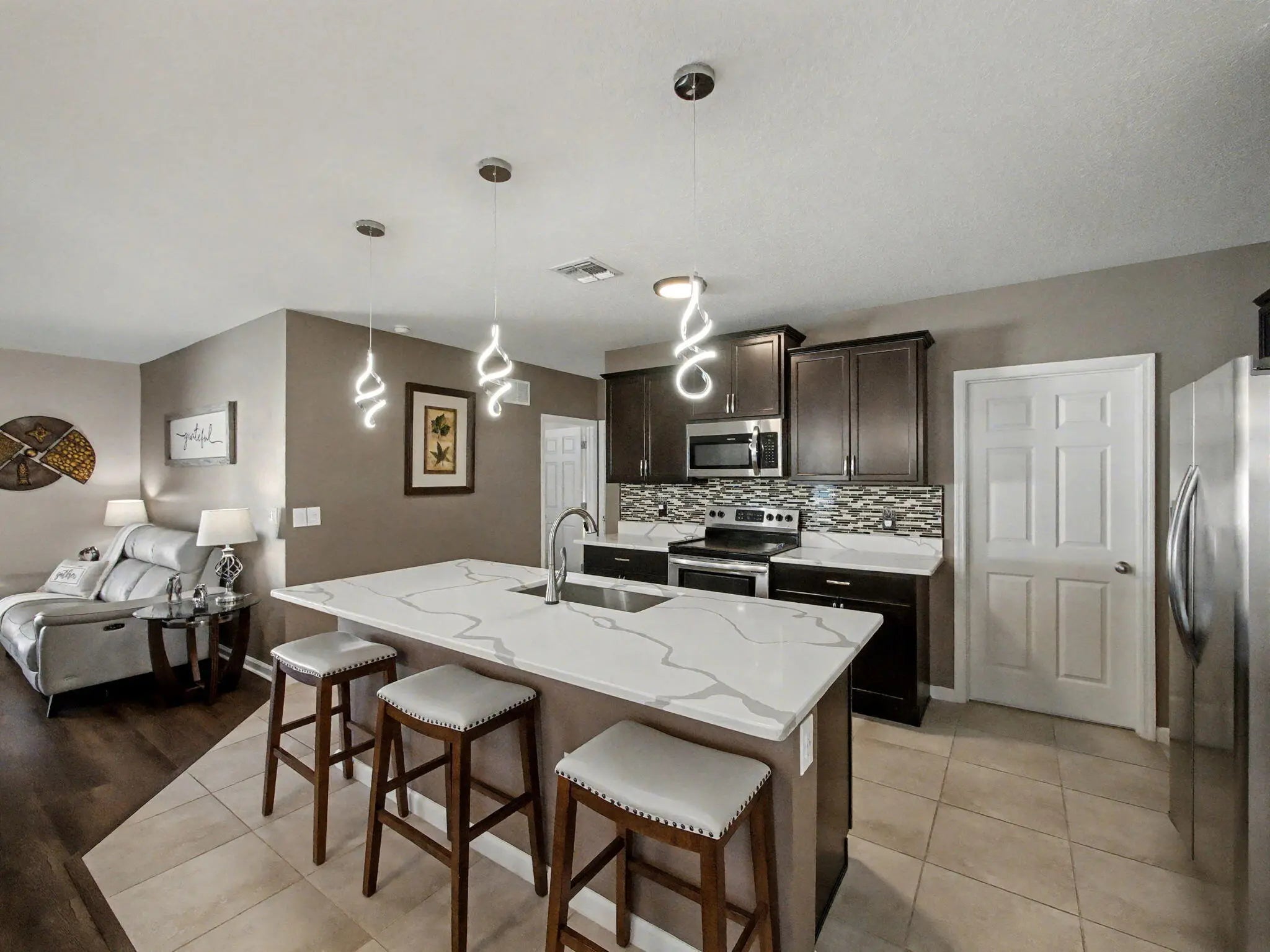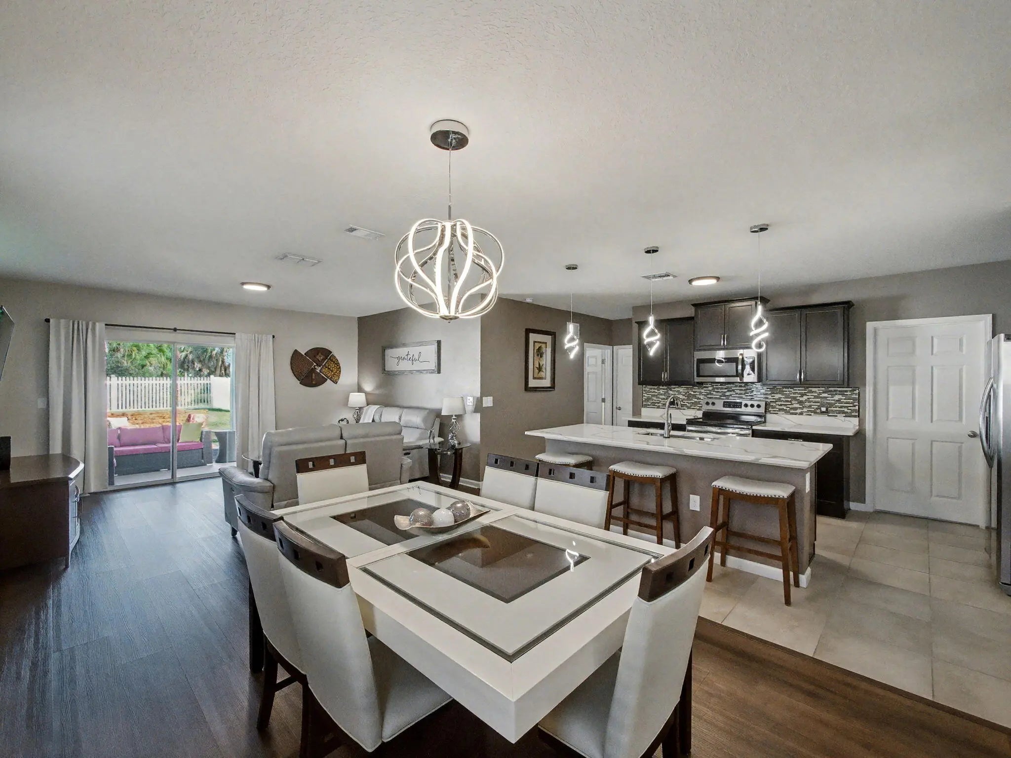 Welcome to this beautifully updated 5-bedroom, 3-bathroom Robie model home, ideally situated in the sought-after community of Victoria Parc at Tradition. Designed with both space and versatility in mind, this residence offers a well-appointed layout that effortlessly accommodates family living, guests, or a home office setup. Upon entering, you're greeted by a bright, open interior enhanced by tile flooring and wood laminate throughout the main living areas, delivering a polished yet warm aesthetic. The updated kitchen is a true centerpiece, featuring modern finishes, generous cabinetry, and plenty of counter space--perfect for everything from everyday meals to entertaining.