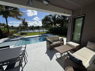 Upgraded Tahiti Expanded model on a premium lake lot in the sought after Lotus community. Upon entering, soaring vaulted ceilings, 8 inch moldings, and expansive 24 x 48 Italian porcelain tile floors define the main living areas. The expanded open concept great room creates a spacious and inviting atmosphere.The kitchen features brand new porcelain countertops and backsplash with sleek modern finishes. The primary suite serves as a private retreat with French doors leading to the covered patio. Two additional bedrooms allow for versatile use, and the remodeled garage includes vinyl flooring.Enjoy fully fenced outdoor living with a modern pool, expansive travertine patio, outdoor shower, kitchenette, lush privacy landscaping, and tranquil lake views. Move in ready