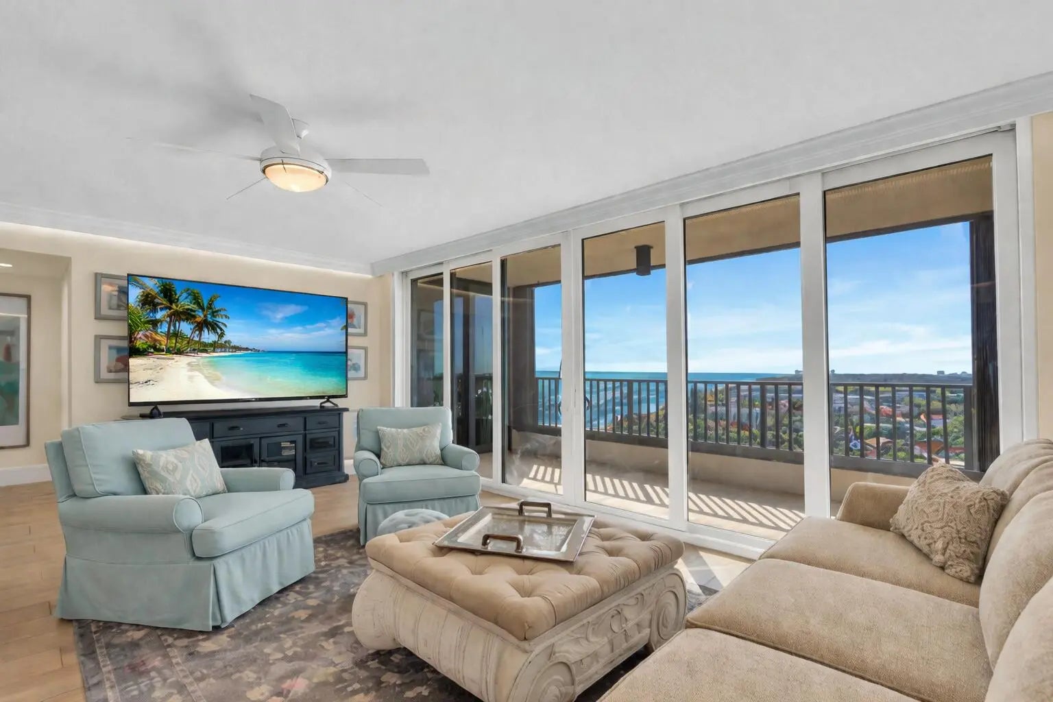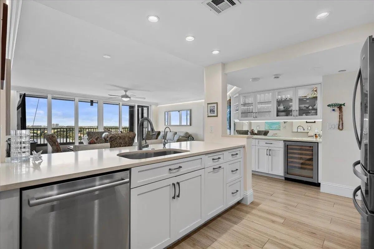 Perched atop the building, this exceptional top-floor penthouse offers breathtaking, unobstructed ocean and city views. This rare south-facing residence captures stunning sunrises over the Atlantic and glowing sunsets to the west, filling the home with natural light throughout the day. Completely renovated, this direct oceanfront condo features superior finishes, light-up crown molding, and an open layout designed to maximize panoramic views. The chef's kitchen offers a spacious island for preparation and entertaining, plus a bar area with a wine fridge. Spa-inspired bathrooms include a rainfall shower system with handheld, and a custom dual-entry walk-in closet in the primary suite. An elevated setting offers privacy, serenity, and a year-round vacation lifestyle.