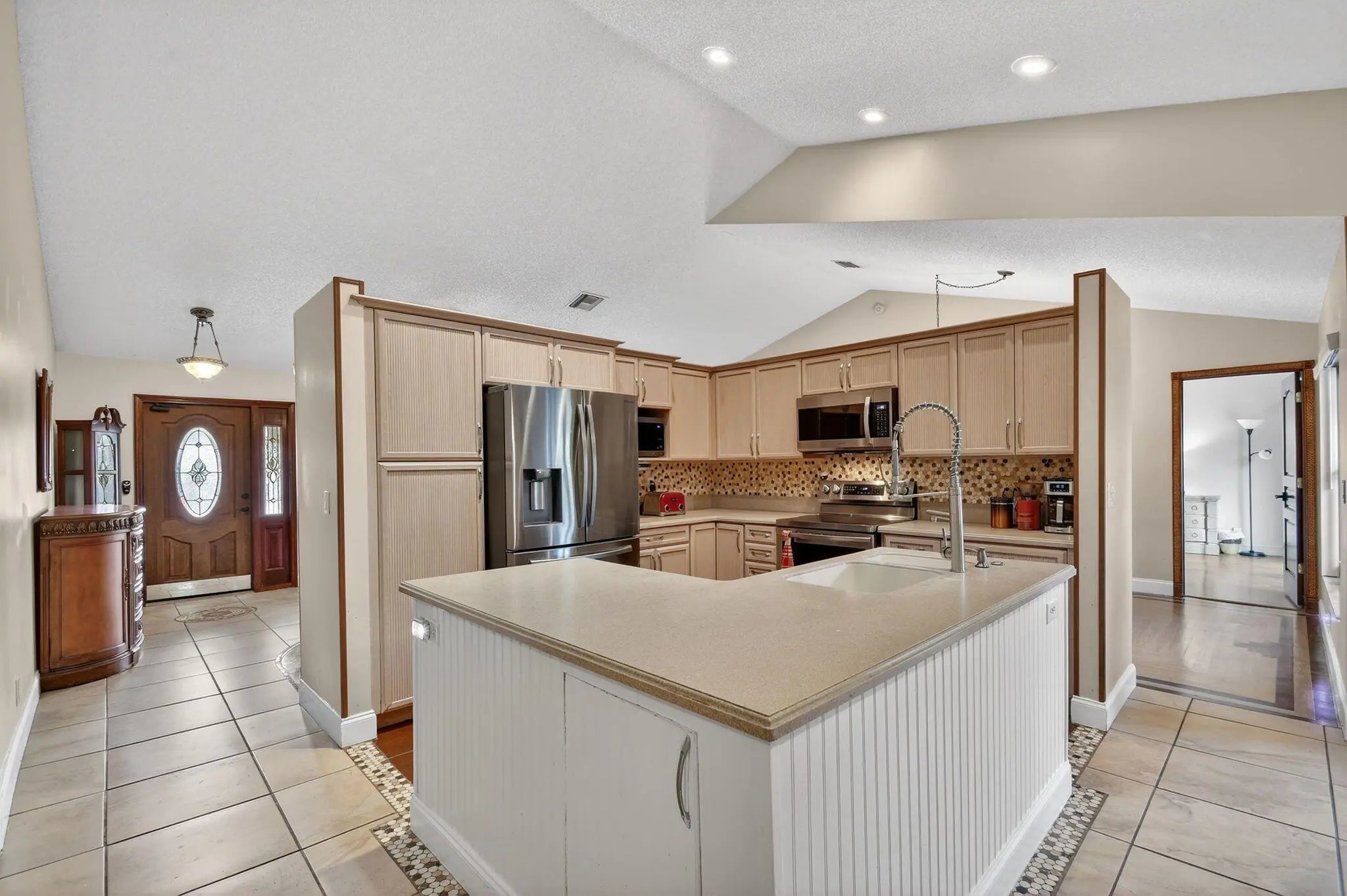 Welcome to your lakefront sanctuary in the heart of West Boynton Beach. This immaculate, ranch-style residence in the sought-after Sun Valley community offers a rare blend of space, serenity, and modern convenience. From the moment you arrive, the meticulously maintained rock garden sets a tranquil tone that carries through the interior's vaulted ceilings and elegant tile and wood flooring. The home's expansive layout is anchored by a central kitchen featuring a large island and stainless steel appliances, seamlessly connecting the formal dining room, living room, and family room for effortless entertaining.Versatility is a hallmark of this property, which features a private office built into the garage--which the seller can remove if preferred--as well as a fully air-conditioned Florida