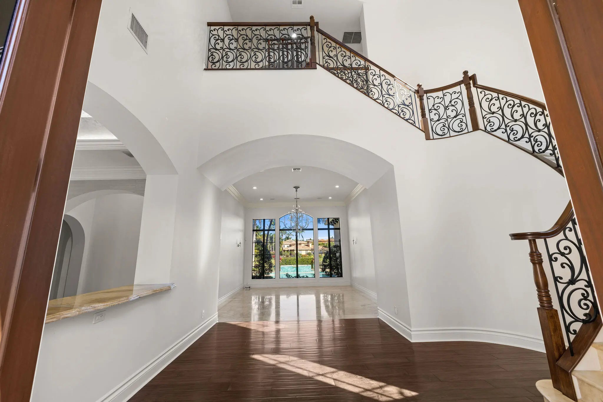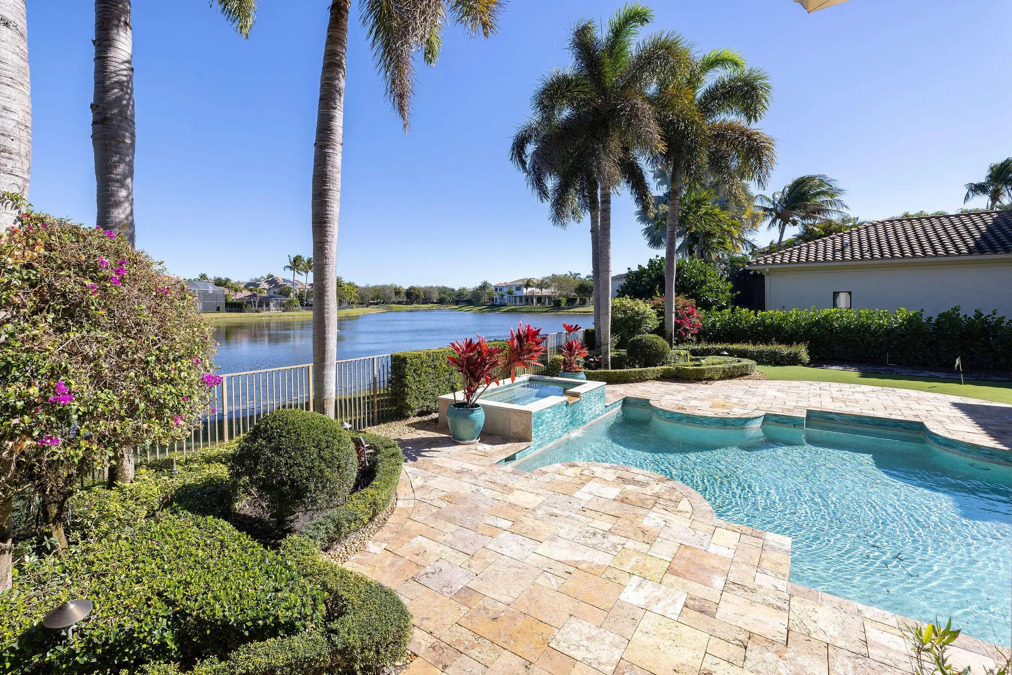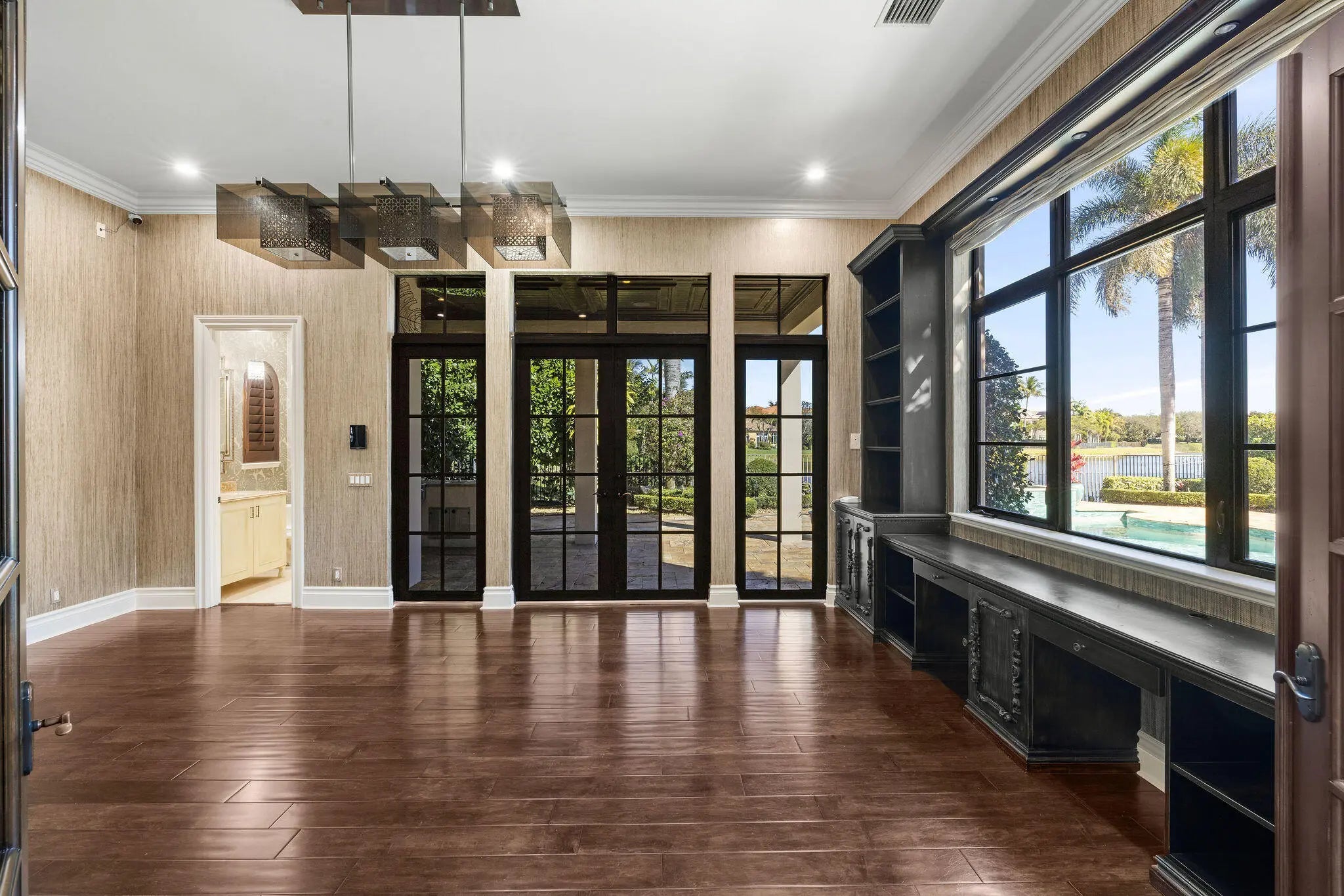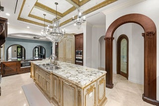 Experience refined elegance in this extraordinary custom estate where timeless design meets exceptional craftsmanship. A grand double-height foyer and sweeping statement staircase create an unforgettable first impression, opening to a radiant living space filled with natural light and captivating views of the shimmering pool and tranquil lake beyond.Designed for both everyday living and elevated entertaining, the gourmet chef's kitchen is a masterpiece, appointed with premium Sub-Zero, Wolf, Thermador, and Miele appliances, complemented by a generous walk-in pantry and seamless flow into the family room, intimate dining area, and sophisticated club room. Throughout the residence, exquisite custom woodwork and designer finishes showcase meticulous attention to detail.