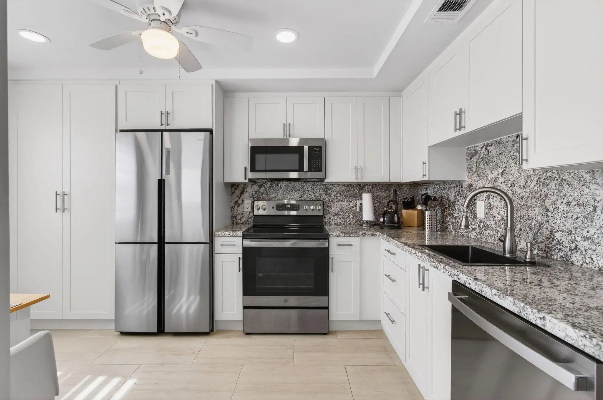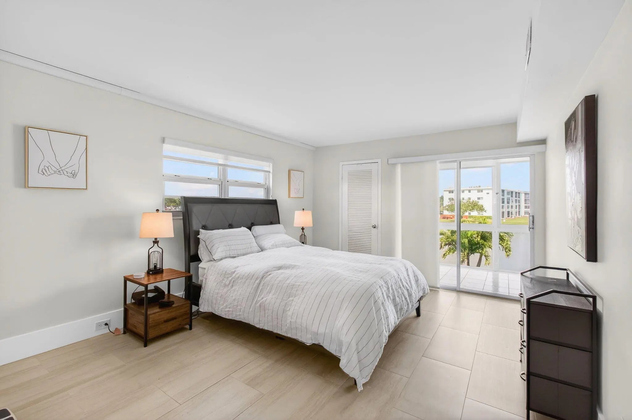 Beautifully renovated FURNISHED lakefront corner unit for rent in gated Exeter at Century Village, a 55+ active adult community. Enjoy serene water views from every room with impact glass in this bright residence featuring an open-concept layout and updated finishes throughout. The sunny eat-in kitchen offers ample cabinet and counter space. The spacious primary suite opens to a tiled, glassed-in balcony perfect for year-round relaxation with panoramic lake views. Both bathrooms feature step-in showers. Century Village amenities include a clubhouse, fitness center, theater, pools, tennis, shuffleboard, bocce, walking paths, and courtesy shuttle with easy access to Boca Raton shopping and dining.