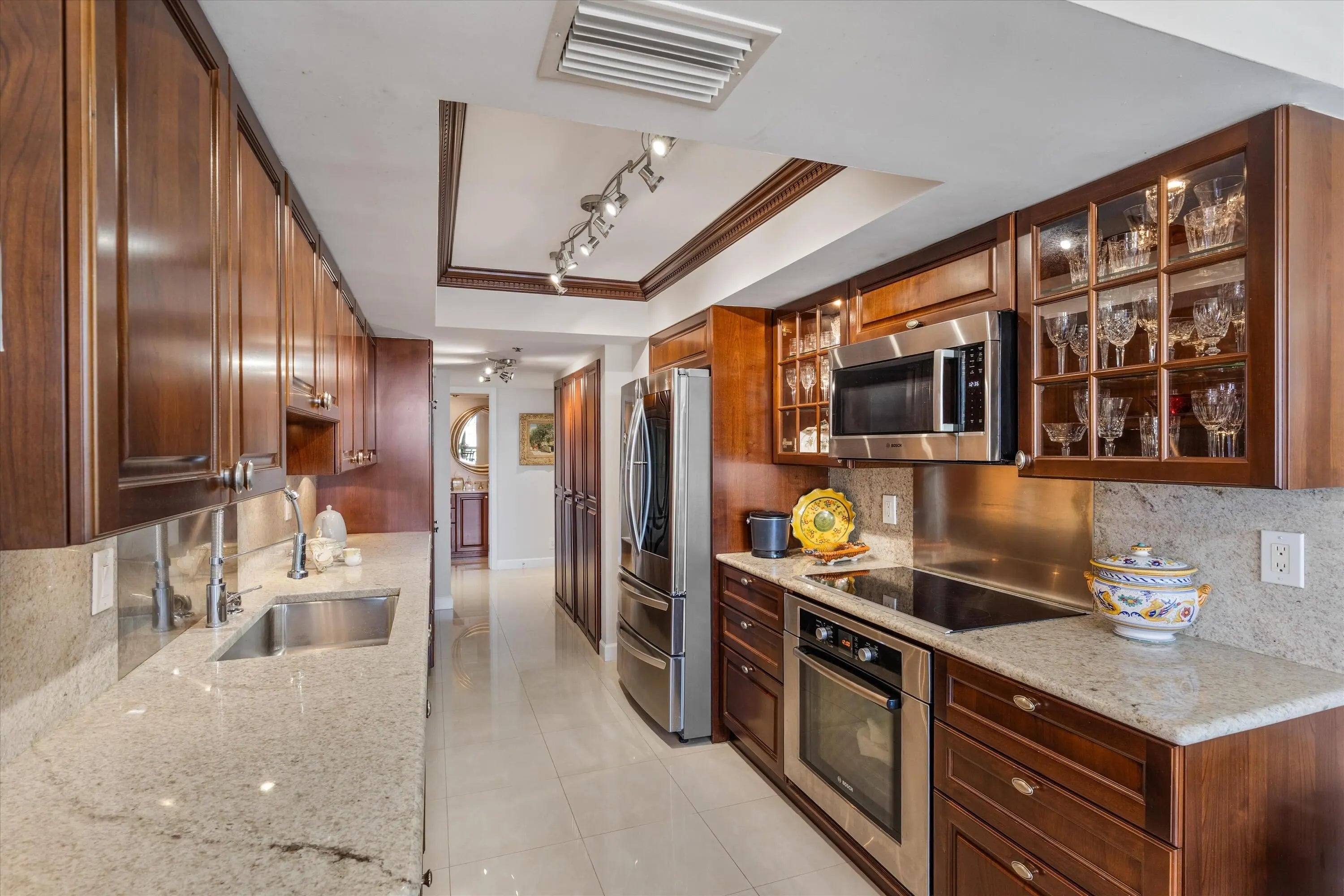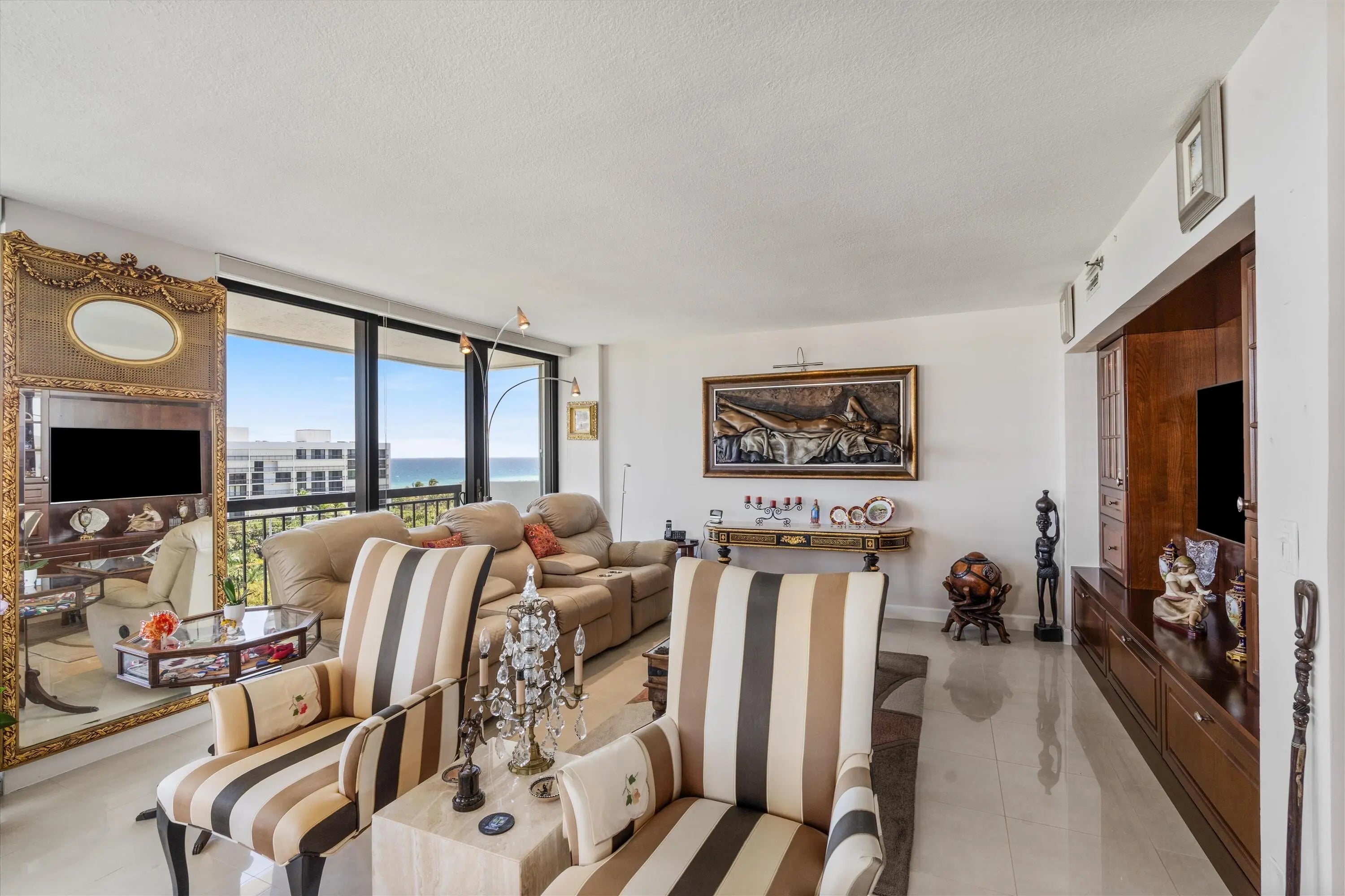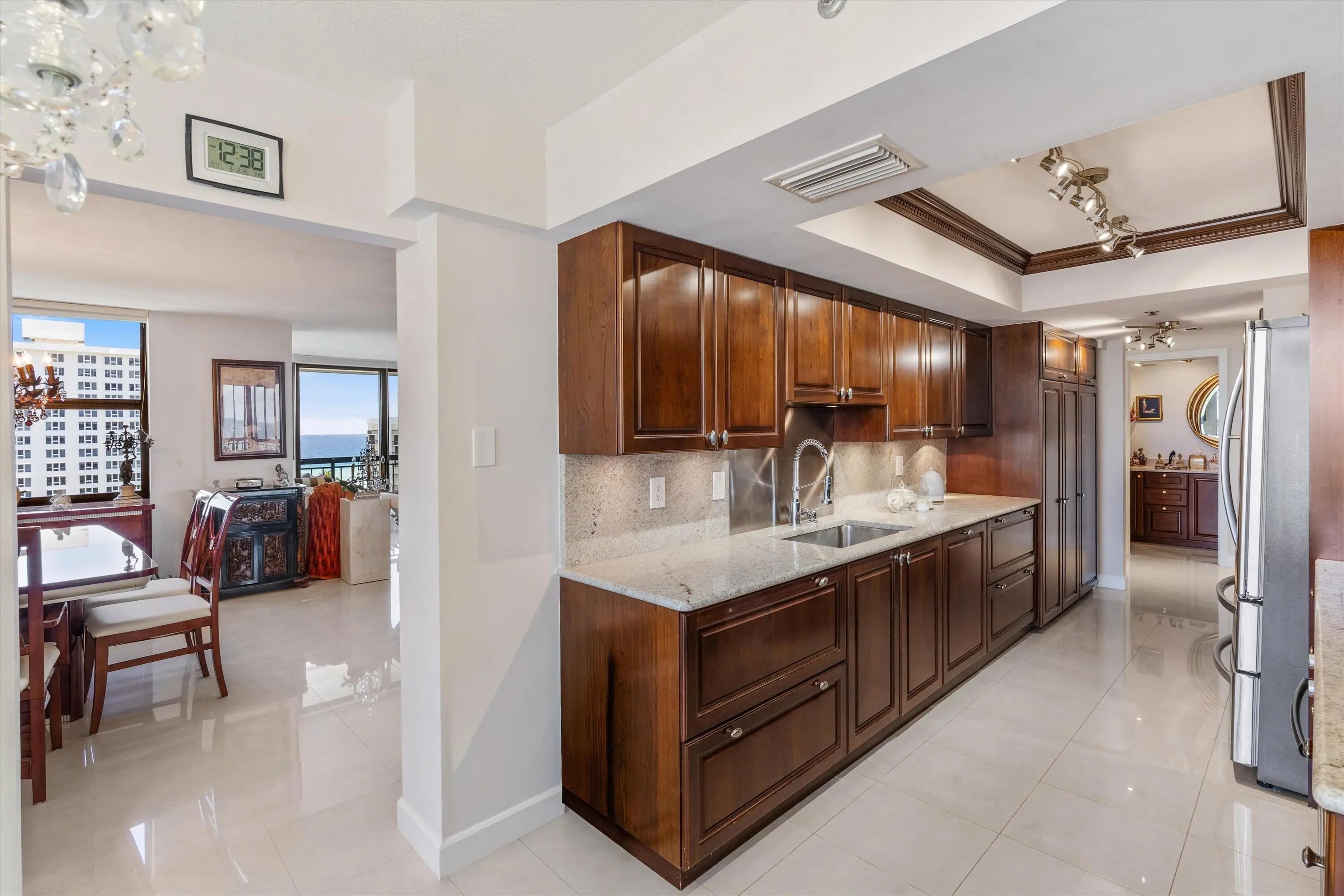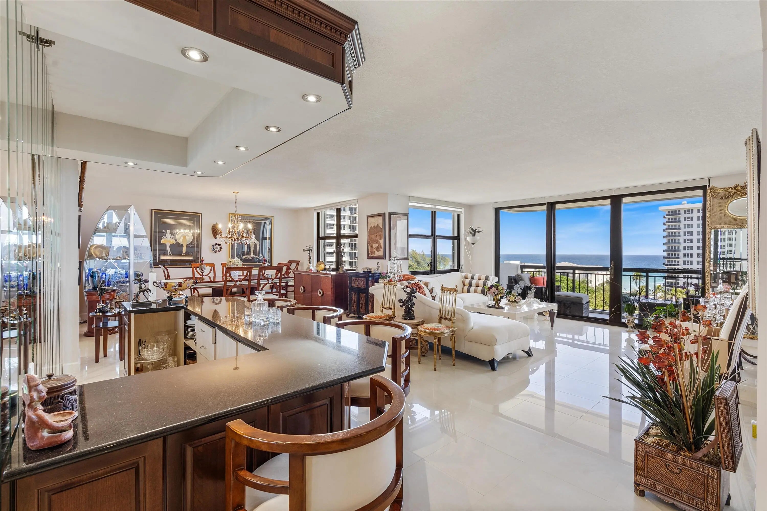 An OCEAN VIEW that'll never go away! Ideally located between the pristine Boca beaches, nature parks, and intracoastal, La Fontana has it ALL. Originally a 3BR/2.5BA, the third bedroom is currently an open den and can easily be converted back. The kitchen boasts Mahogany wood cabinets with intricate wood detailing and Bosch appliances. The neutral tile floors, bar seating area and extra natural light makes this the perfect entertaining suite. This unit offers hurricane impact windows and shutters to ensure maximum safety. All closets have custom built-in cabinets. The A/C + WH were replaced in 2023. La Fontana offers private beach access, covered parking, newly renovated pool, ample grass area, dock space when available, a gym, sauna and much more. No leasing permitted.