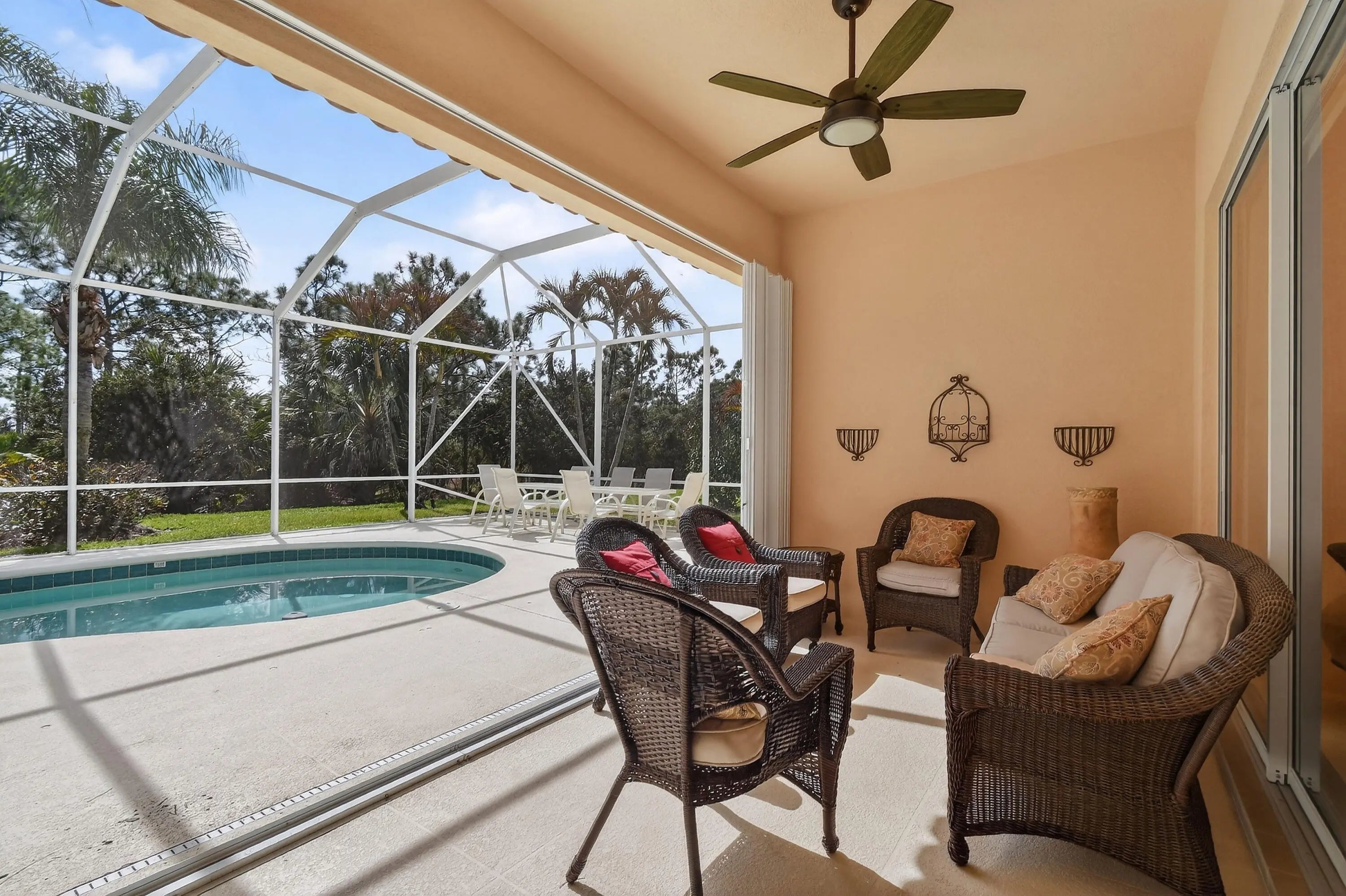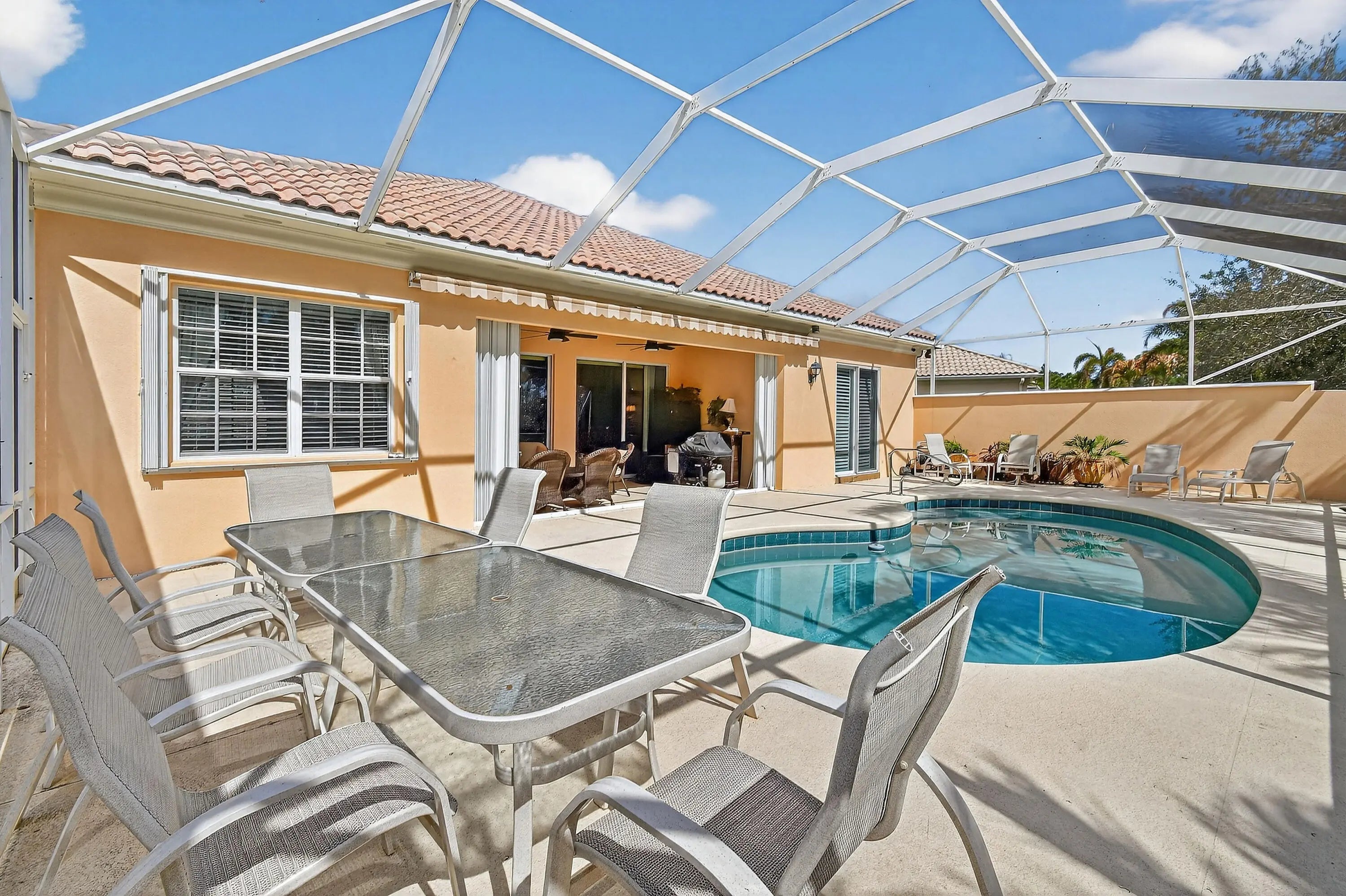 Welcome to this beautifully maintained 4BR/3BA pool home with 2,493 sq ft of living space in Hobe Sound. Thoughtfully designed for comfort and entertaining, it features formal and informal living spaces, a spacious primary suite with Tommy Bahama furnishings, walk-in closet, and large ensuite bath. The open layout flows to a screened-in pool and covered patio, perfect for indoor-outdoor living and entertaining. Offered fully furnished with high-end finishes, this move-in ready home is minutes from beaches, golf, parks, and local dining, capturing the best of the Hobe Sound lifestyle.