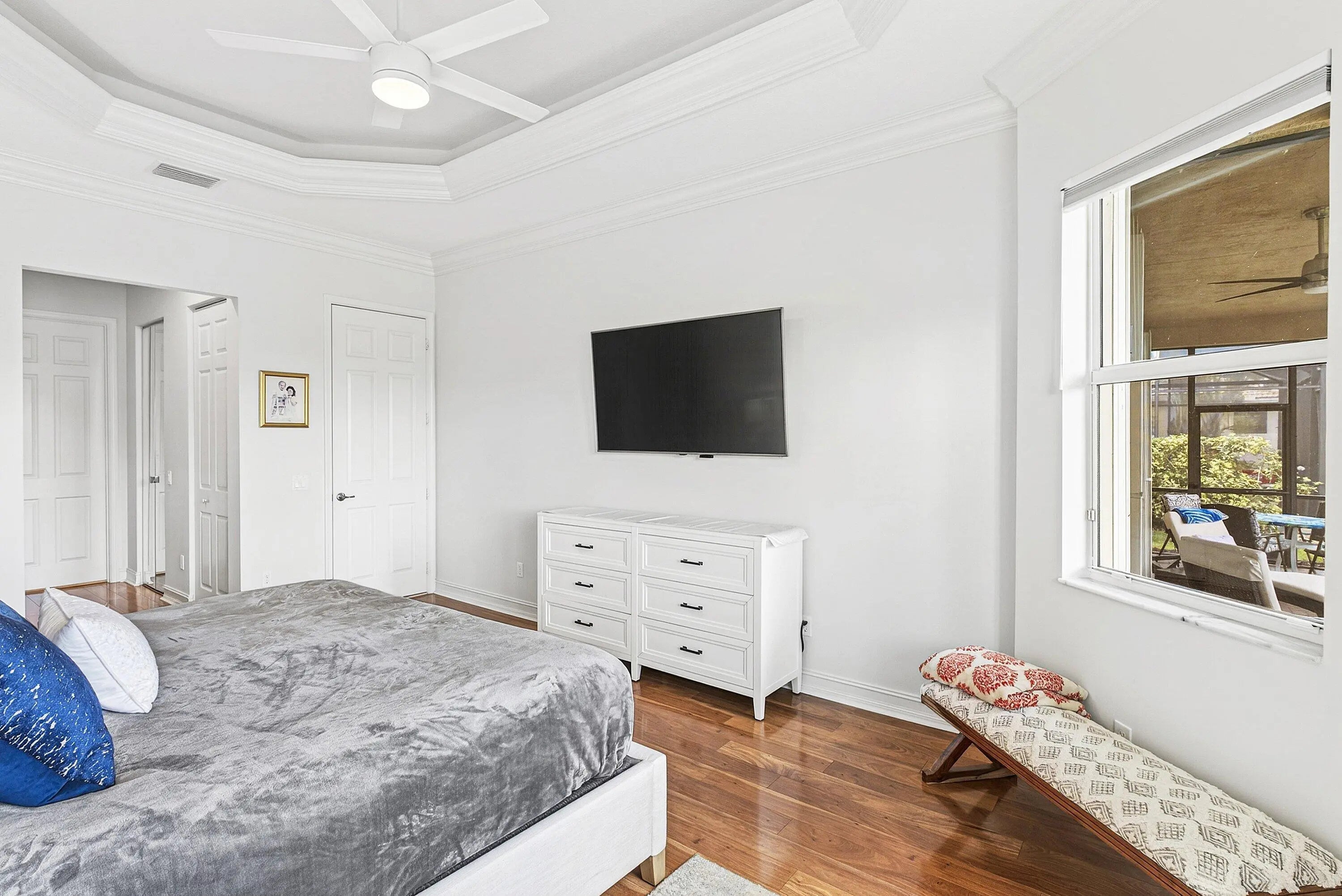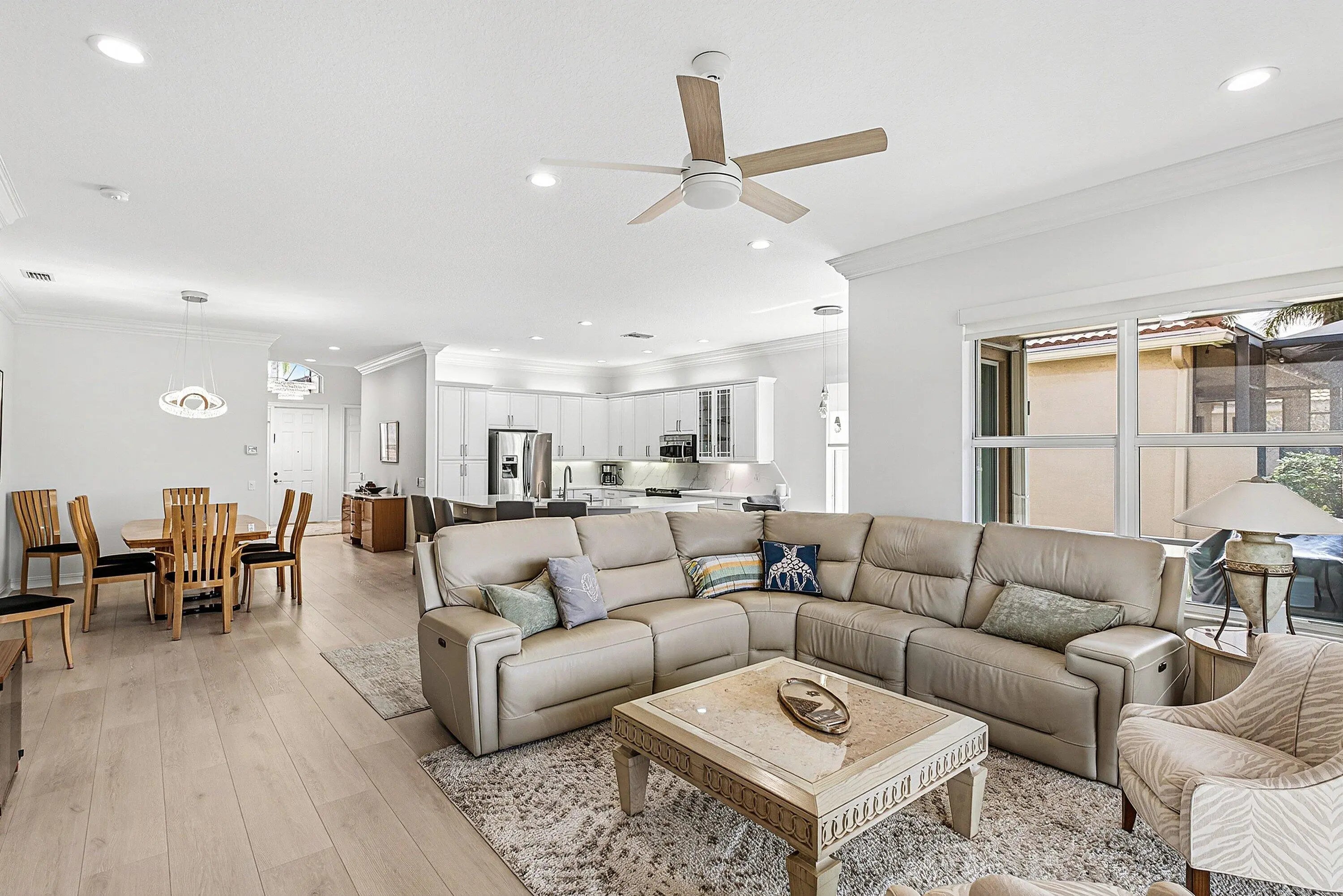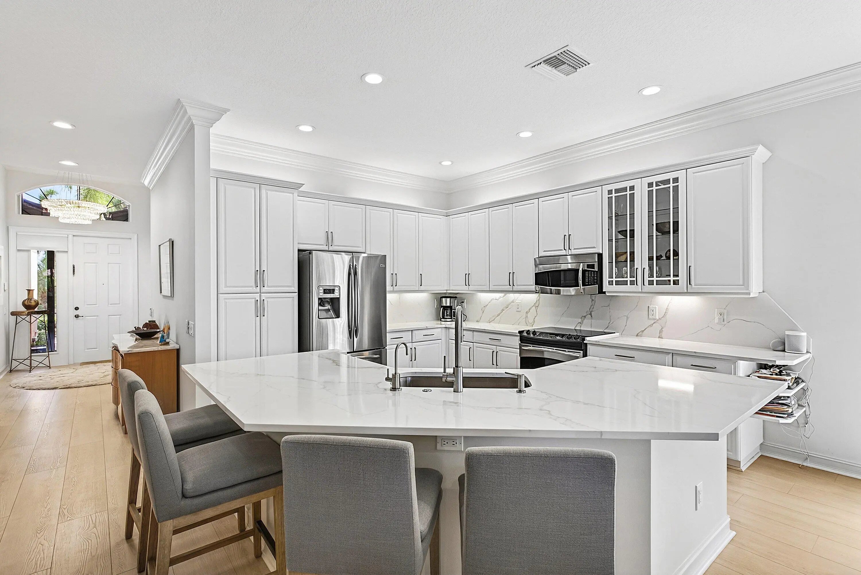 Stunning Atlantic Grand on a prime homesite! This peaceful center-lake lot offers beautiful water views and is just a short stroll to the clubhouse. The home features numerous upgrades and thoughtful updates throughout, including light laminate flooring, a striking quartz center island with matching backsplash, extended countertops, white cabinetry with pull-outs and tray shelving, an updated powder room, LED high-hat lighting, elegant window treatments, and gorgeous chandeliers. Exterior lighting and beautifully refreshed landscaping add to the home's charm. Enjoy the newly renovated clubhouse with a spectacular social hall, cafe, card rooms, state-of-the-art fitness center, pickleball, tennis, bocce, pools, shows, lectures, clubs, and a full-time Social Director. Welcome home!!!