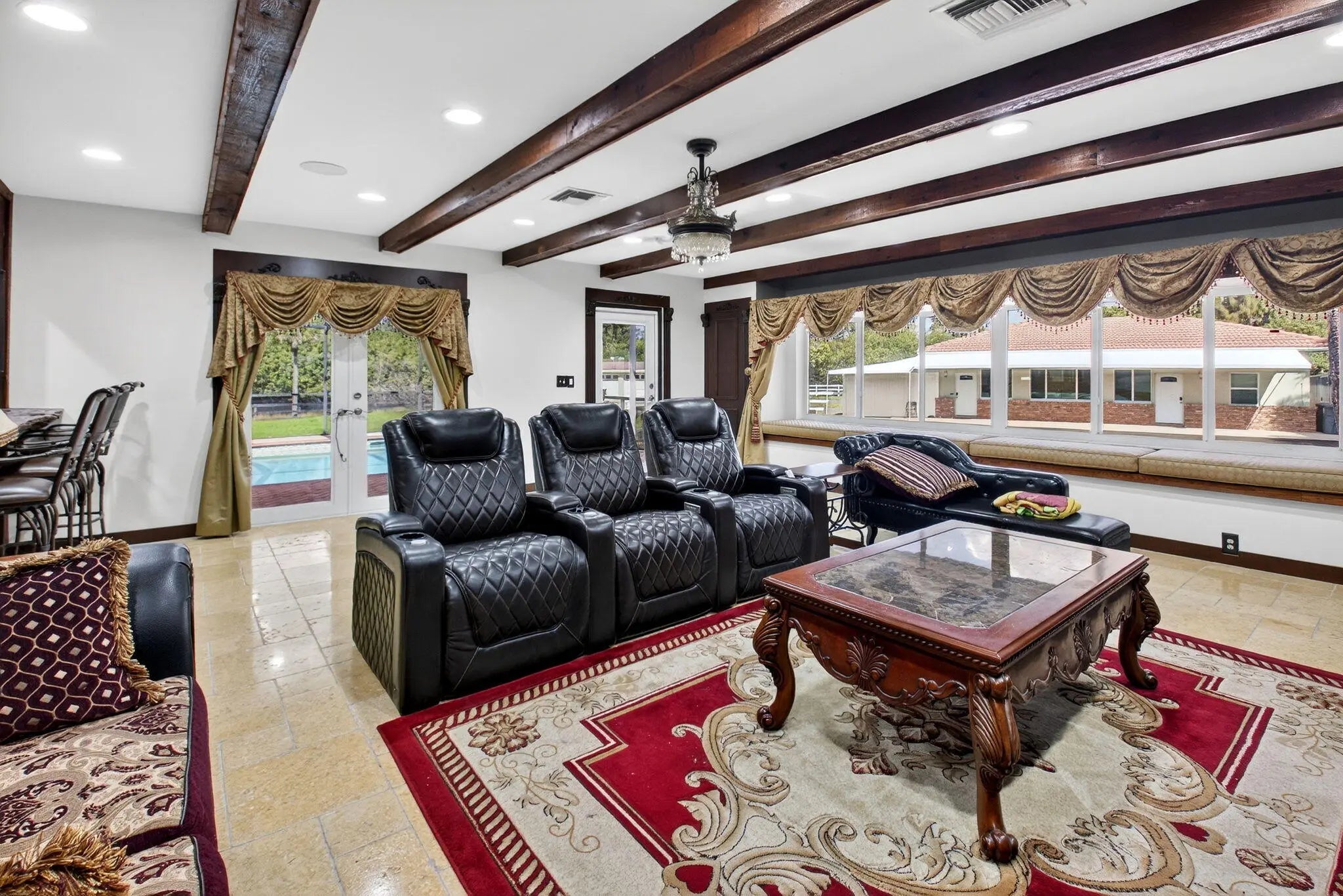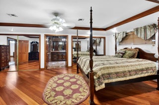 Welcome to an extraordinary five-acreestate inspired by rustic architecture, located within the prestigious gated enclave of Tierra Del Rey and featuring a dedicated private entrance gate to ensure privacy and security. The community is approved for equestrian activities and welcomes horses. This secluded estate provides unmatched serenity & resides at the end of a quiet drive, adjacent to a canal, offering expansive views and tranquil surroundings. The spacious residence can be leased partially furnished or unfurnished. It includes four bedrooms, four bathrooms, well-appointed living spaces suitable for both formal entertaining and comfortable daily life. Interior highlights consist of an open floor plan with abundant natural light, tile and wood flooring throughout.