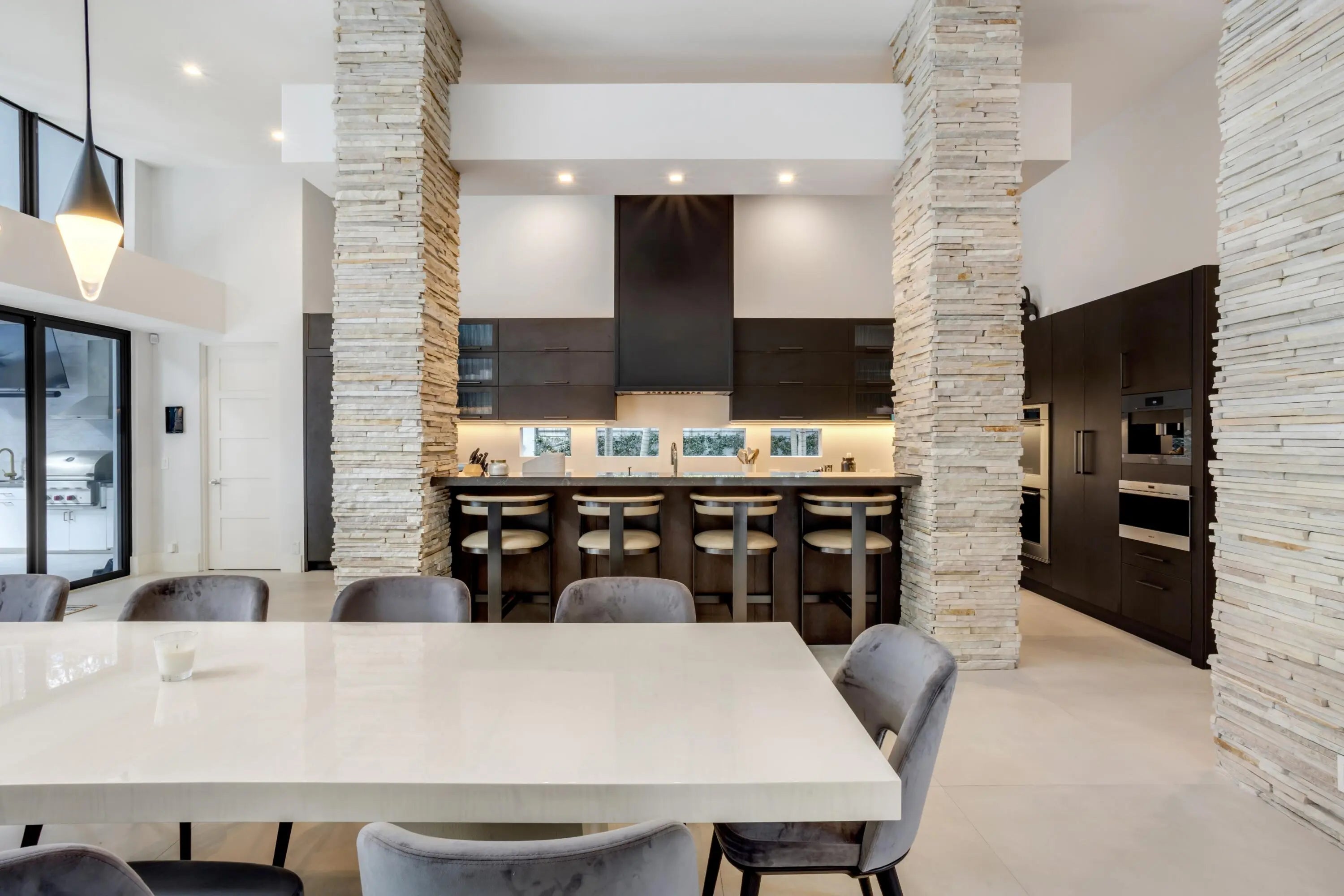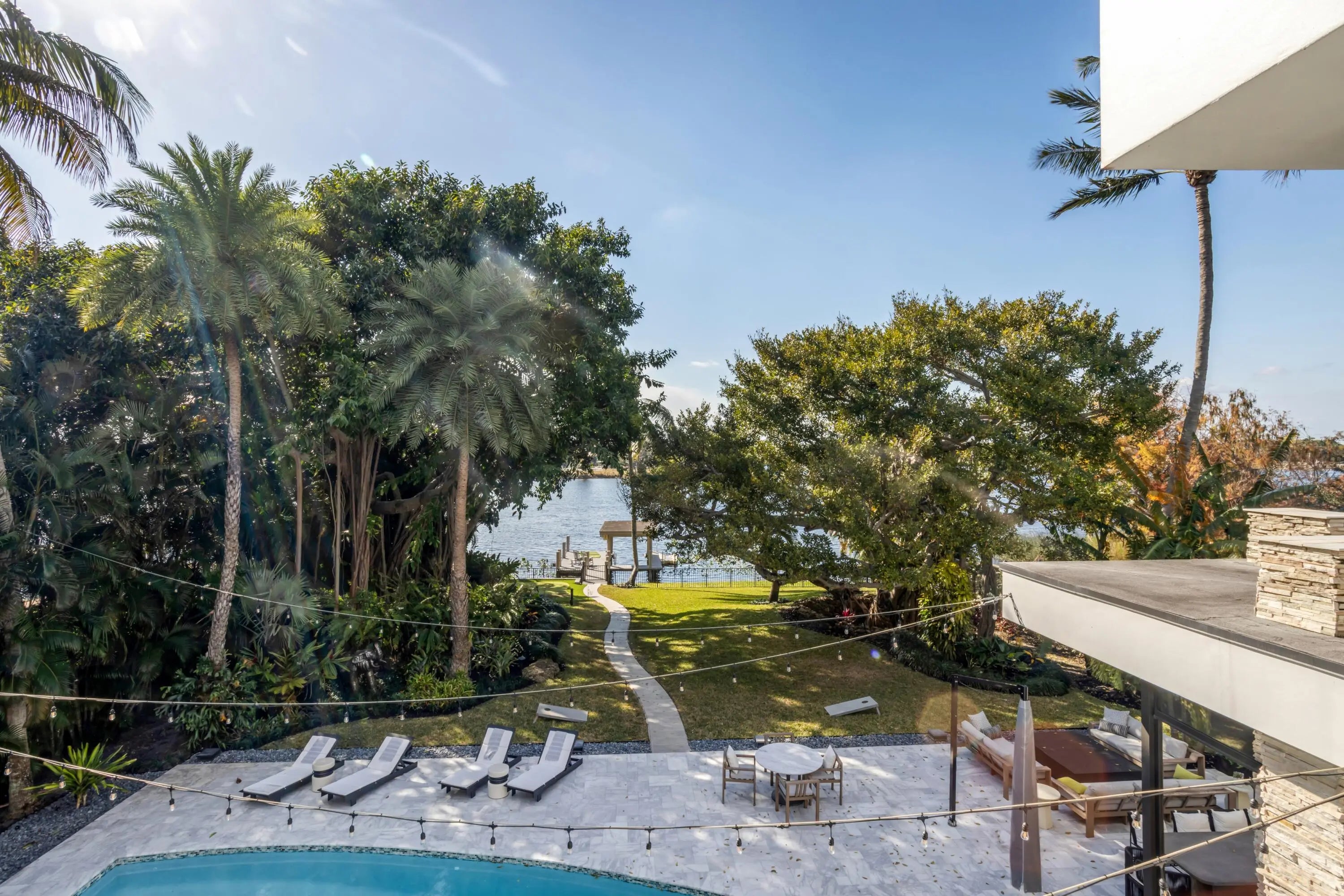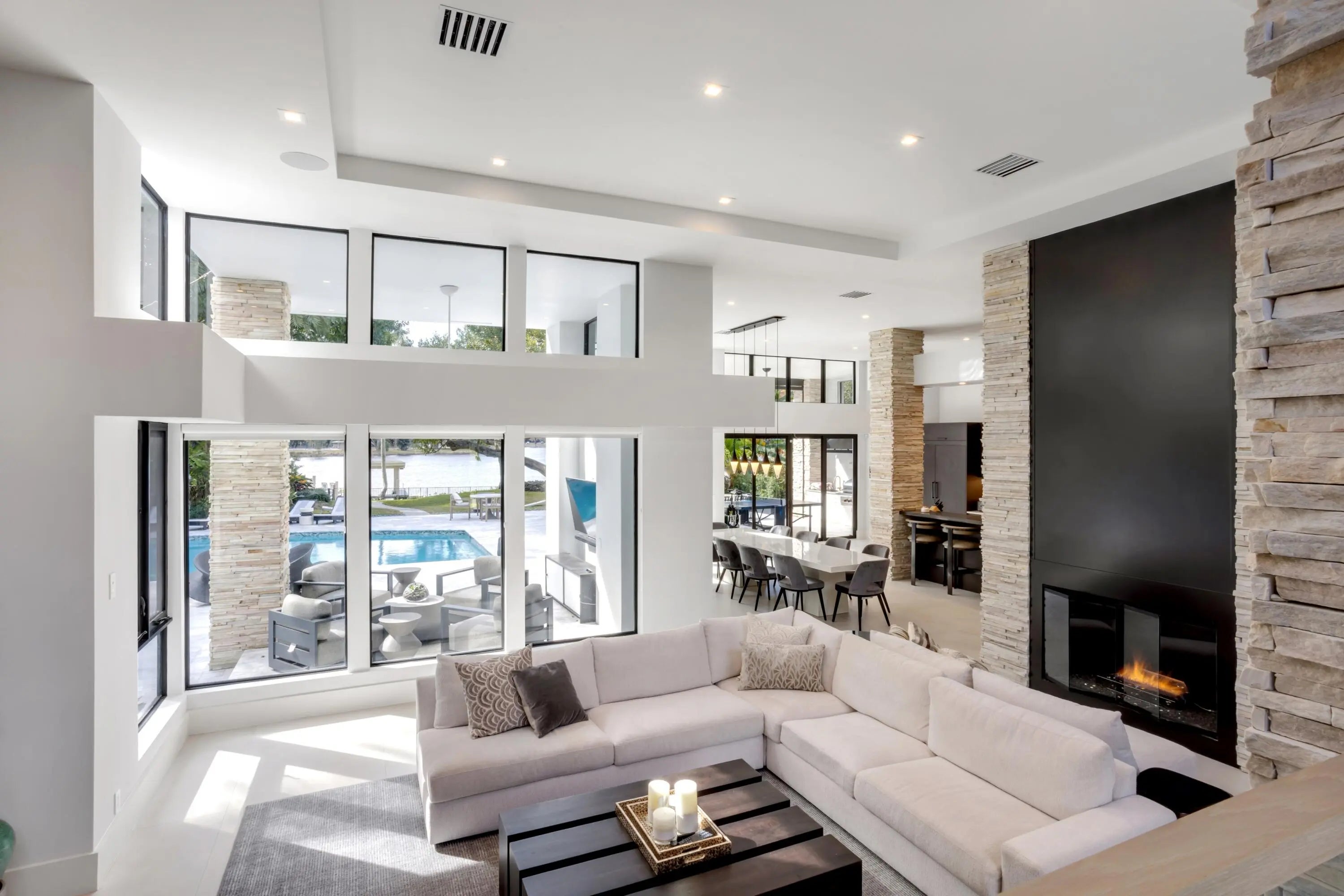 On nearly one acre with 110+/- feet of direct frontage on Lake Ida, this rare architectural statement estate, inspired by the timeless design philosophy of Frank Lloyd Wright, blends striking stacked-stone columns and accents with walls of glass creating one of the most distinctive waterfront offerings in Delray Beach. Designed by Randall Stofft to elicit a light-filled breezy vibe and a chic sophisticated sensibility, details of the stunning Contemporary-Mid-Century-style estate, with five bedrooms and 6,828+/- total square feet, include soaring ceilings, large-format tile and wood flooring, new LED lighting, and a new wine room complete with its own cooling system and stacked-stone finishes.