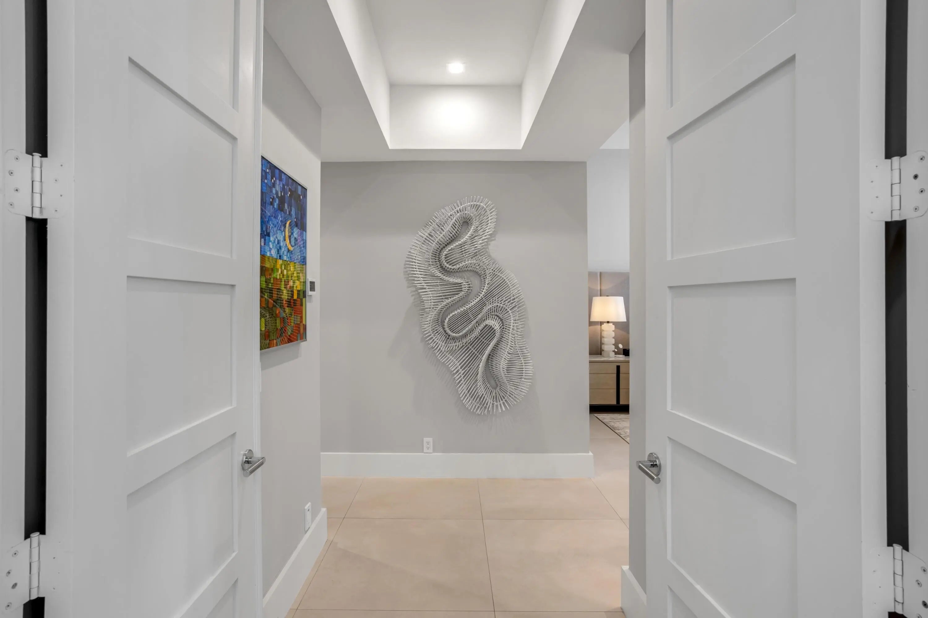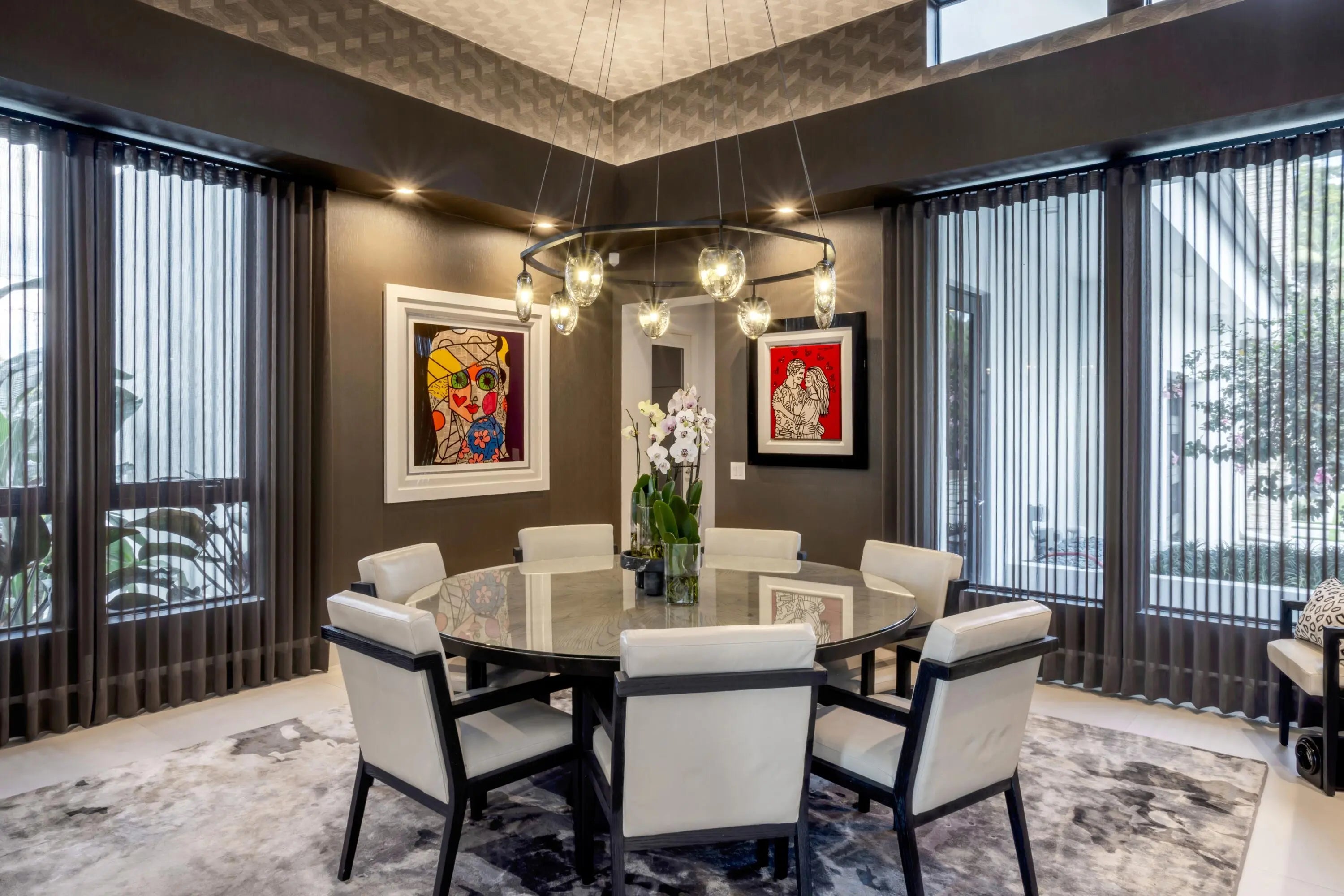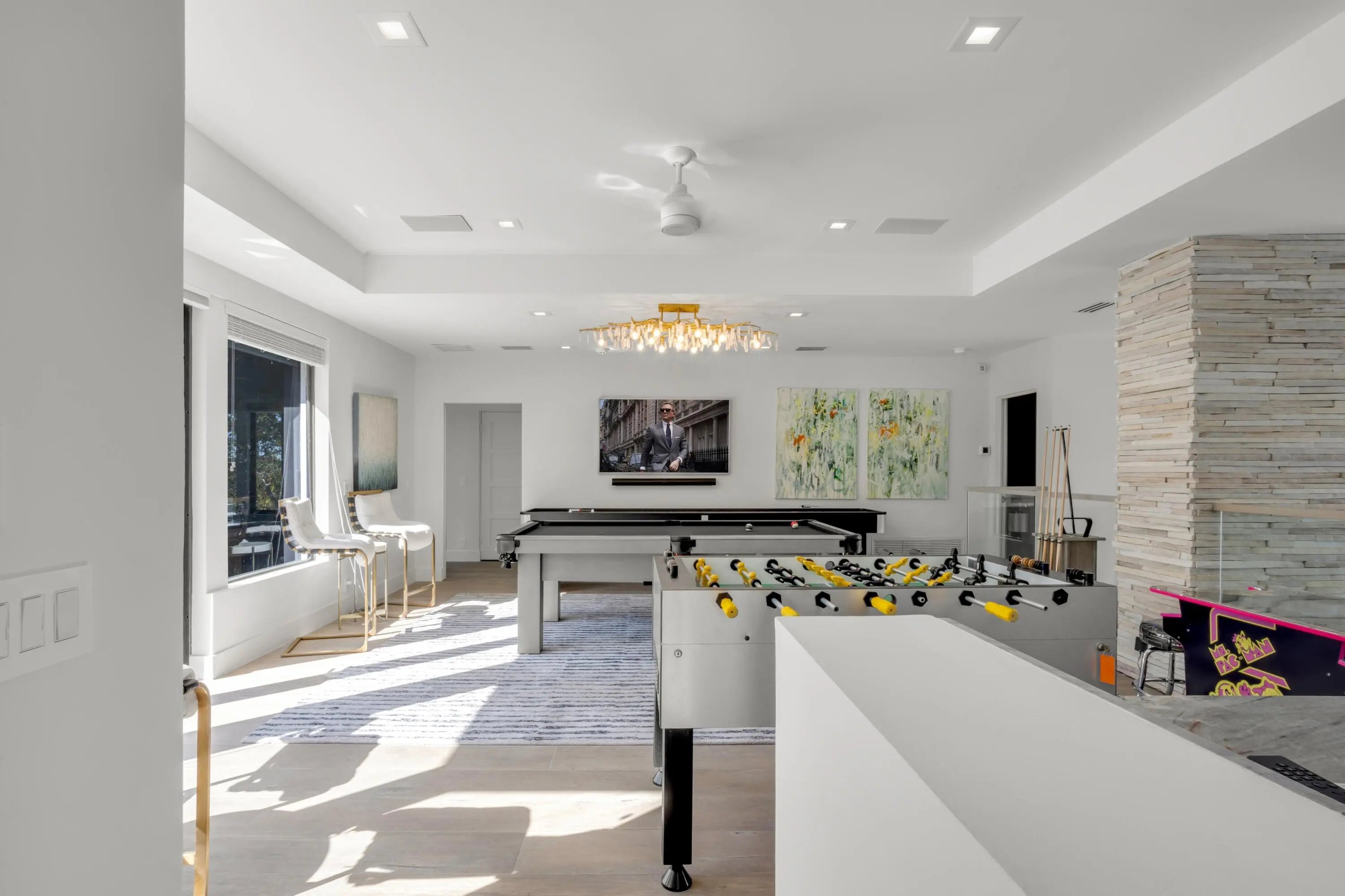 On nearly one acre with 110+/- feet of direct frontage on Lake Ida, this rare architectural statement estate, inspired by the timeless design philosophy of Frank Lloyd Wright, blends striking stacked-stone columns and accents with walls of glass creating one of the most distinctive waterfront offerings in Delray Beach. Designed by Randall Stofft to elicit a light-filled breezy vibe and a chic sophisticated sensibility, details of the stunning Contemporary-Mid-Century-style estate, with five bedrooms and 6,828+/- total square feet, include soaring ceilings, large-format tile and wood flooring, new LED lighting, and a new wine room complete with its own cooling system and stacked-stone finishes.